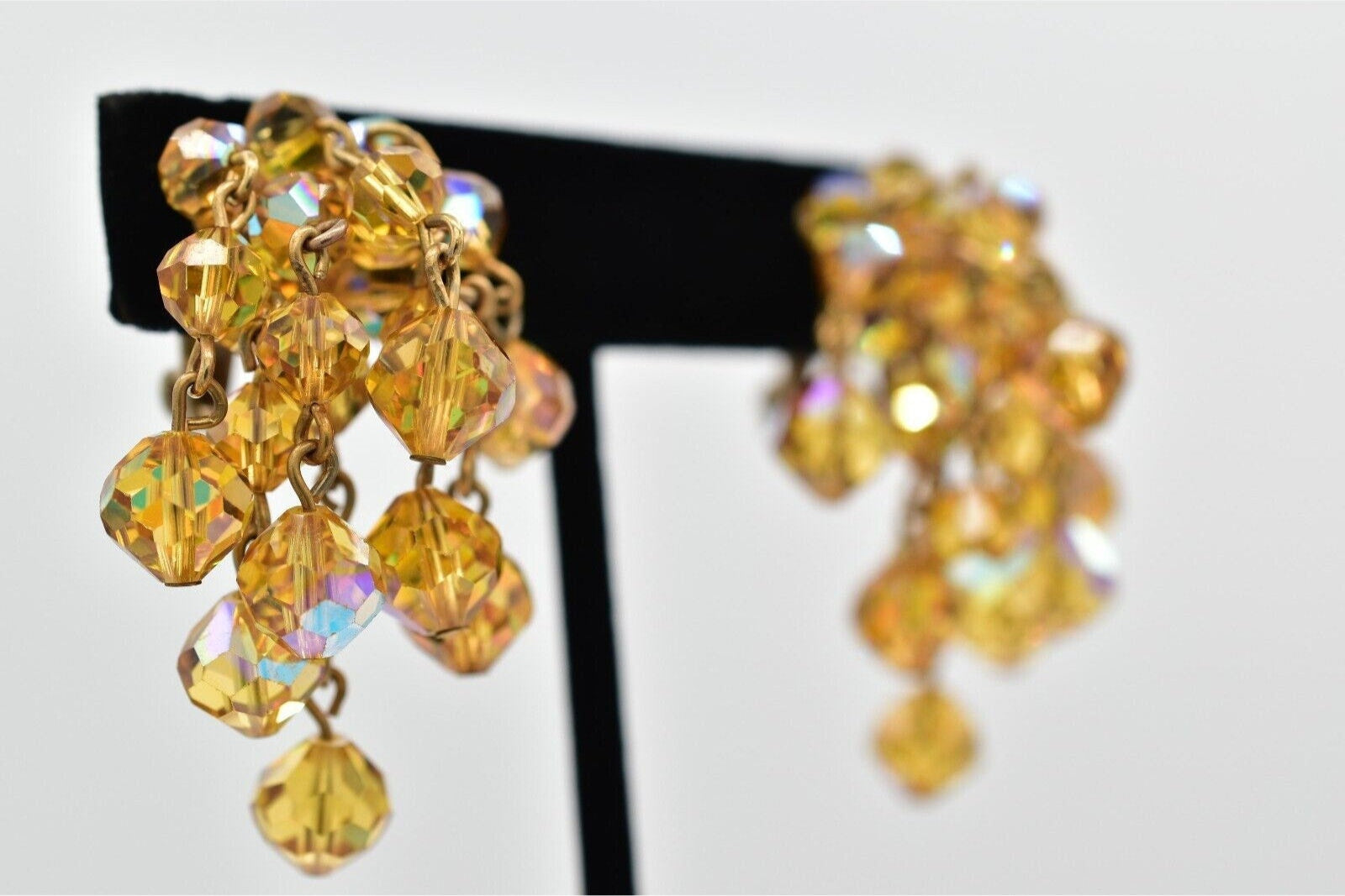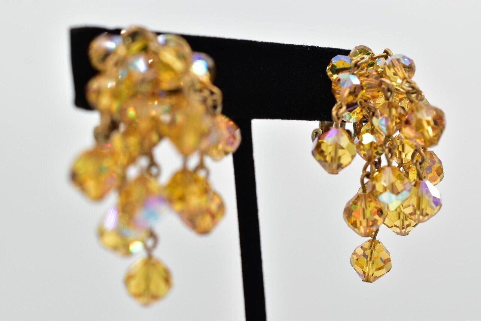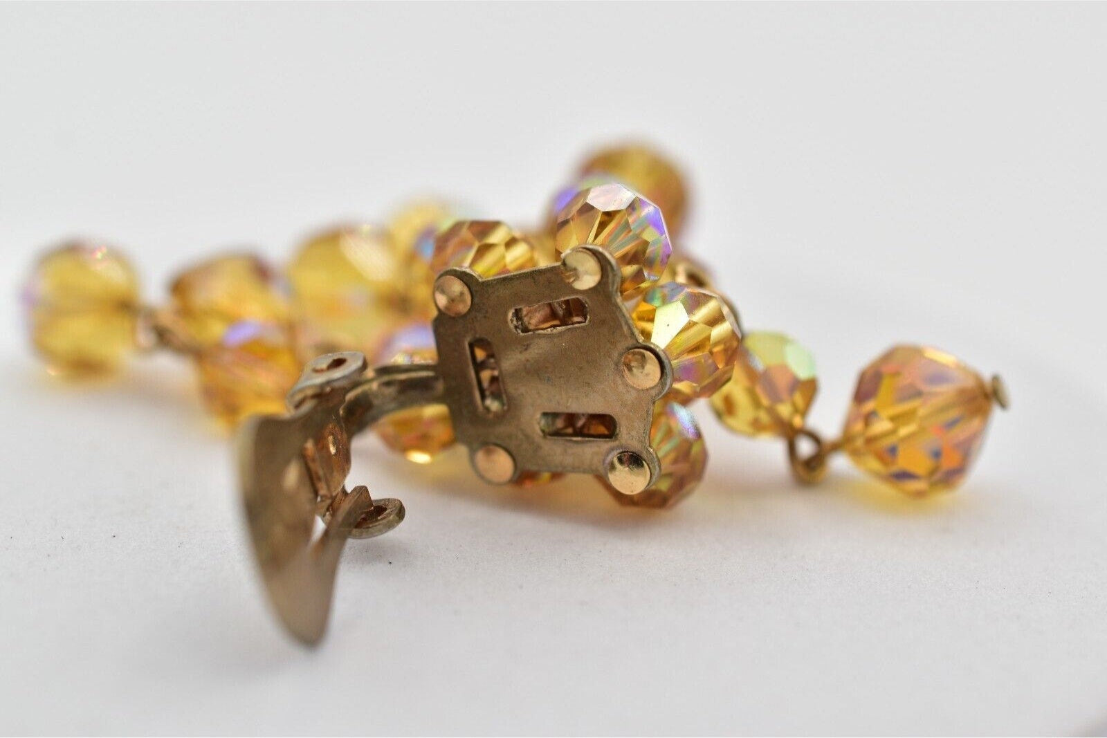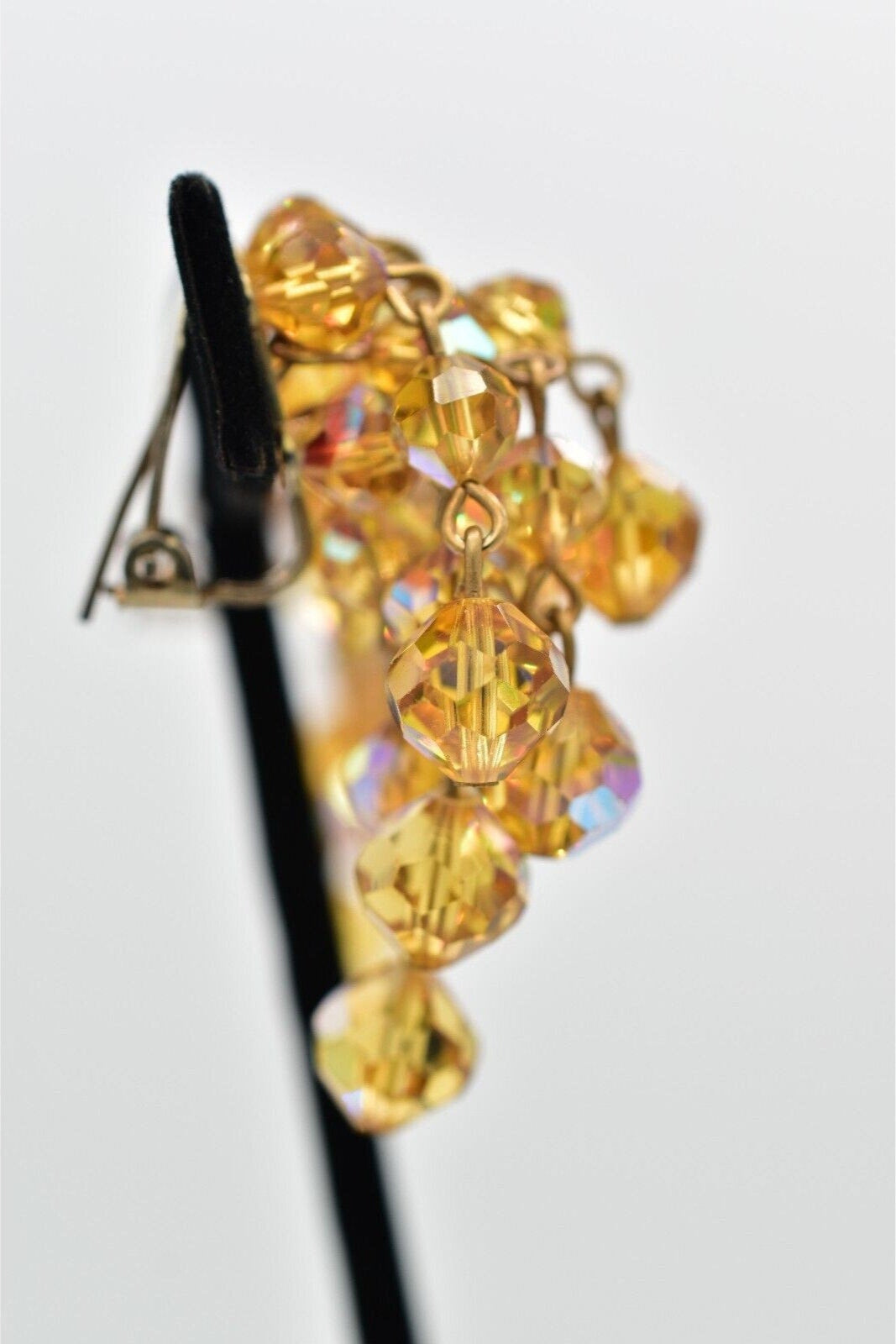 Vintage Laguna earrings with dangling chains of orange Austrian crystals.