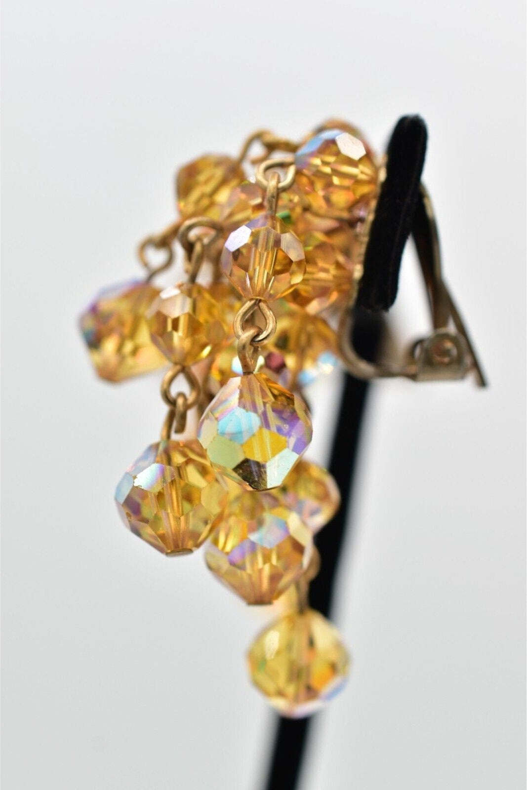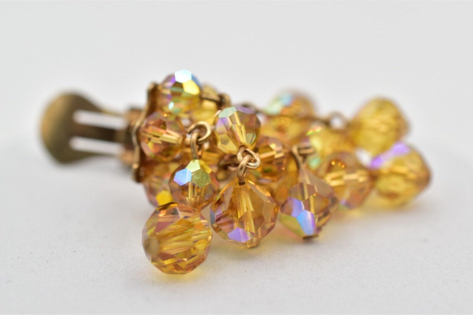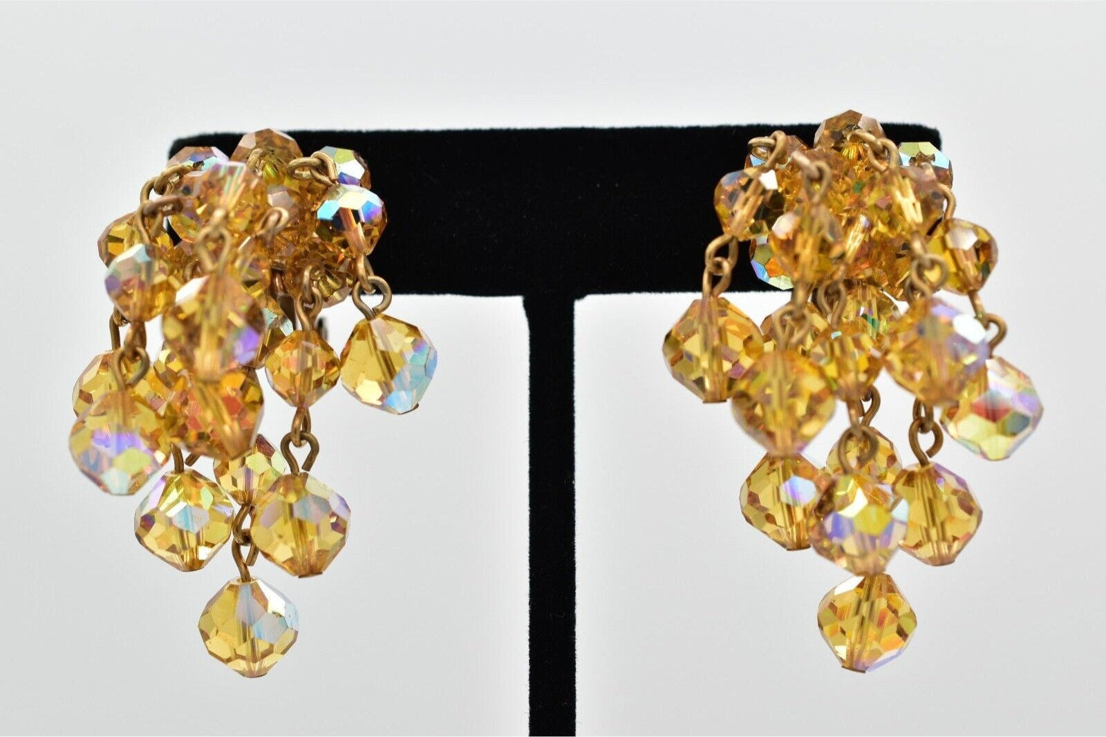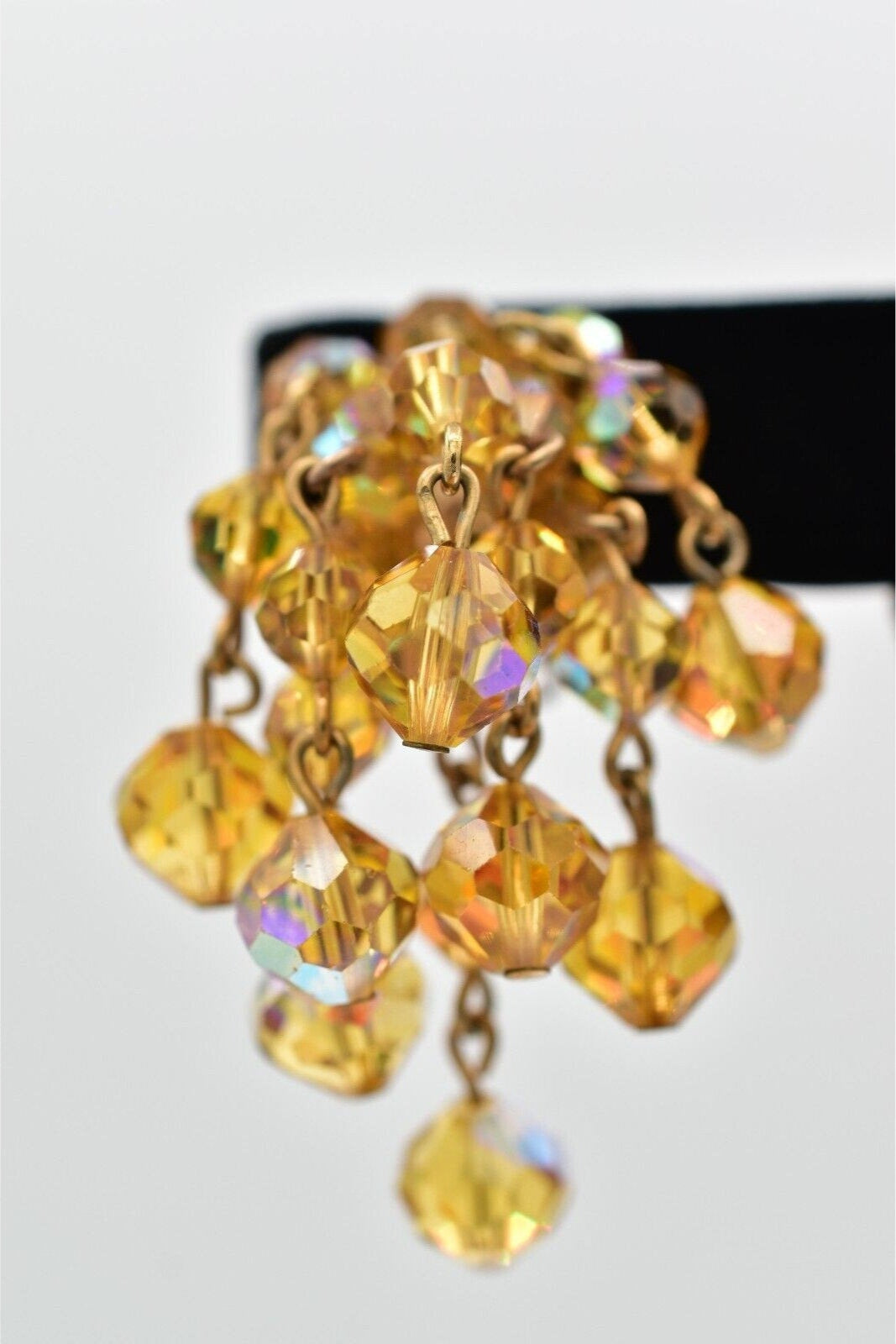 Vintage Laguna earrings with dangling chains of orange Austrian crystals.