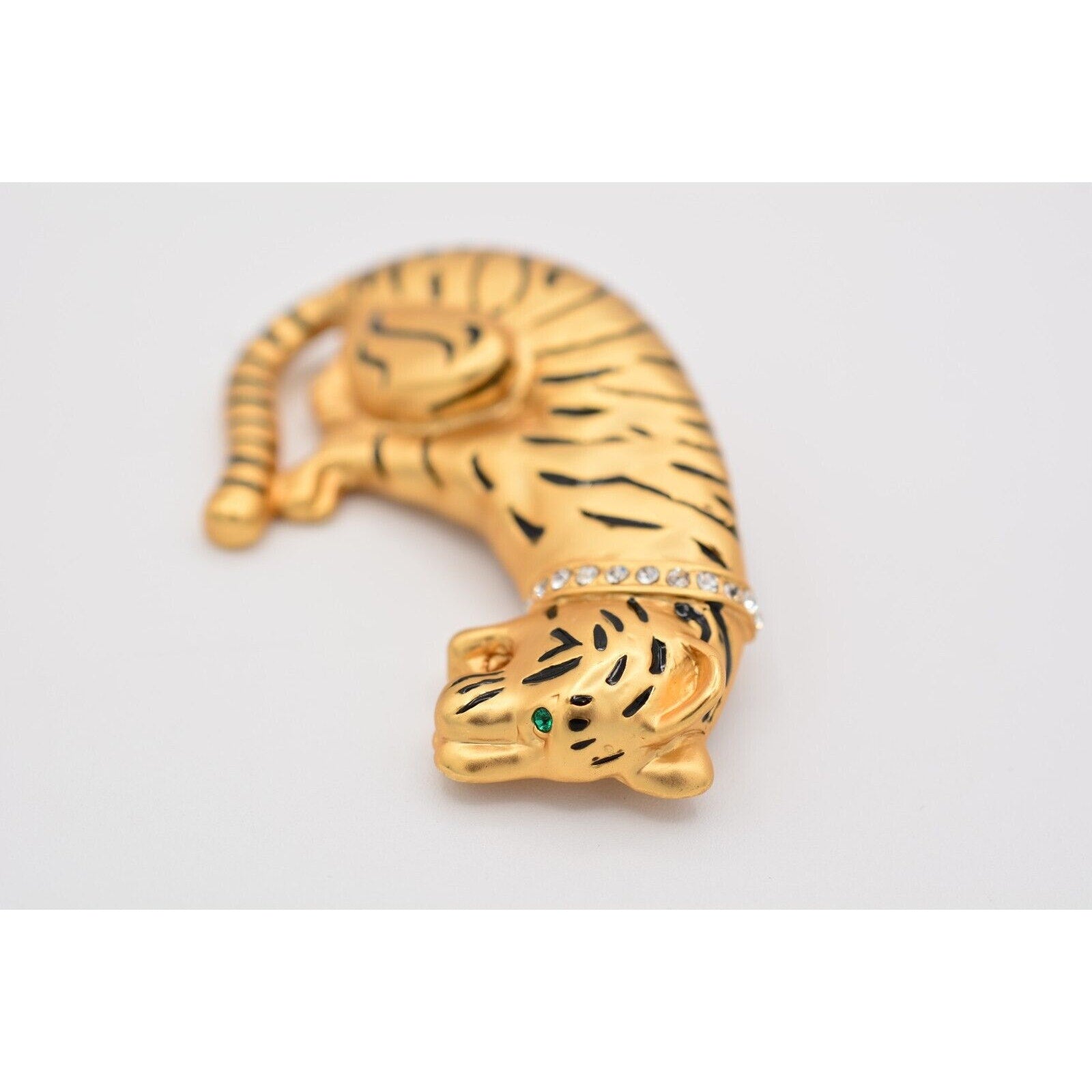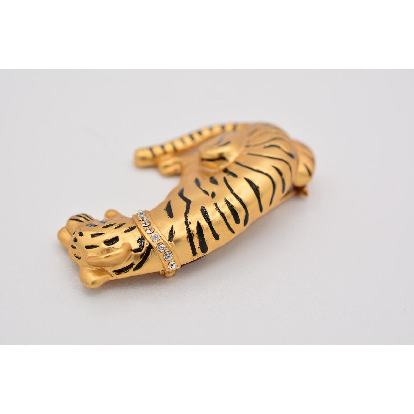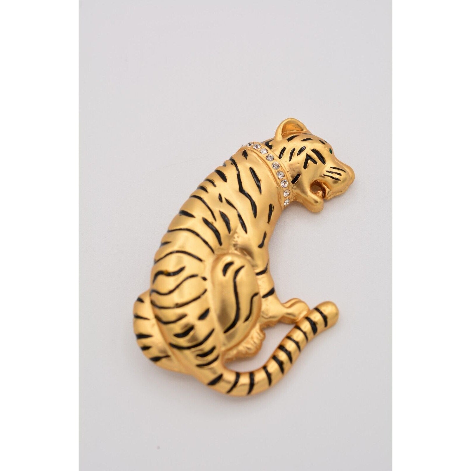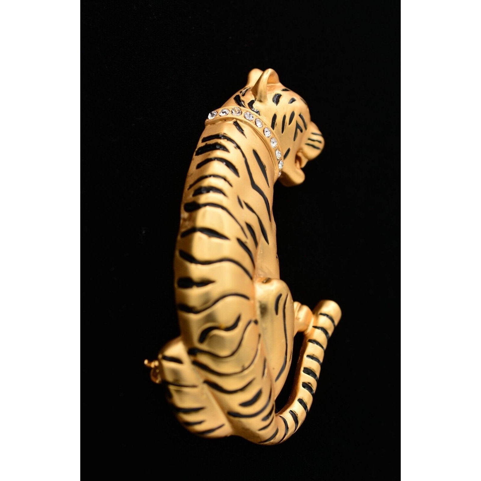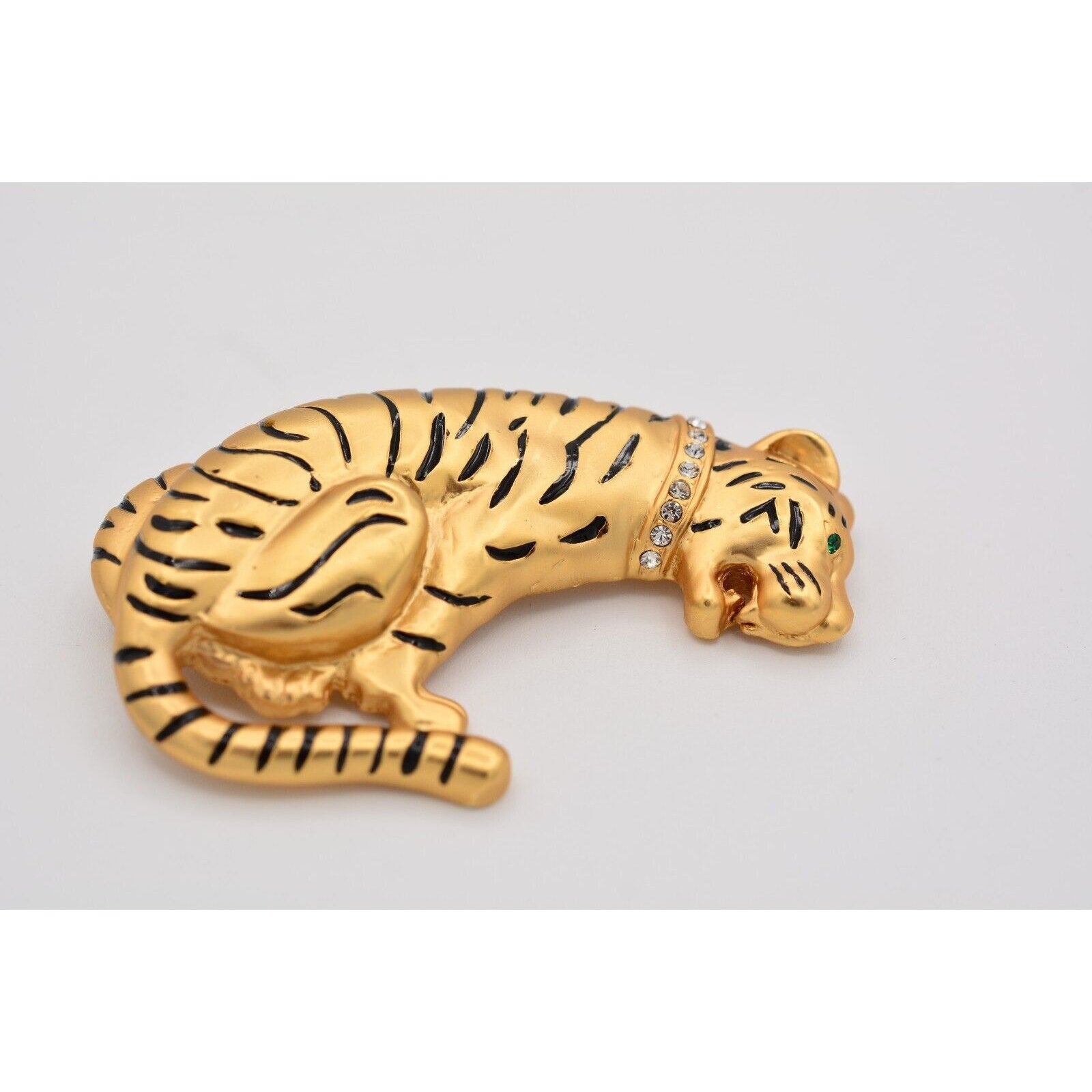 Heavy vintage tiger pin with a crystal collar and satin brushed gold finish.