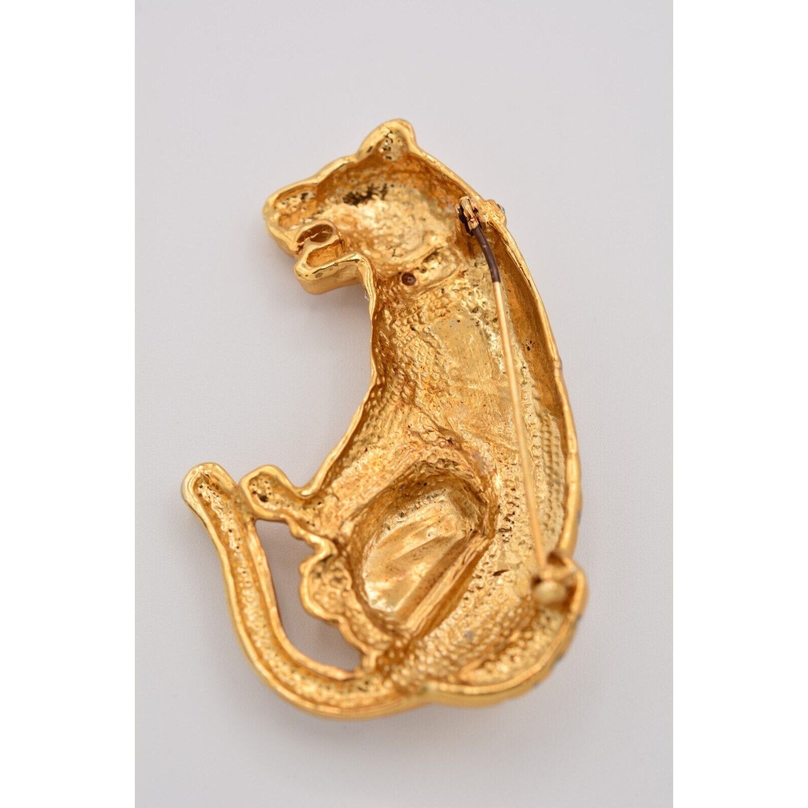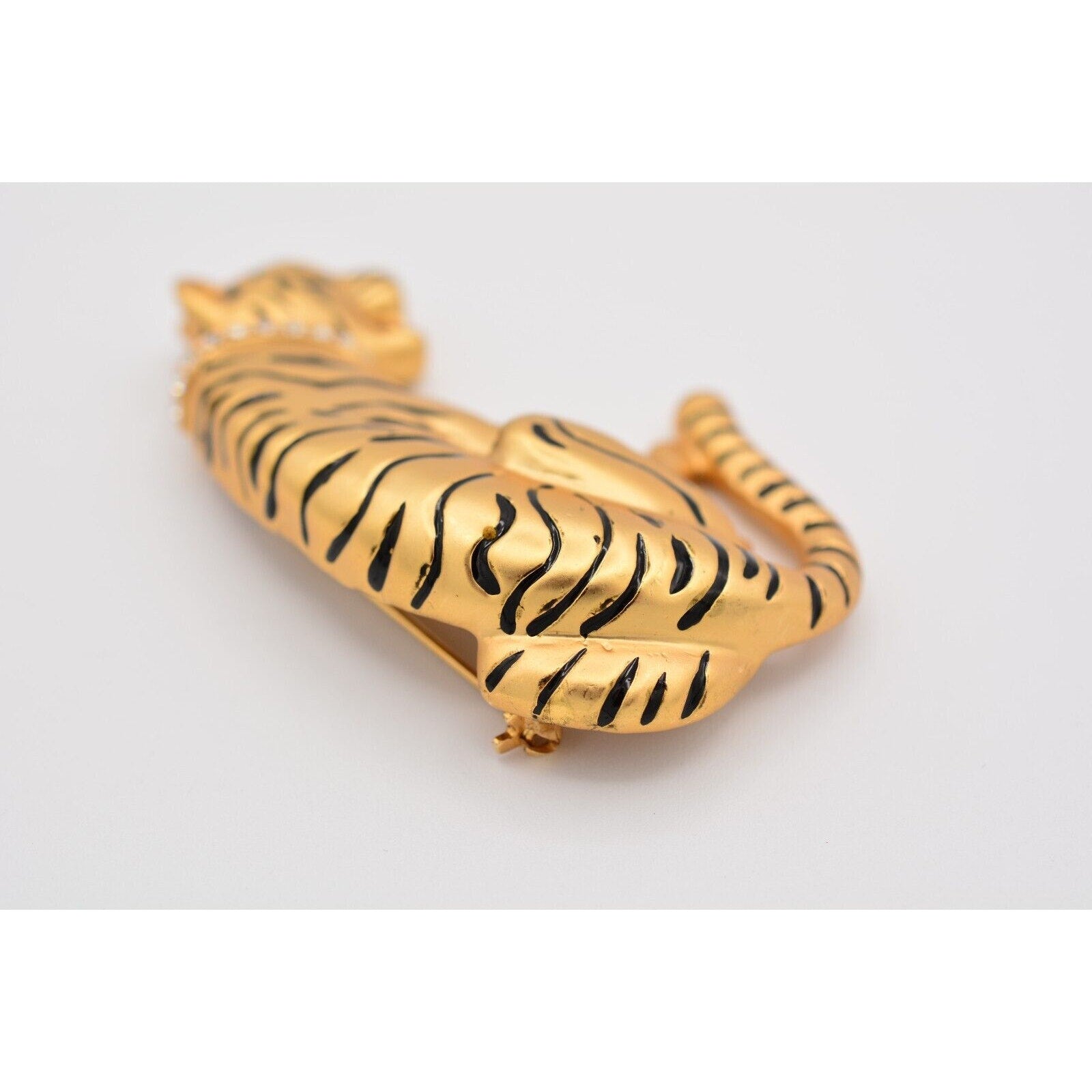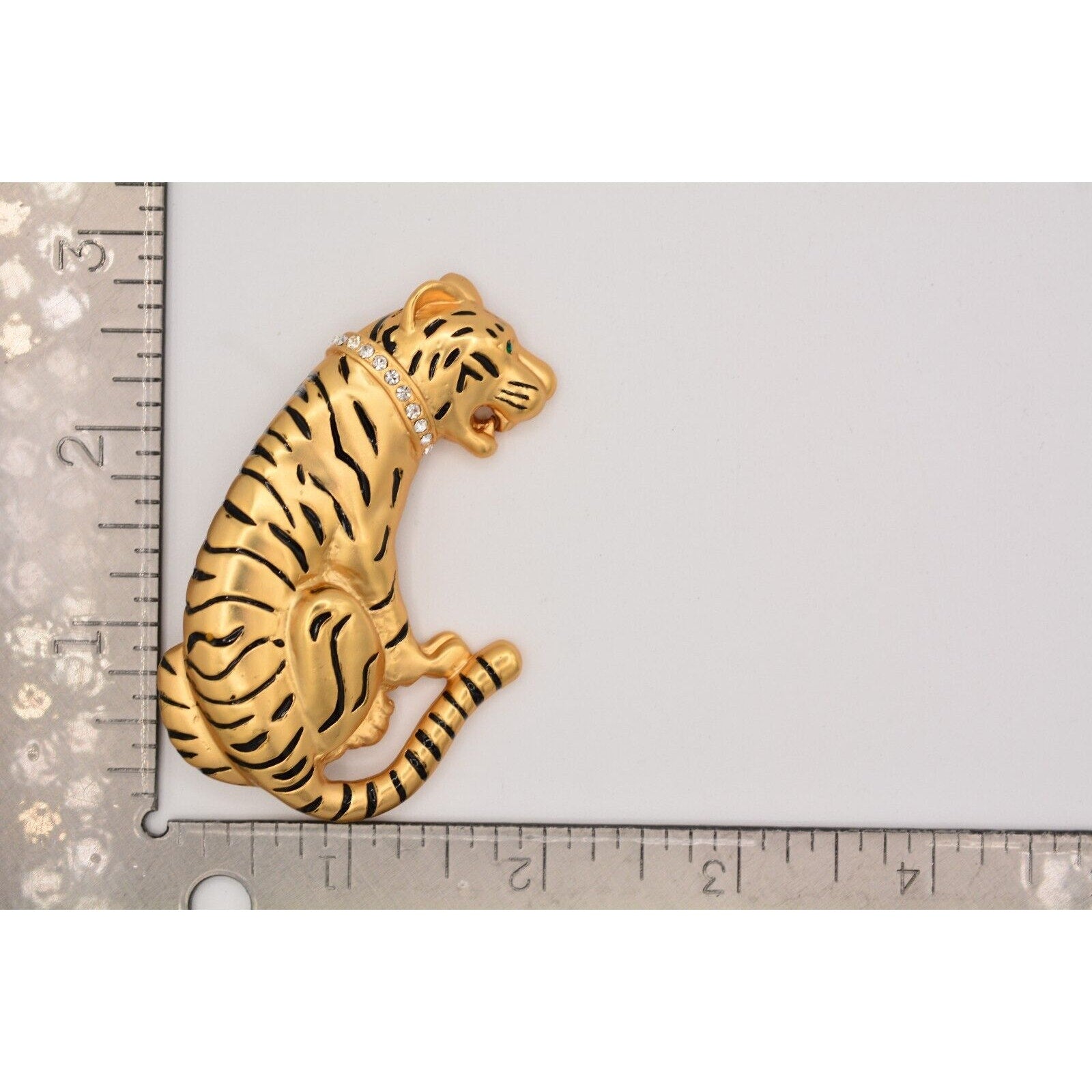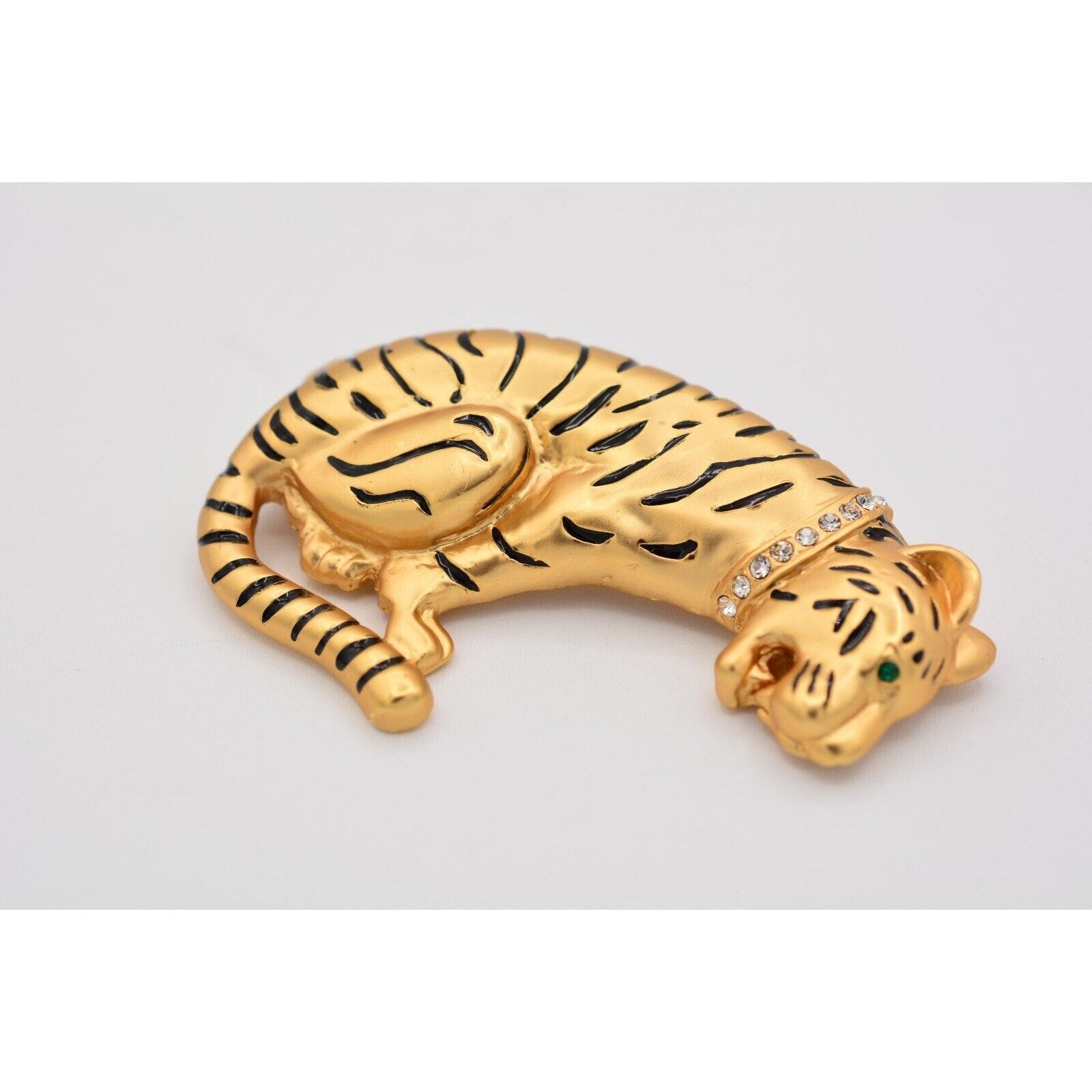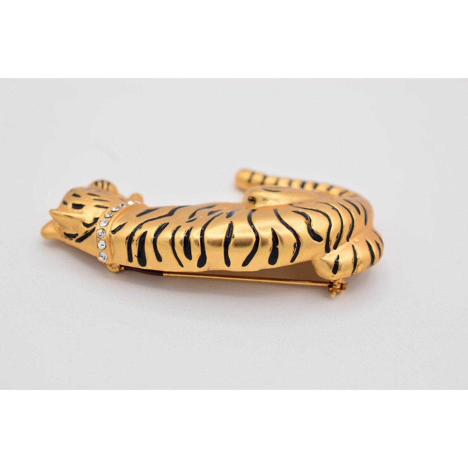 Heavy vintage tiger pin with a crystal collar and satin brushed gold finish.