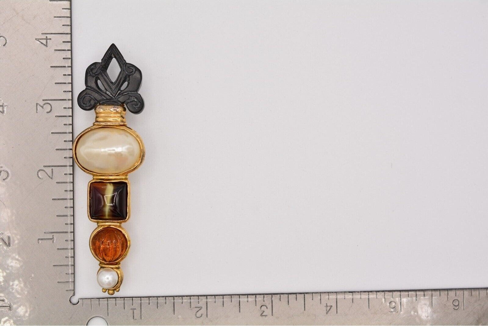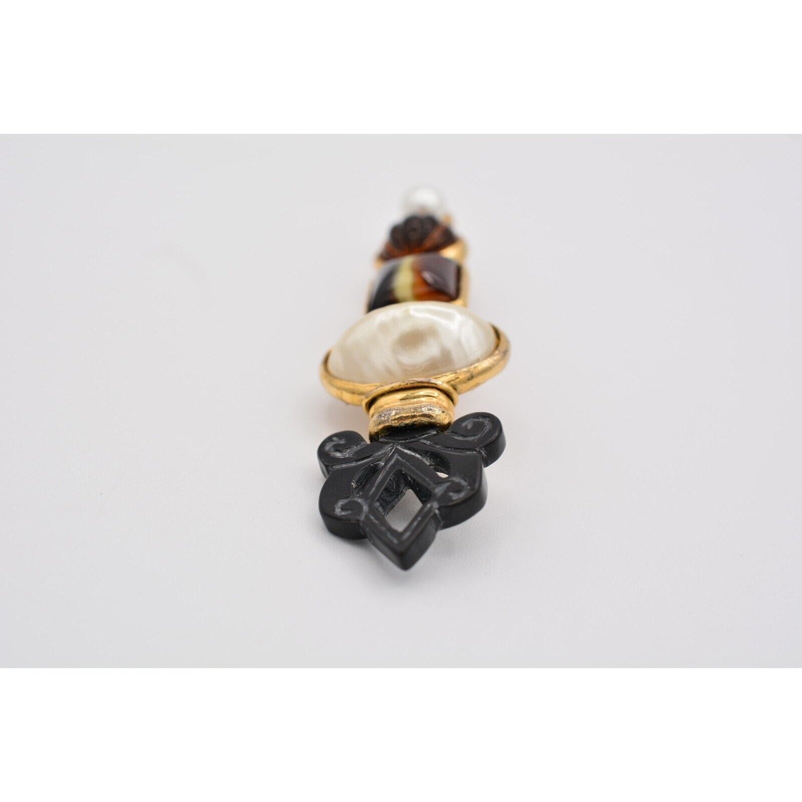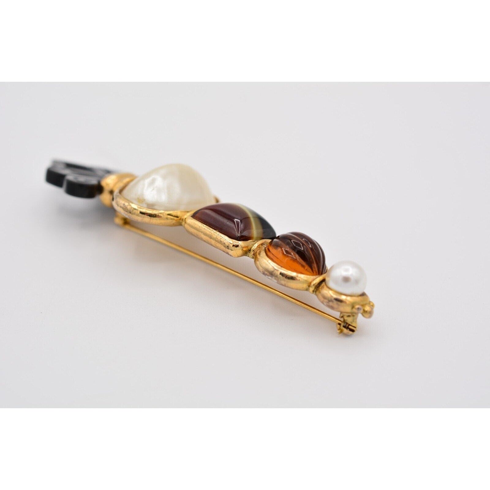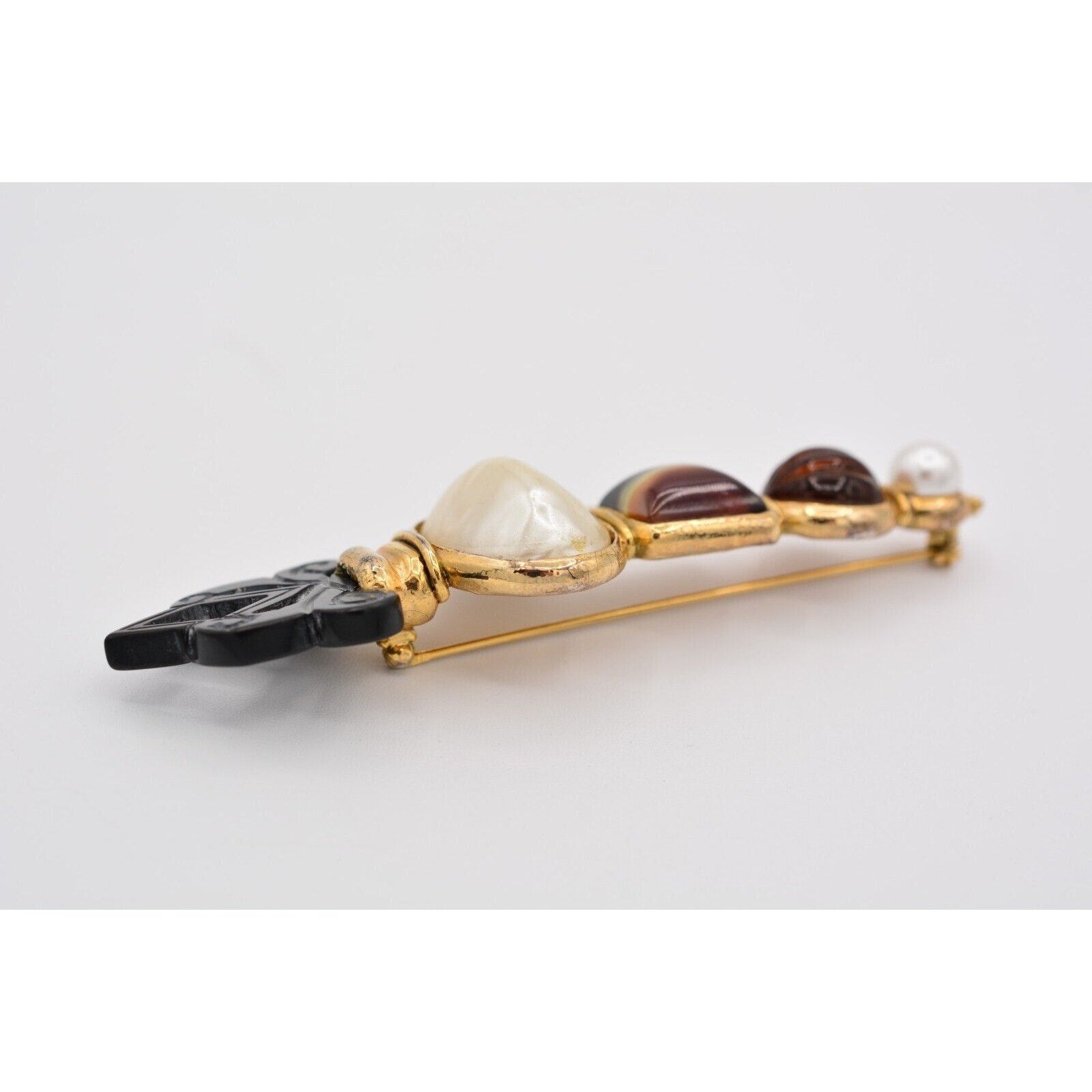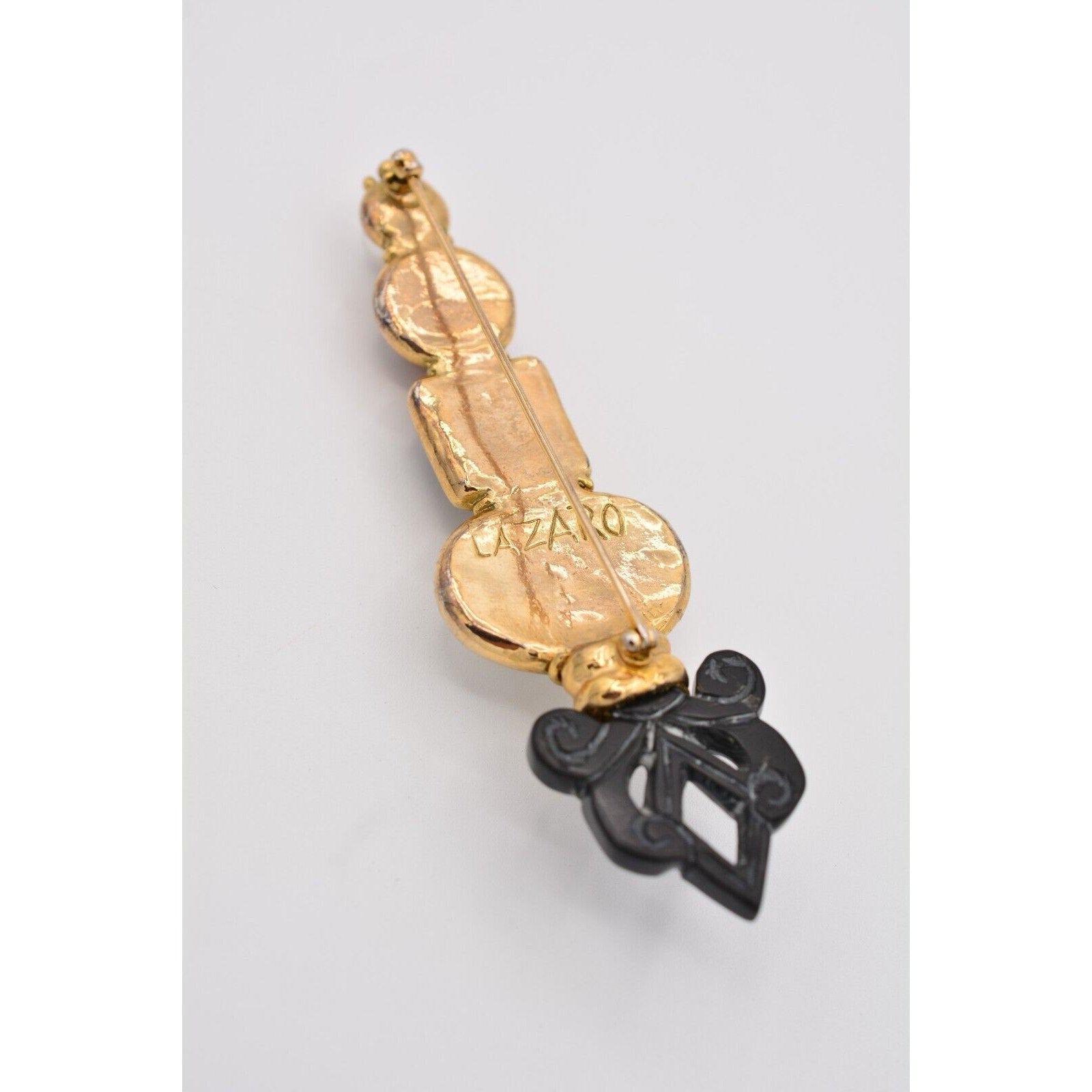 Striking vintage Lazaro statement brooch featuring layered cabochon stones, a sculptural black enamel crest top, and a bold gold-tone body. A dramatic 1980s designer piece showcasing Lazaro’s signature mixed-material, architectural style.
