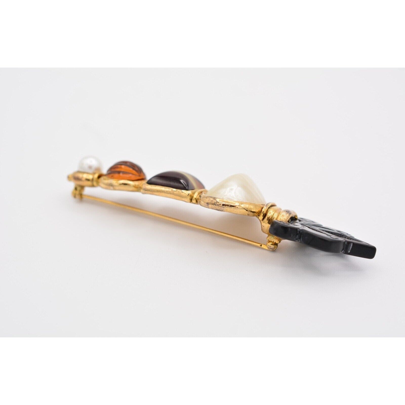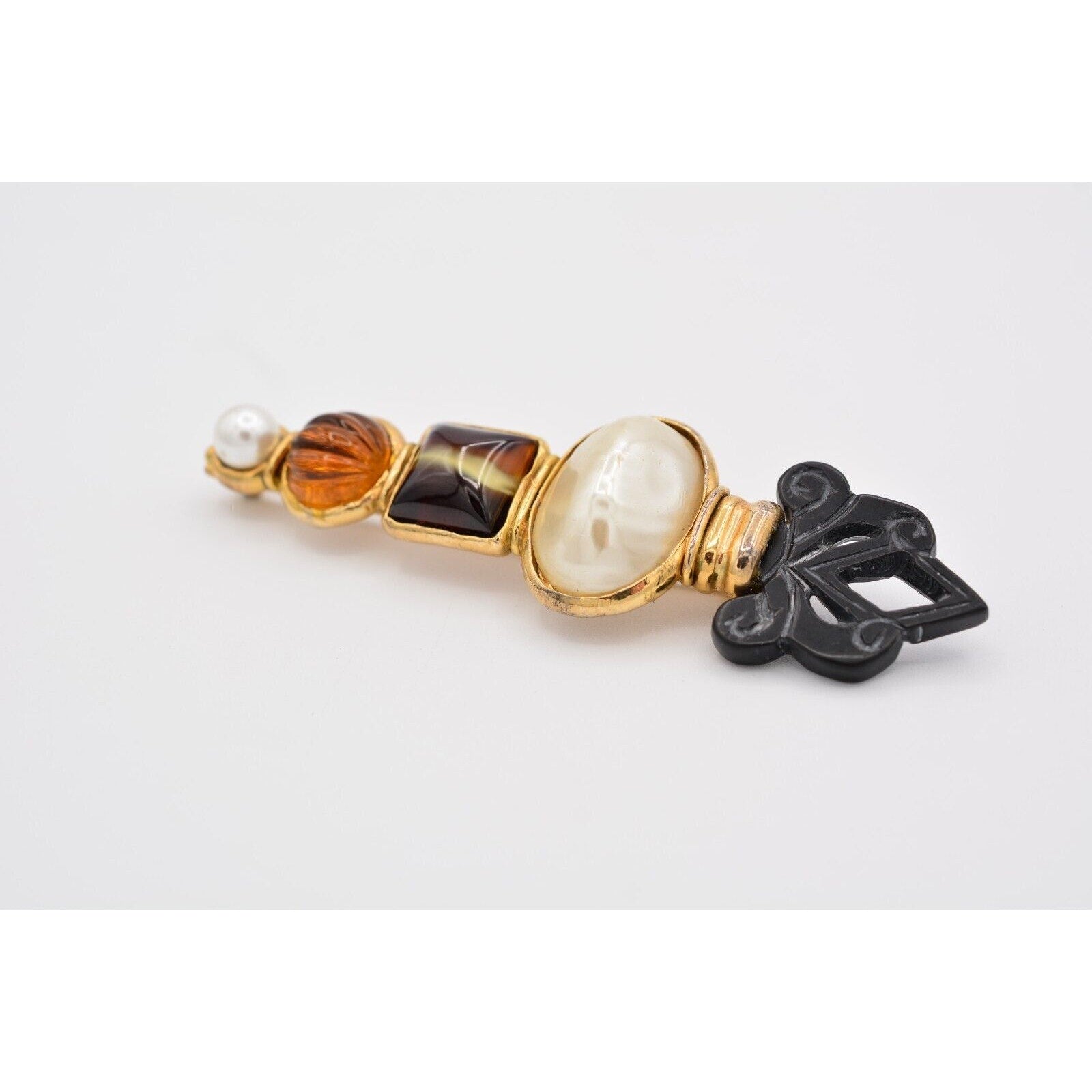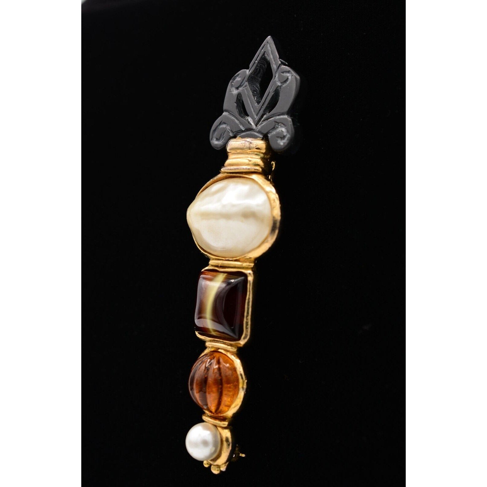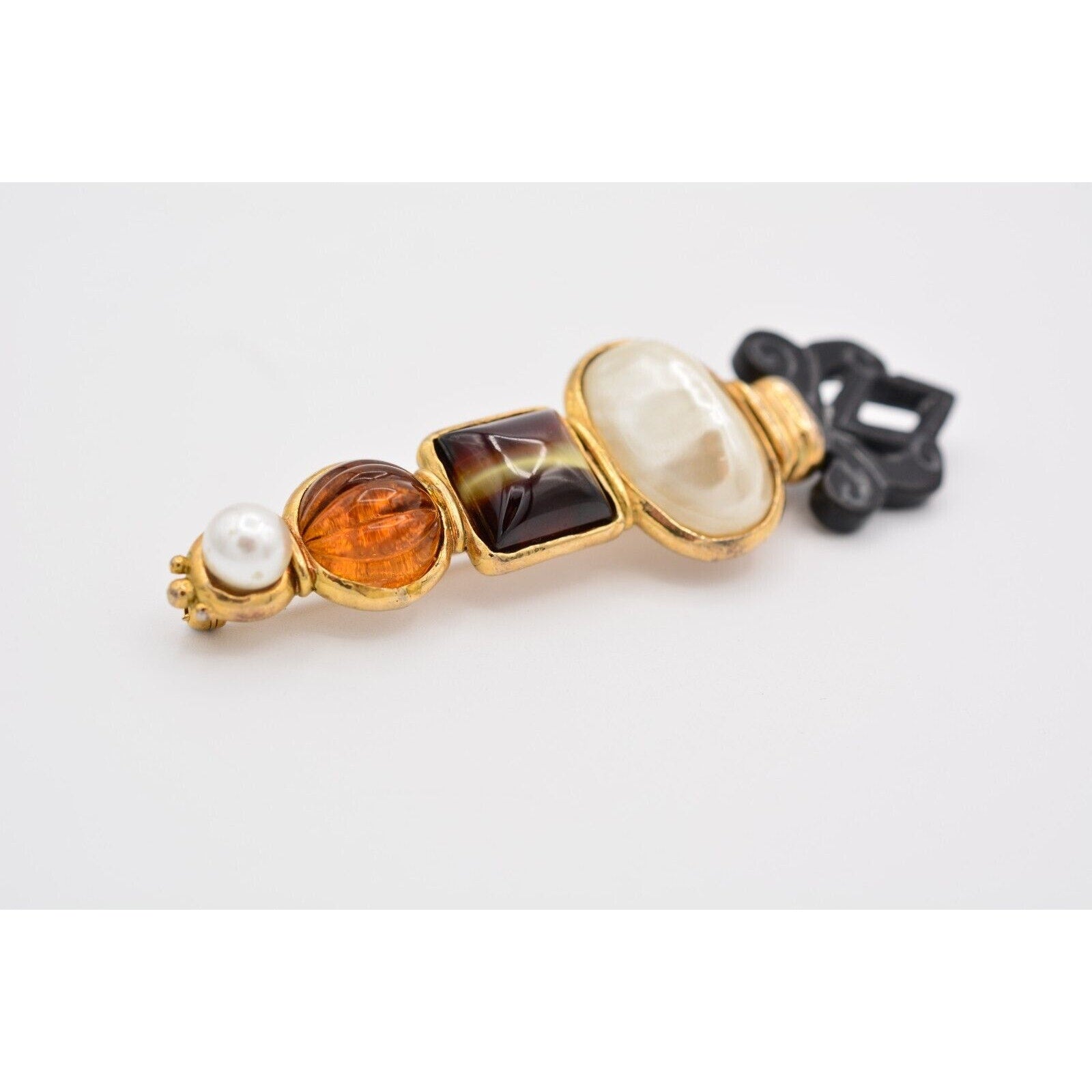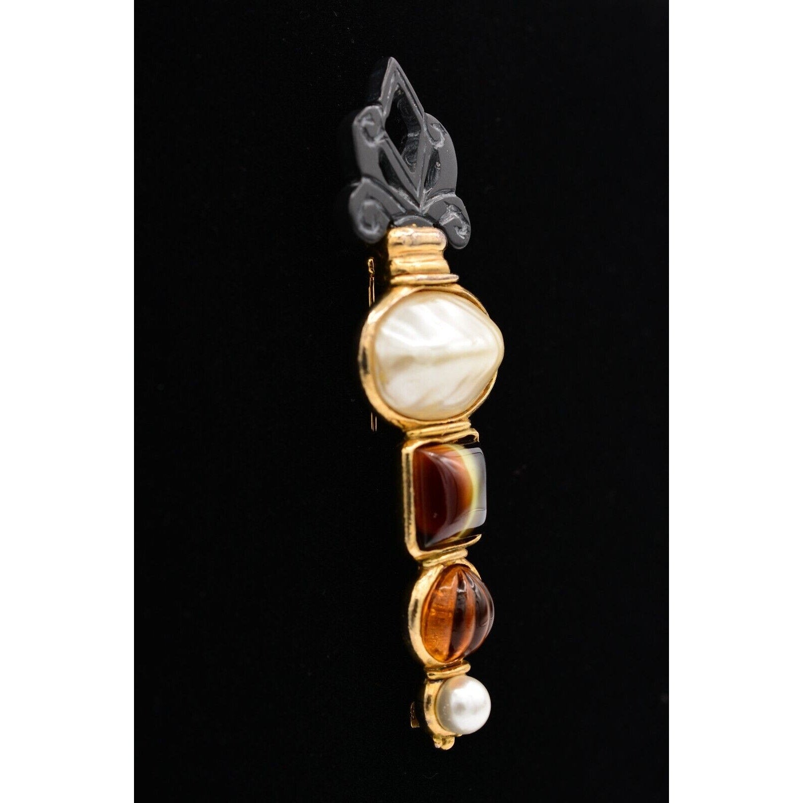 Striking vintage Lazaro statement brooch featuring layered cabochon stones, a sculptural black enamel crest top, and a bold gold-tone body. A dramatic 1980s designer piece showcasing Lazaro’s signature mixed-material, architectural style.