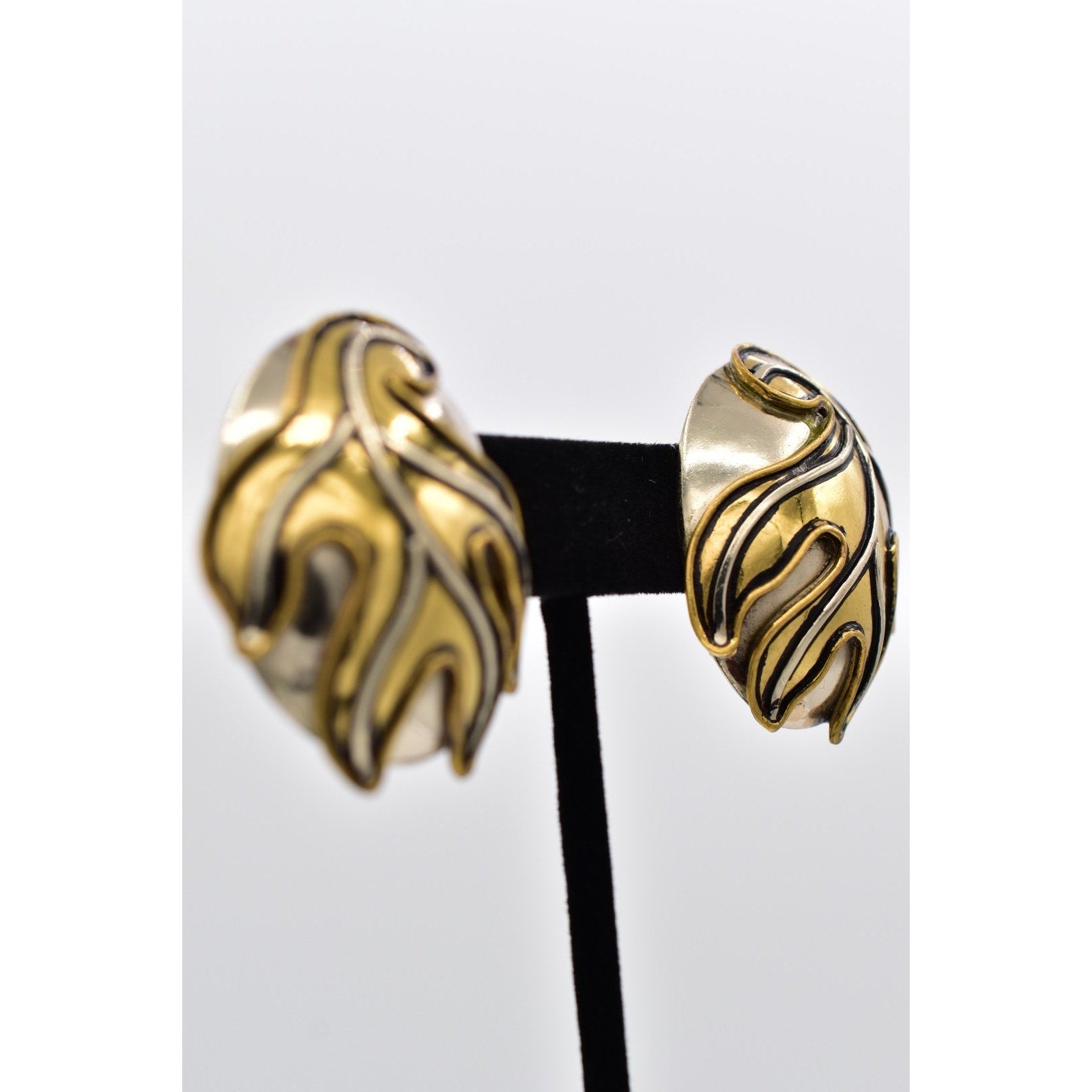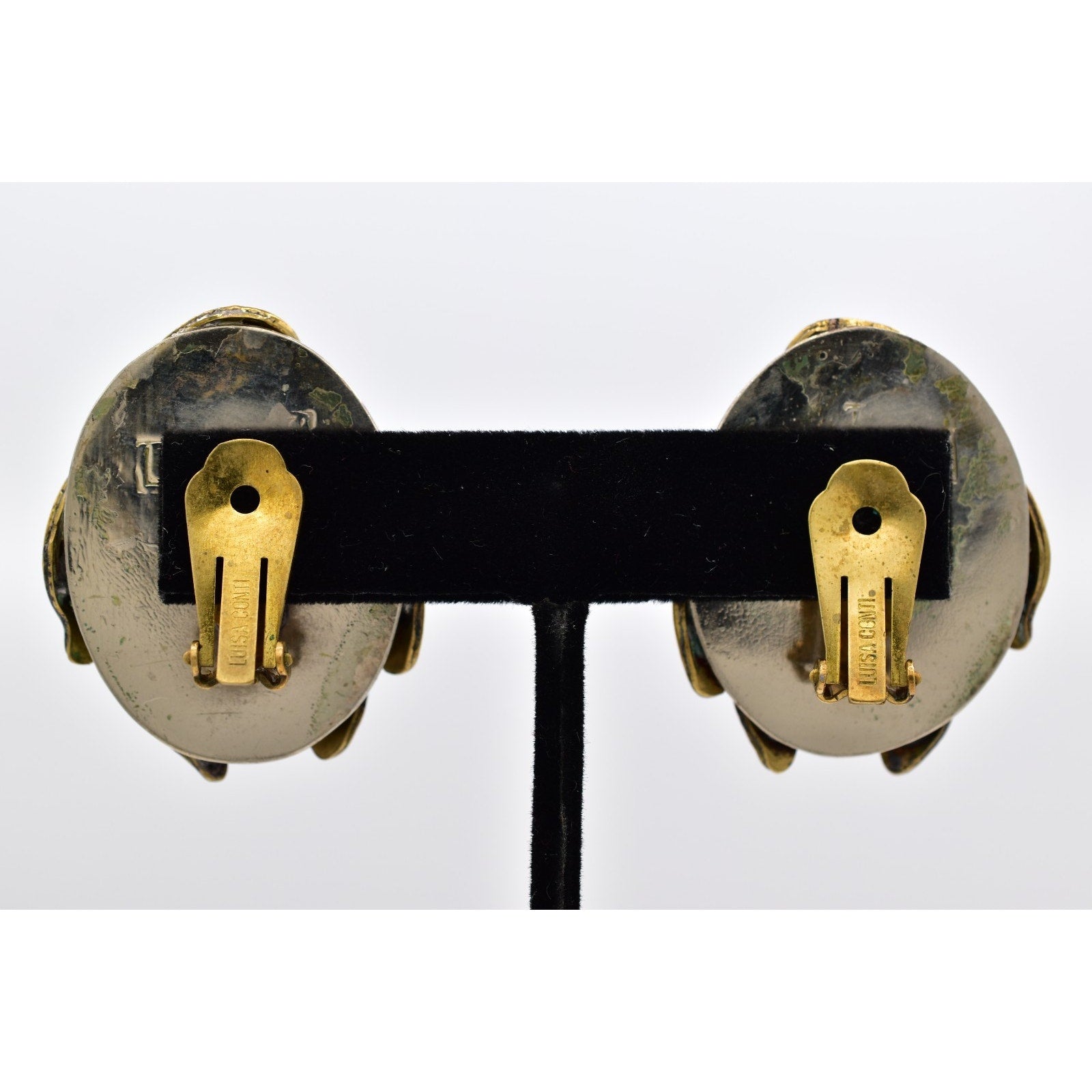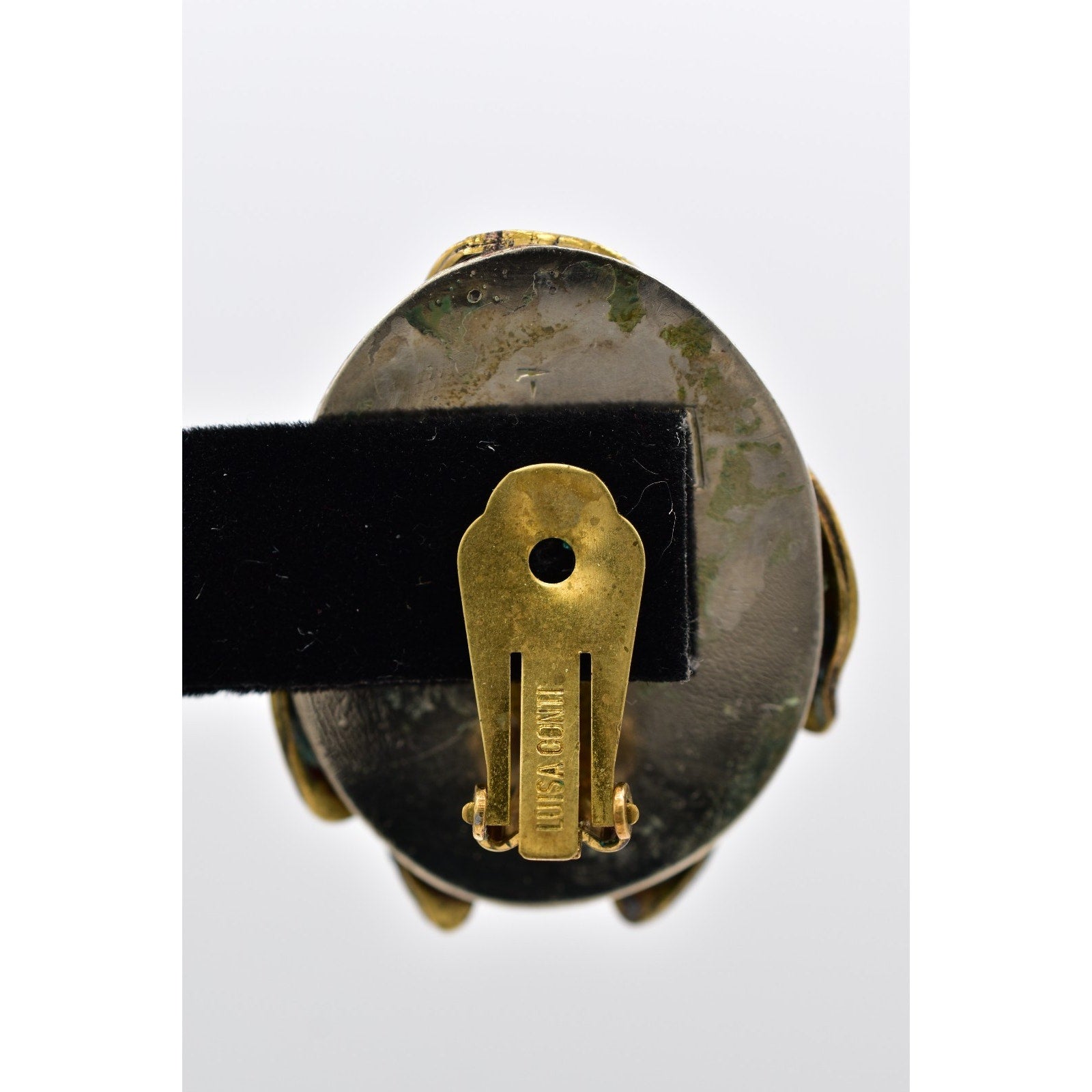 Sculptural vintage clip earrings by Luisa Conti, featuring bold gold-tone leaf curves layered over a luminous domed base for an elevated, architectural statement.