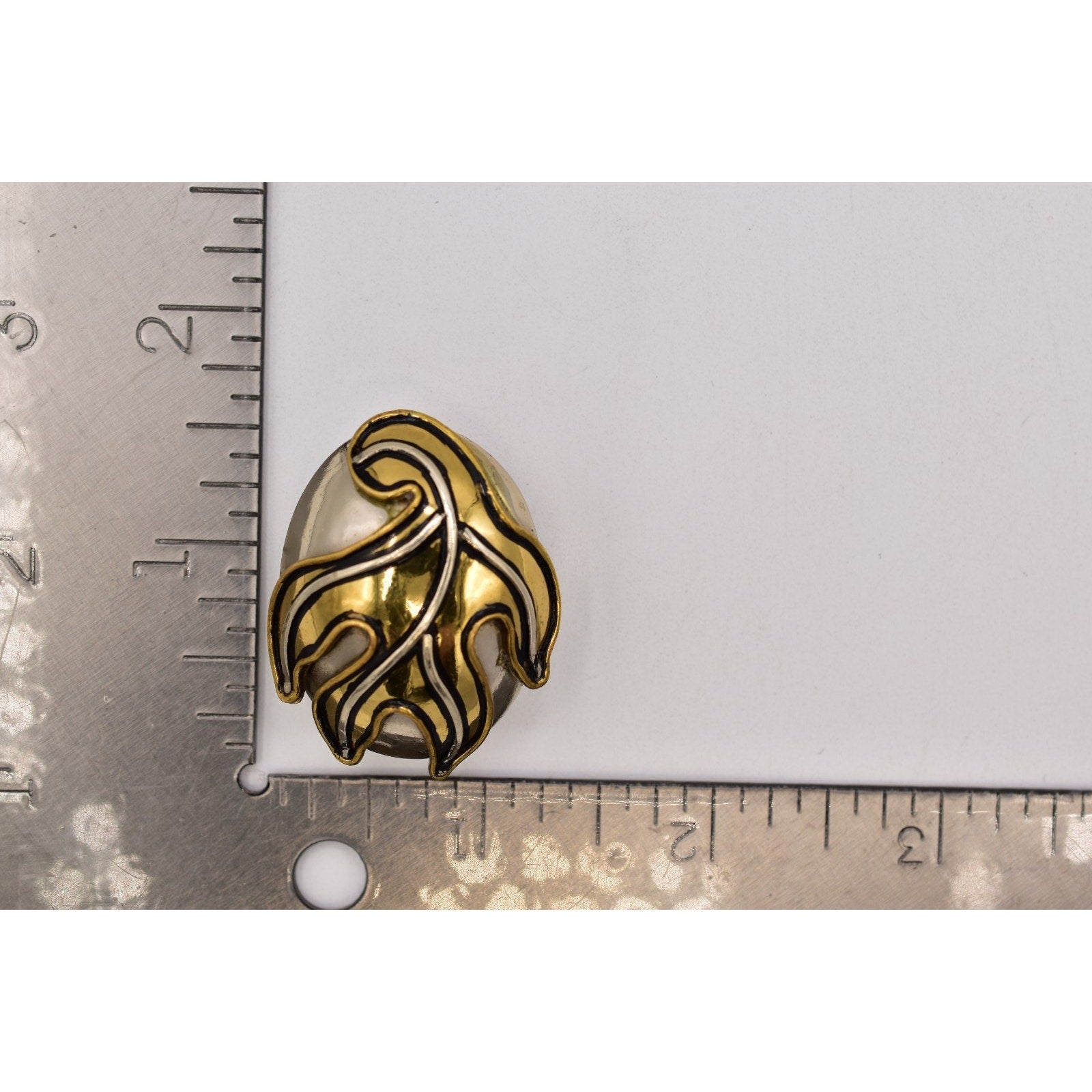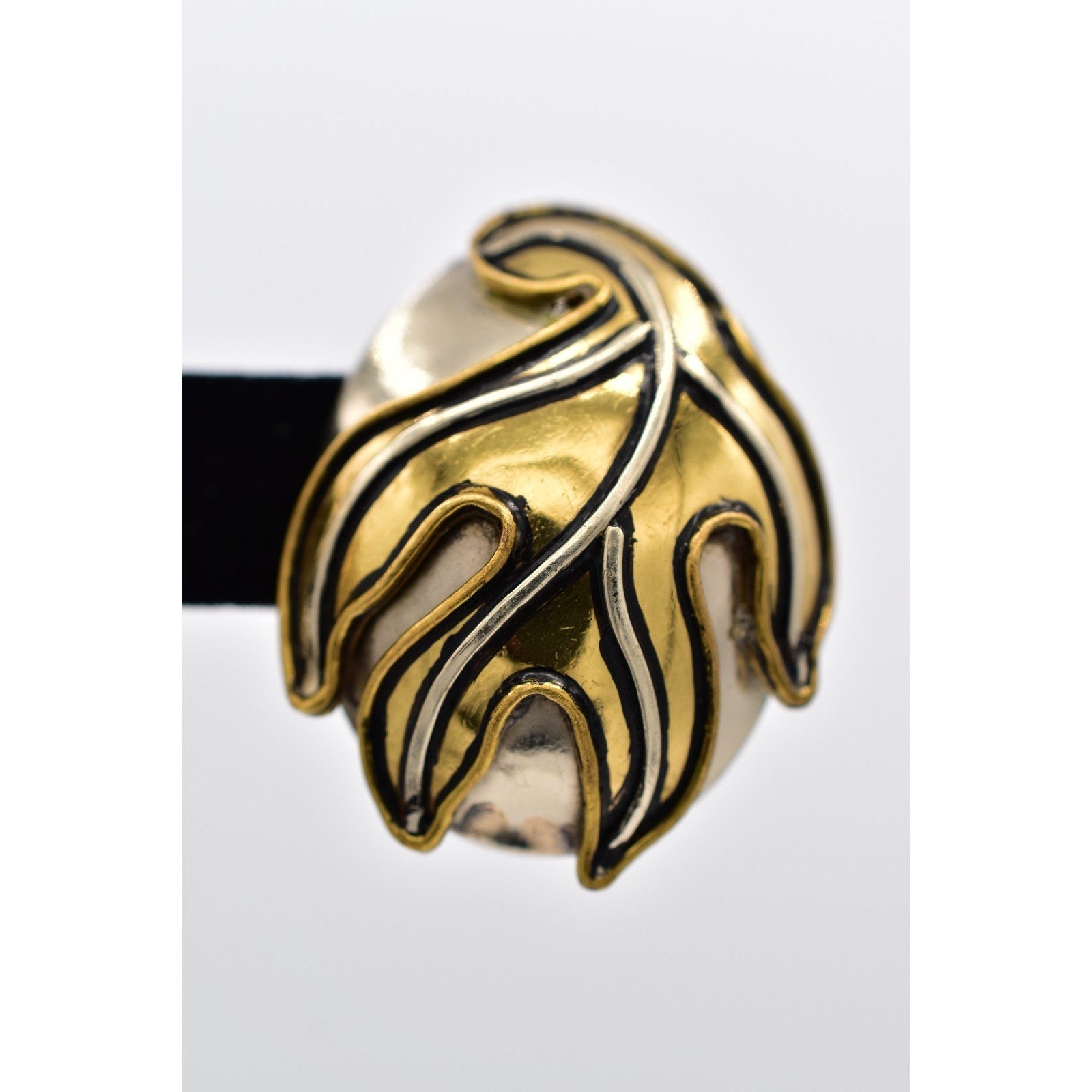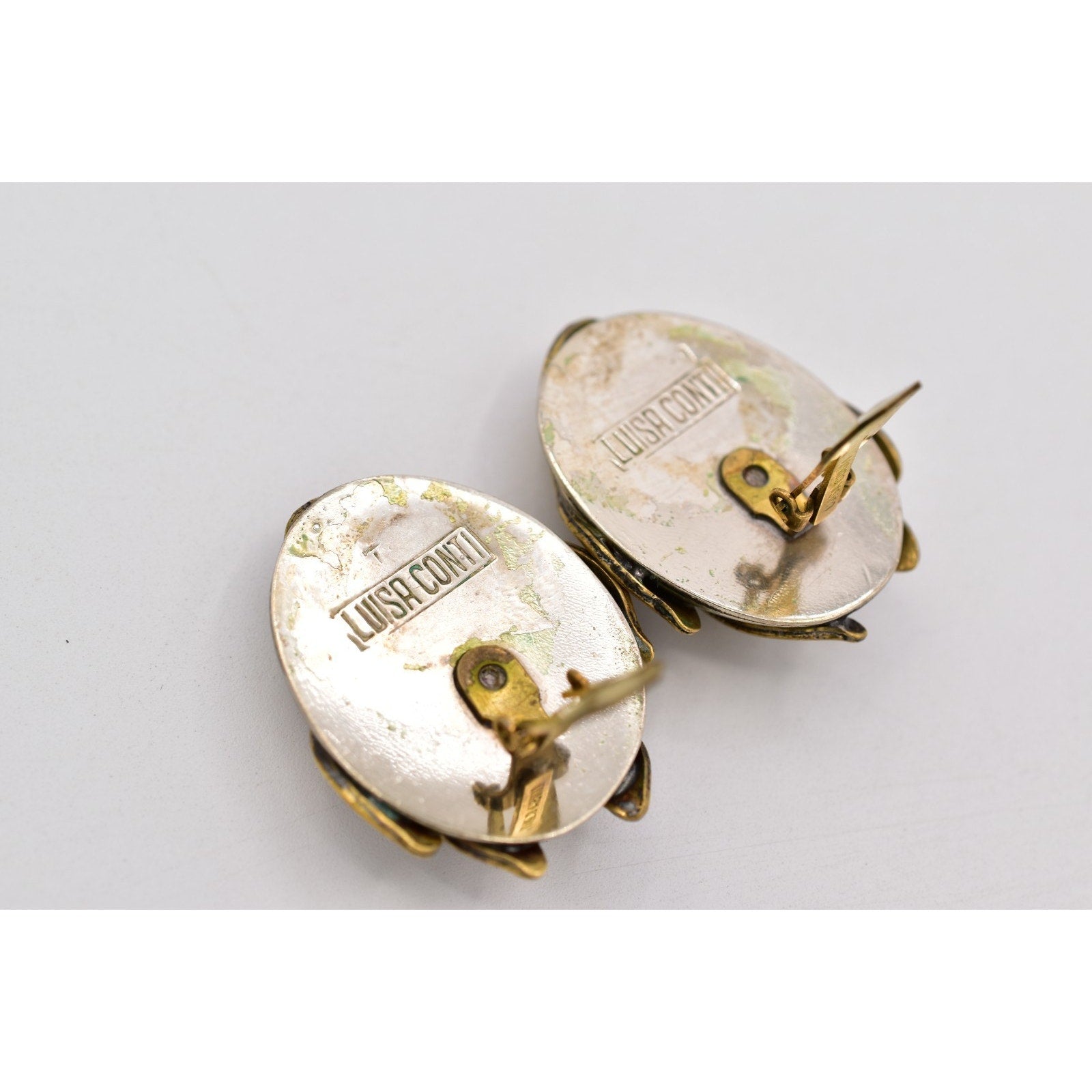 Sculptural vintage clip earrings by Luisa Conti, featuring bold gold-tone leaf curves layered over a luminous domed base for an elevated, architectural statement.