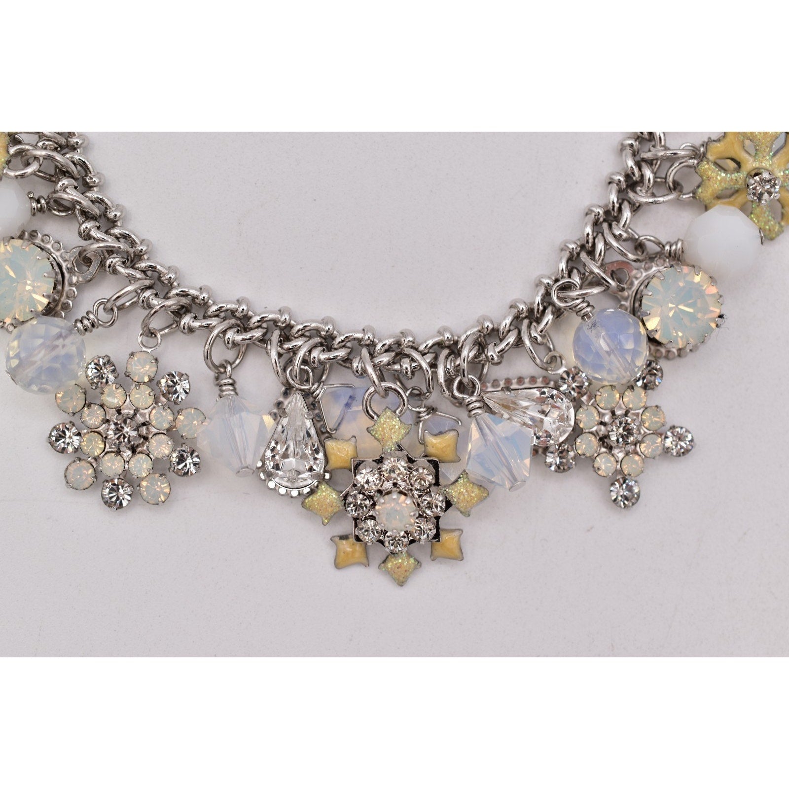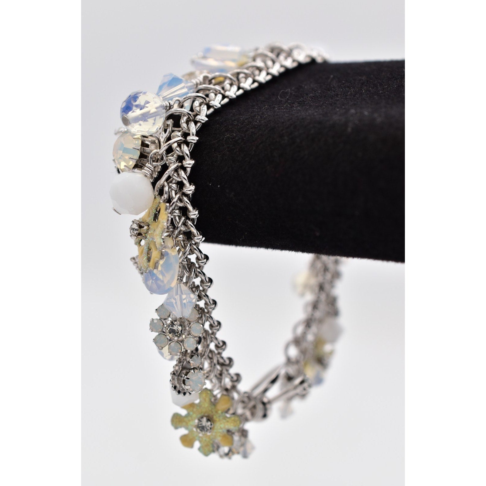 Playful and collectible vintage Lunch at the Ritz charm bracelet featuring an eclectic mix of sparkling rhinestones, opalescent glass beads, and whimsical enamel charms. This bracelet showcases the brand’s signature fantasy aesthetic with layered textures, icy tones, and eye-catching movement. A true statement piece for collectors and lovers of maximalist vintage jewelry.