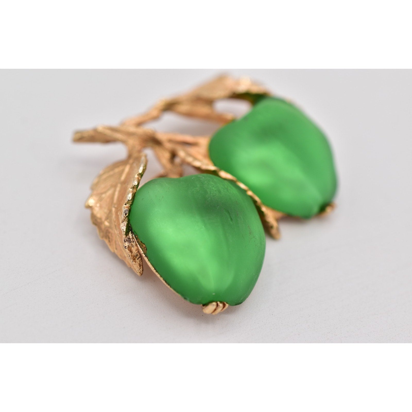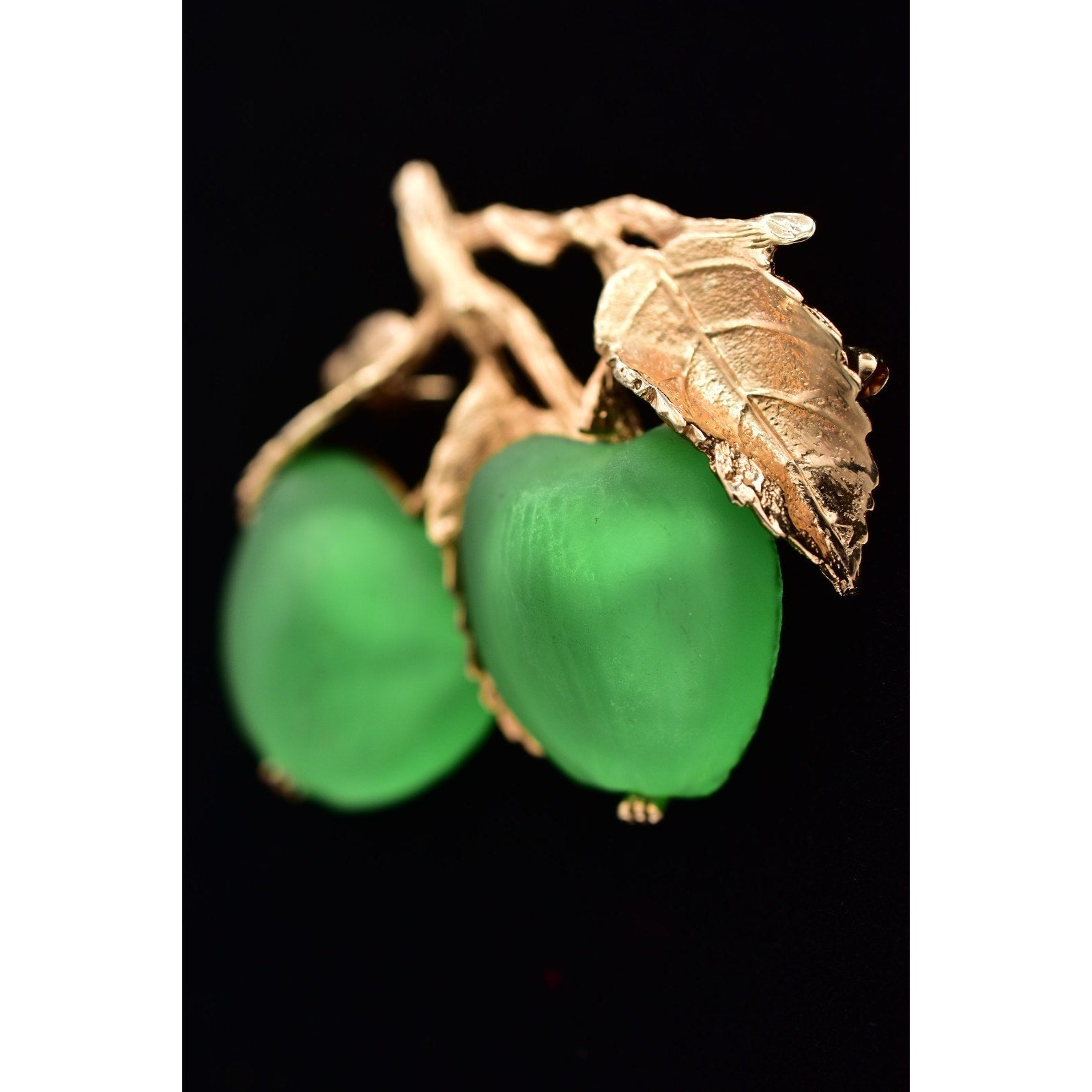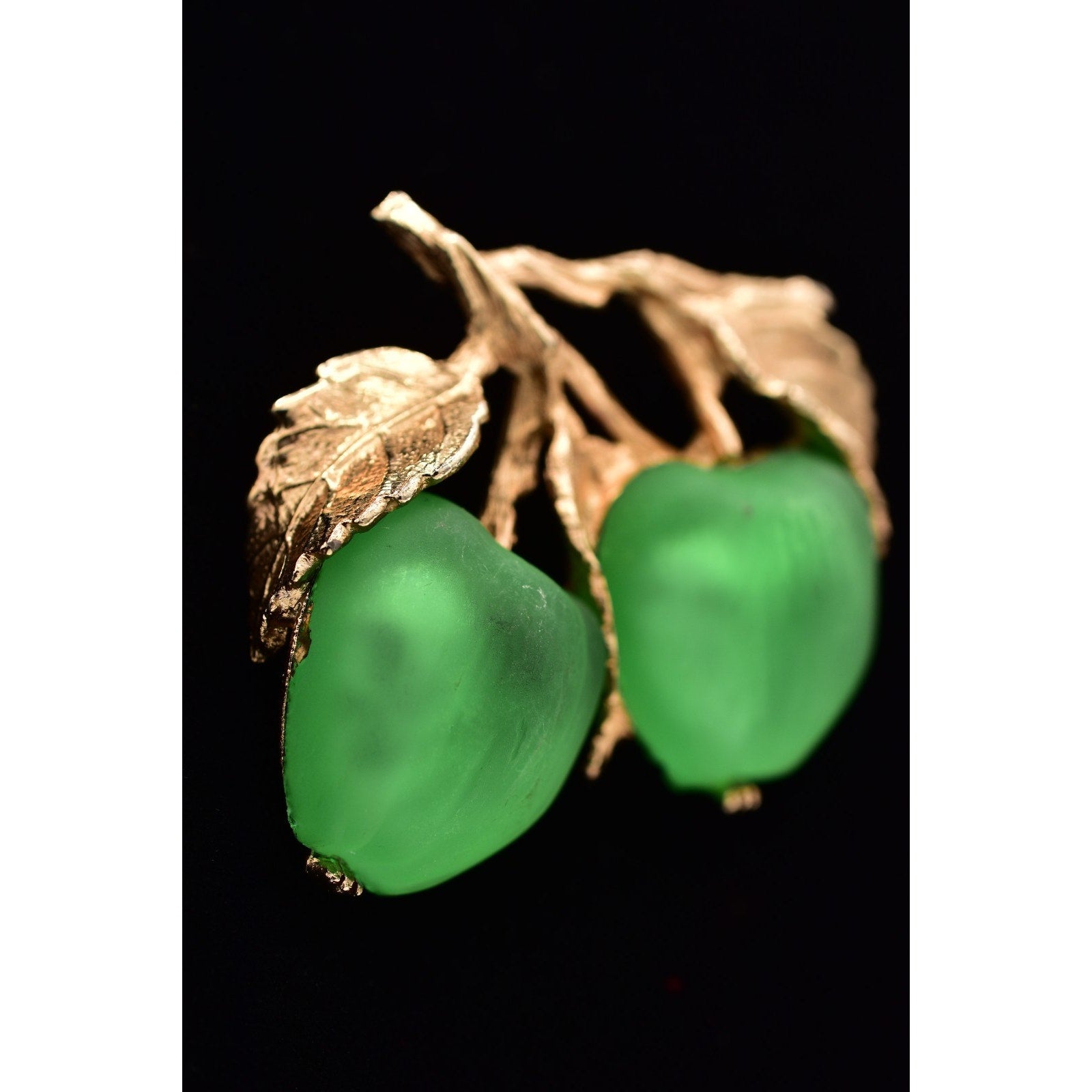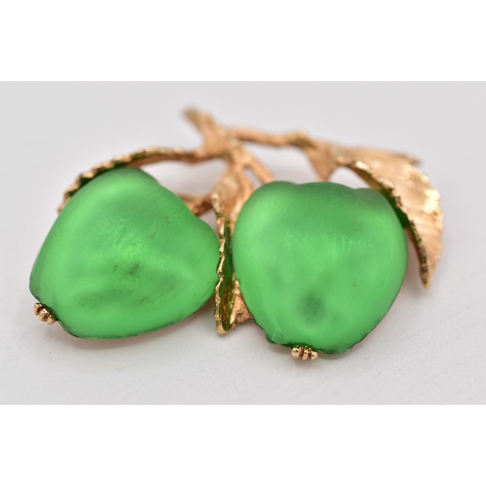 Material: Gold-tone metal with green satin-finish apple cabochons (glass/acrylic)