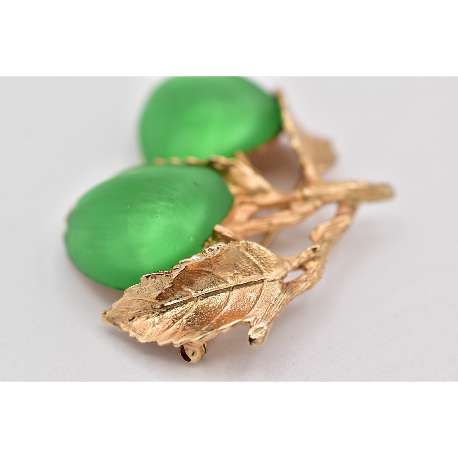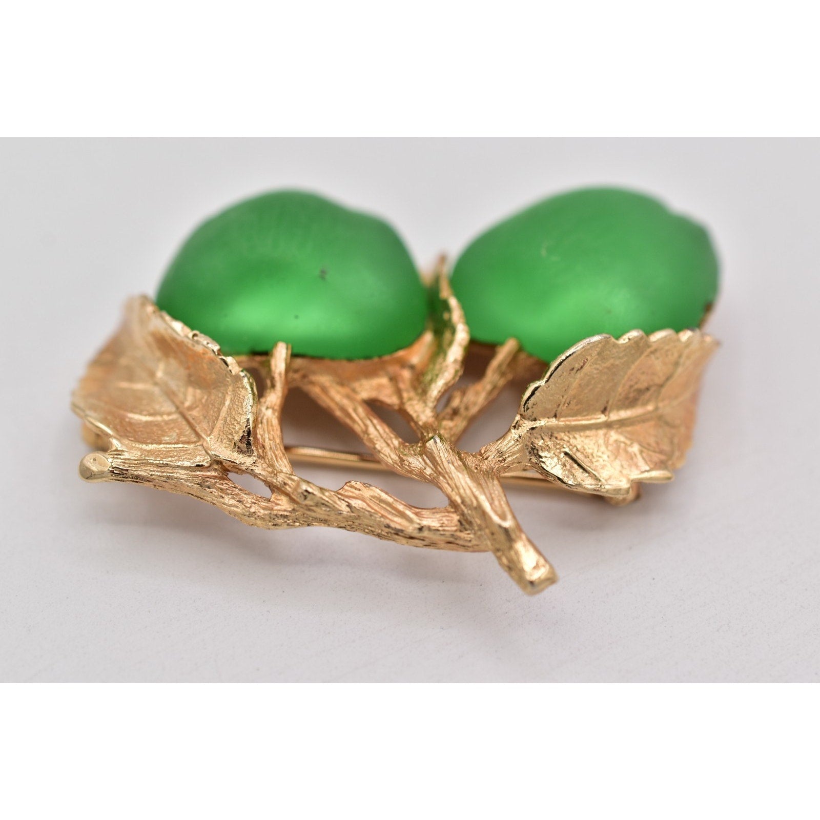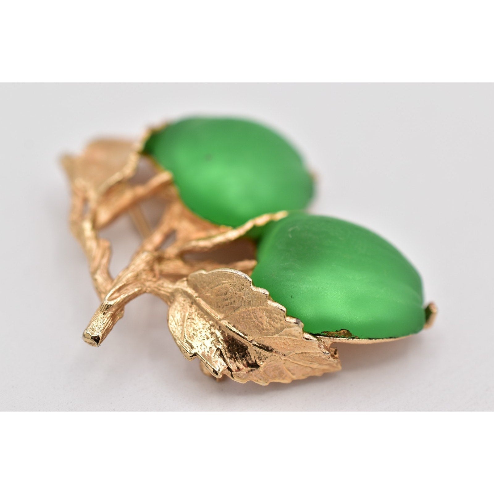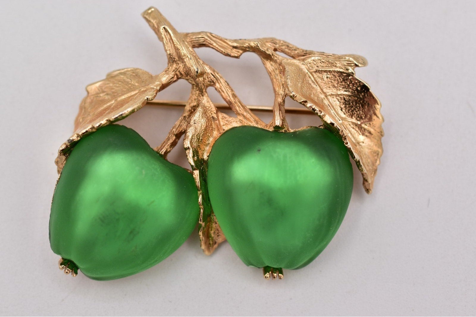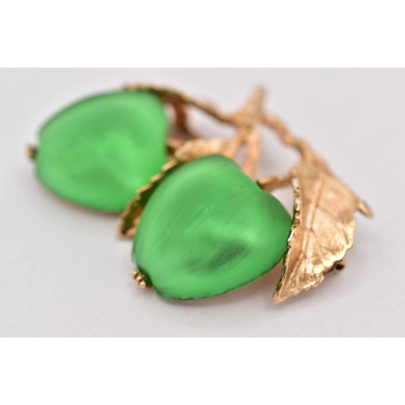 Material: Gold-tone metal with green satin-finish apple cabochons (glass/acrylic)