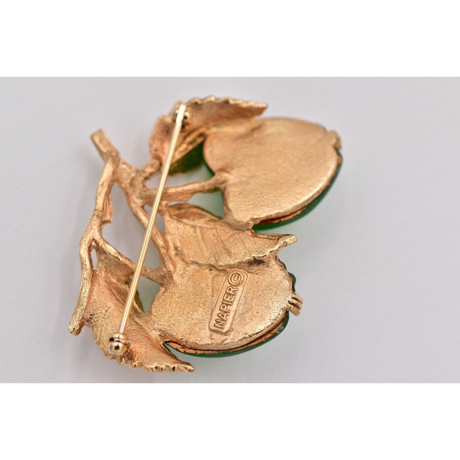 Charming vintage Napier apple brooch featuring two luminous emerald green satin-finish apples on a textured gold-tone branch with detailed leaves. A playful yet elegant statement pin—perfect for teachers, fall outfits, or nature lovers.