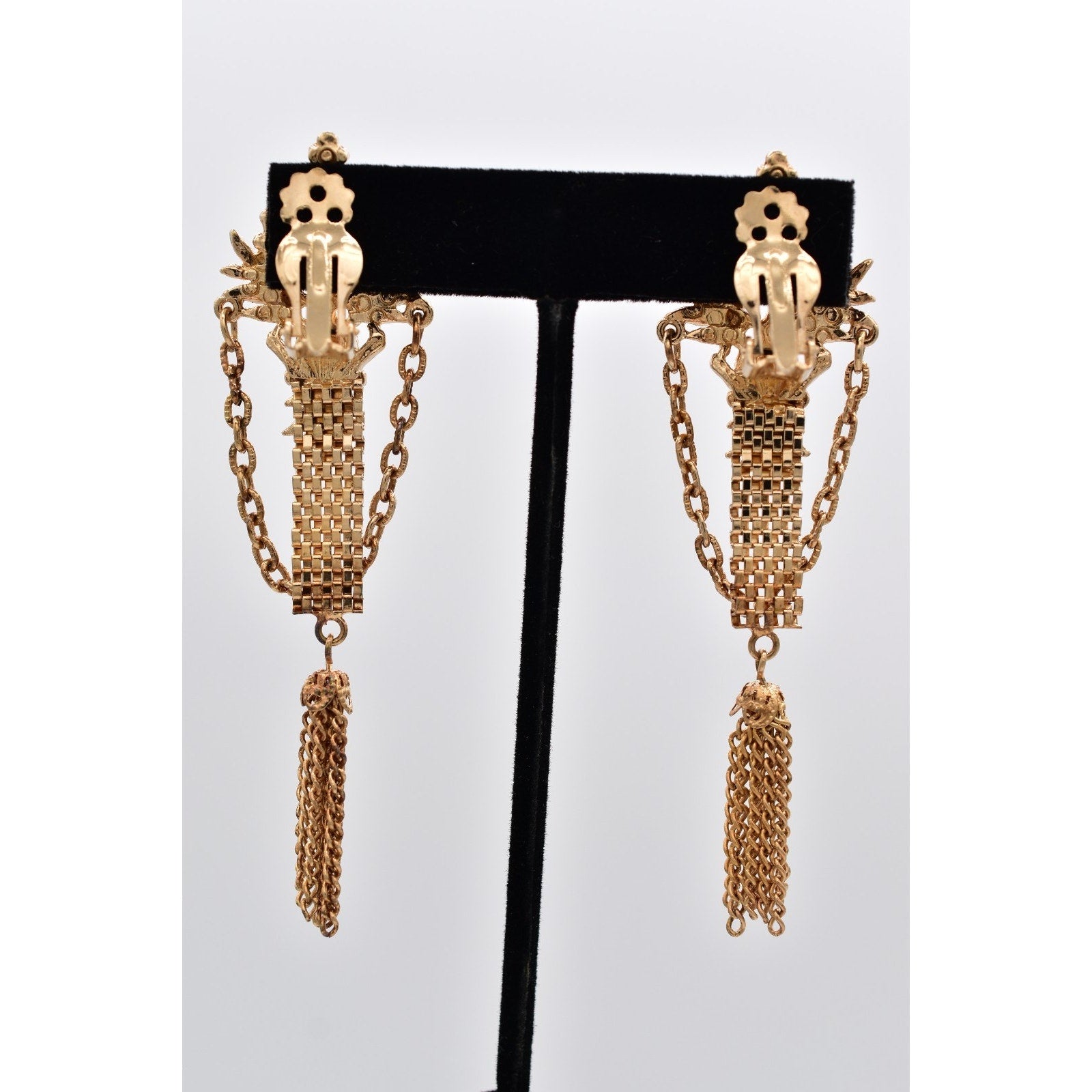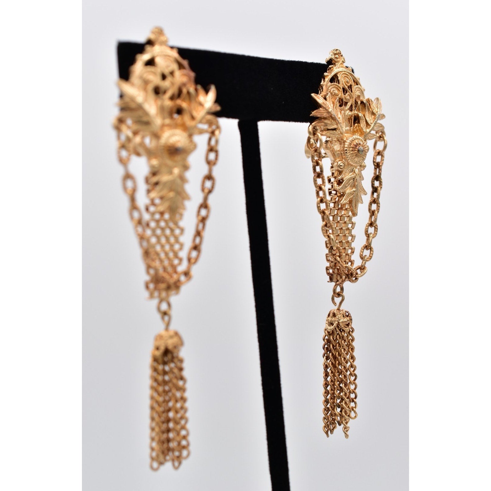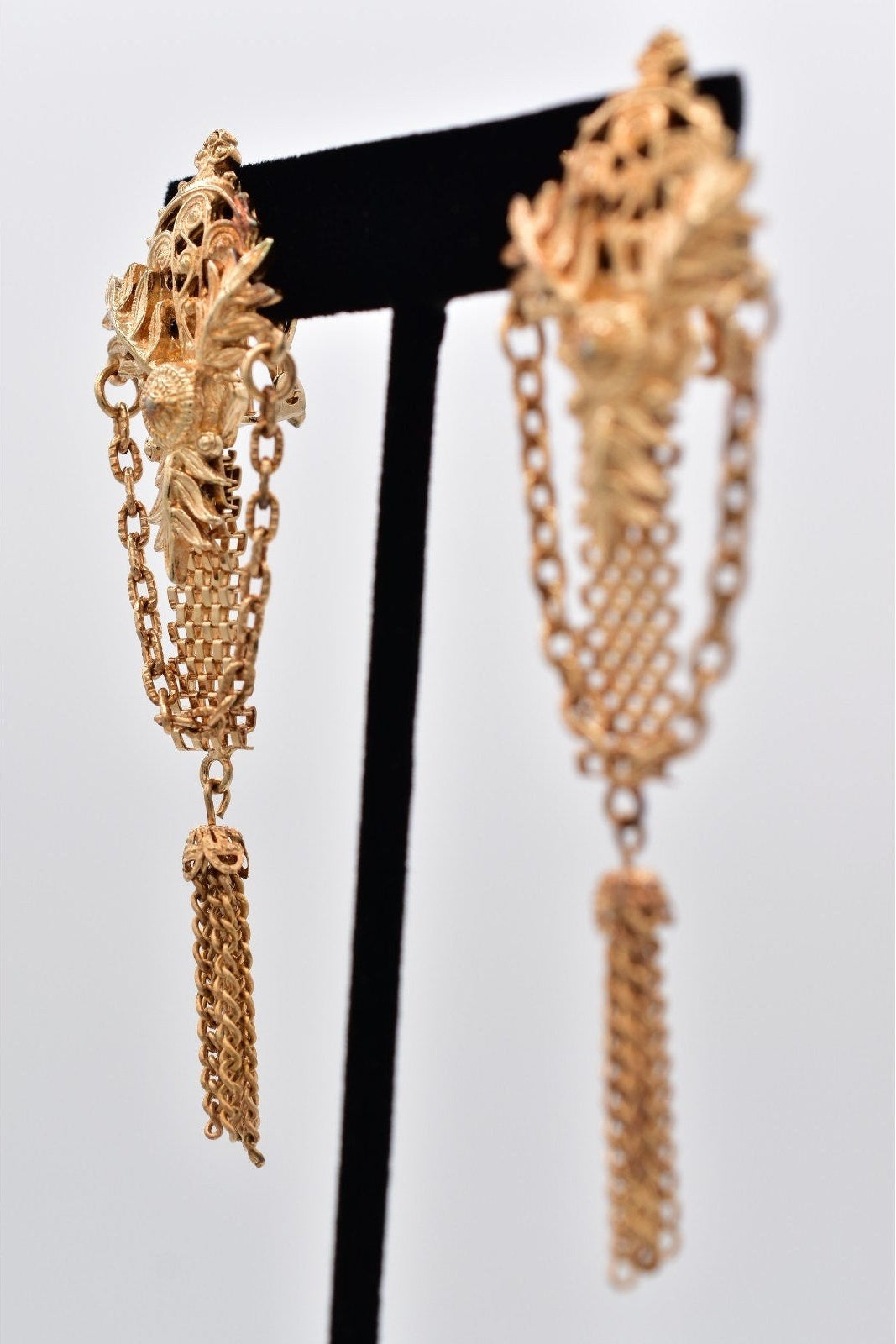 An ornate pair of vintage gold-tone statement earrings featuring intricate filigree detailing, layered chain accents, and dramatic tassel fringe. Bold, romantic, and made to move with every step.