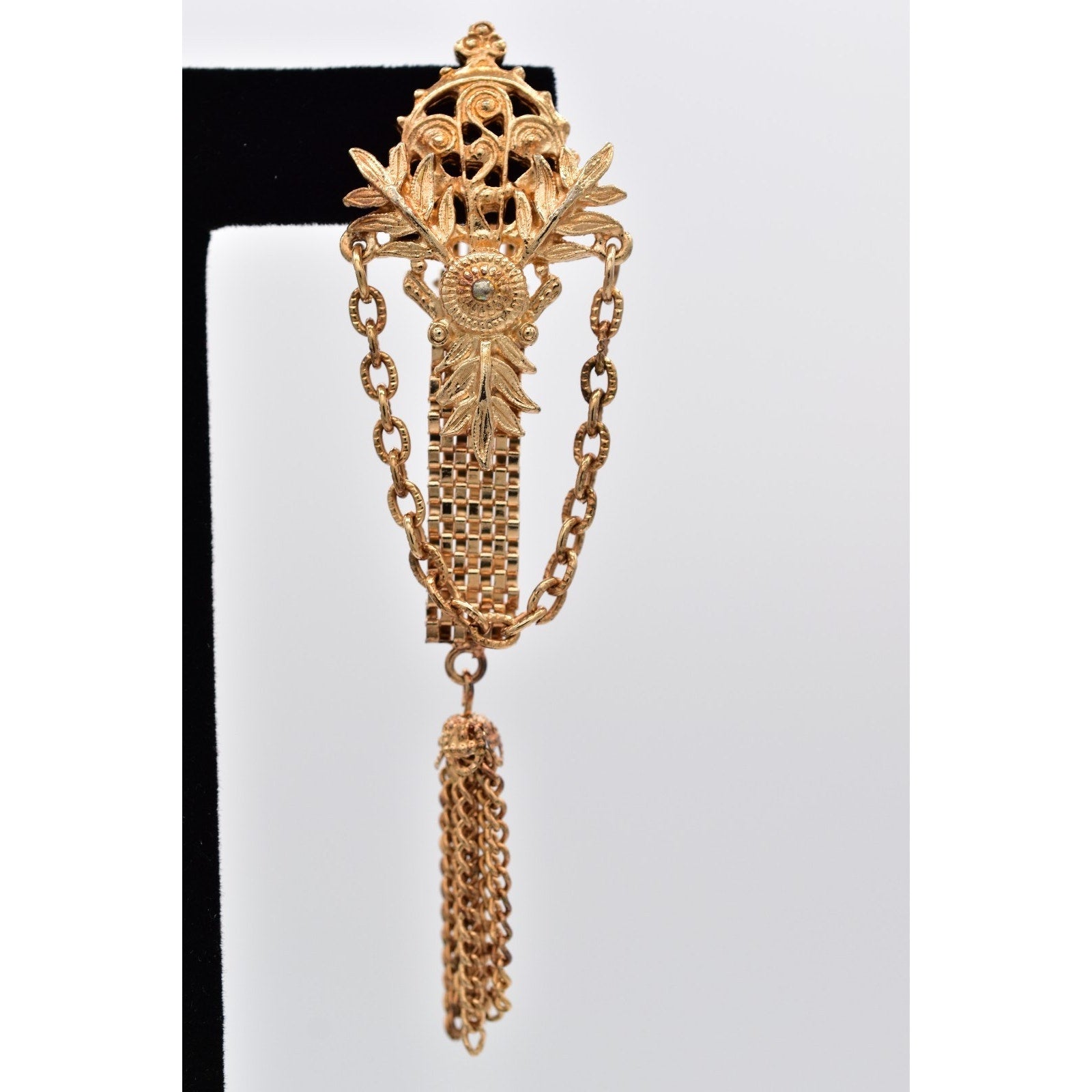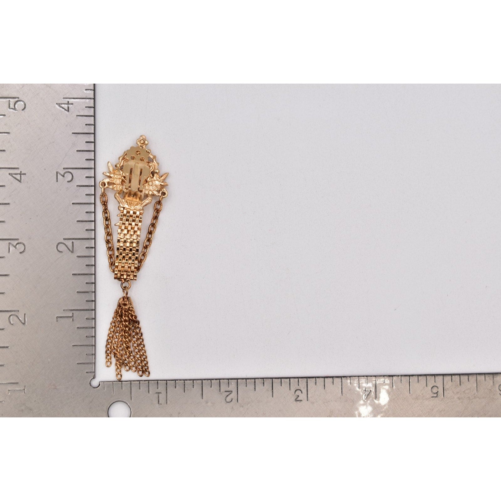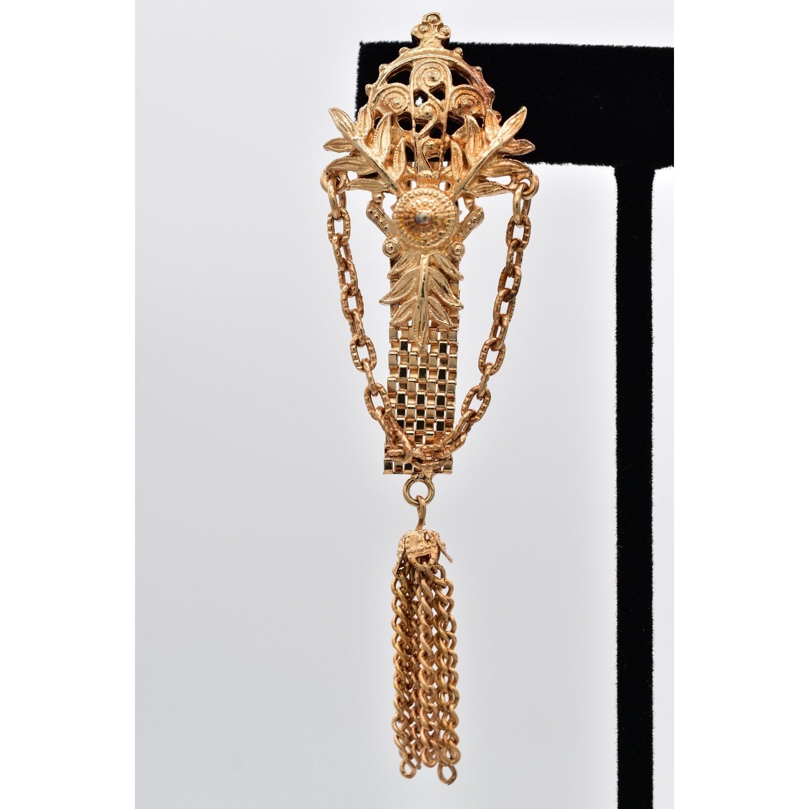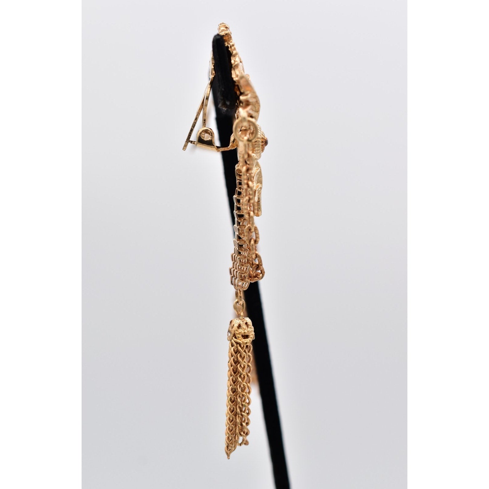 An ornate pair of vintage gold-tone statement earrings featuring intricate filigree detailing, layered chain accents, and dramatic tassel fringe. Bold, romantic, and made to move with every step.