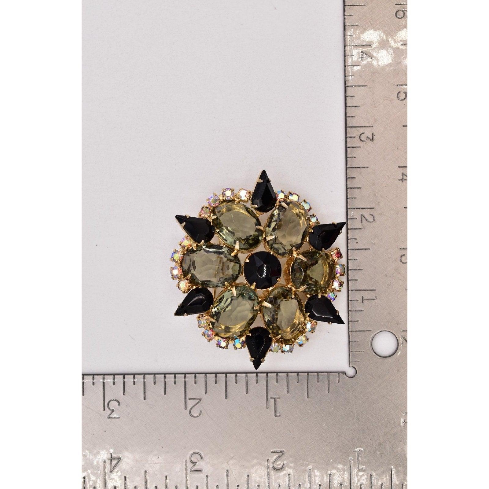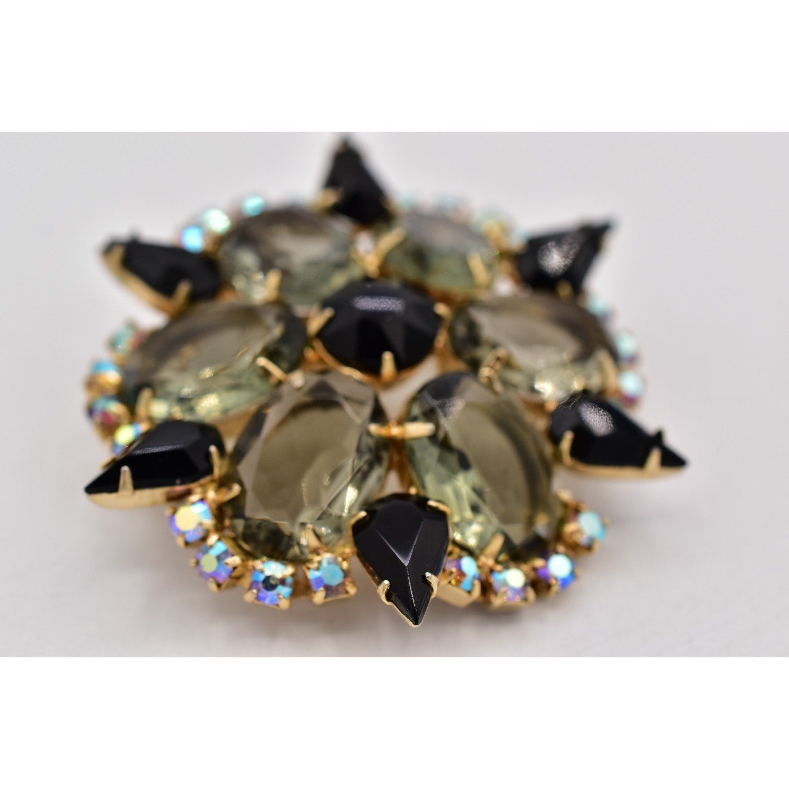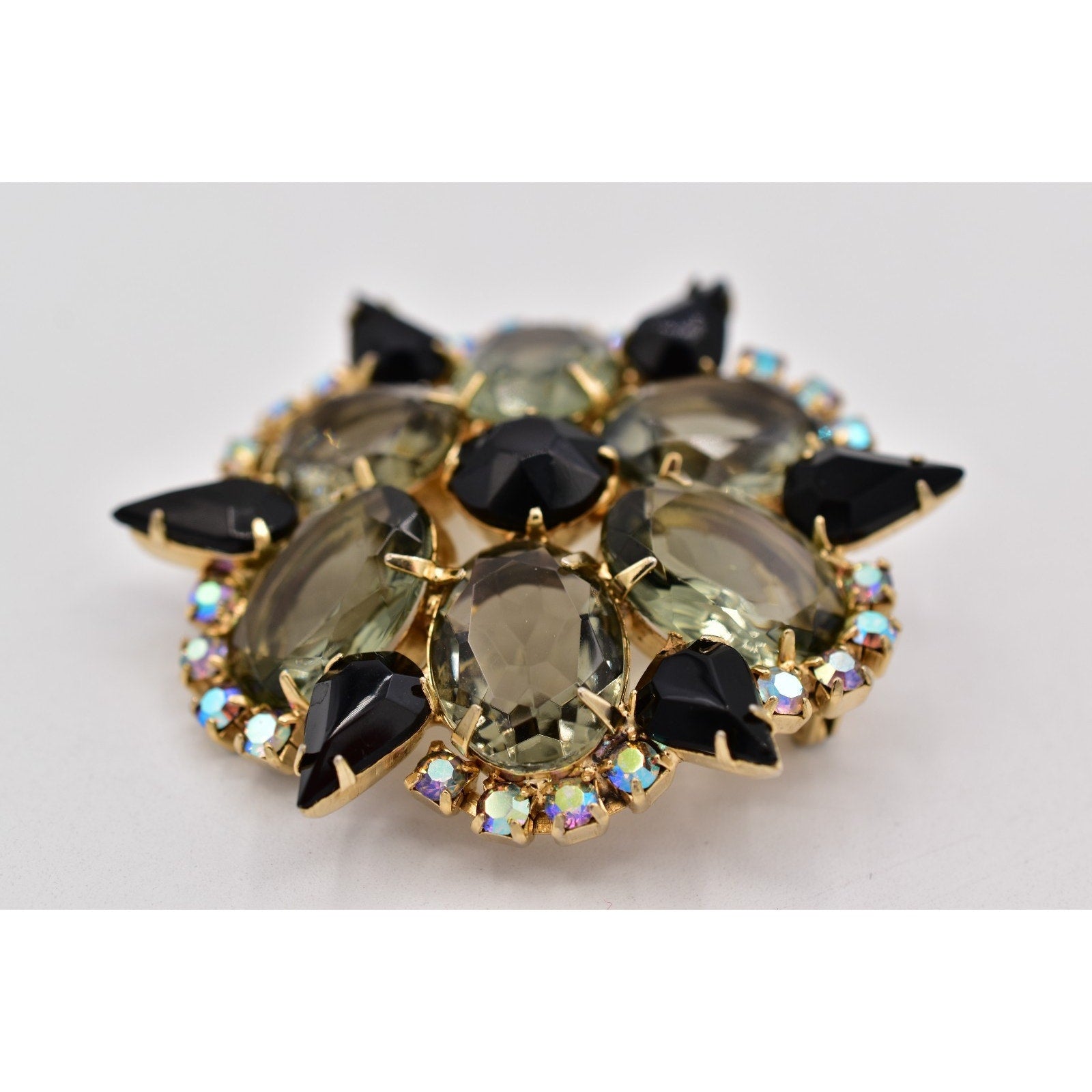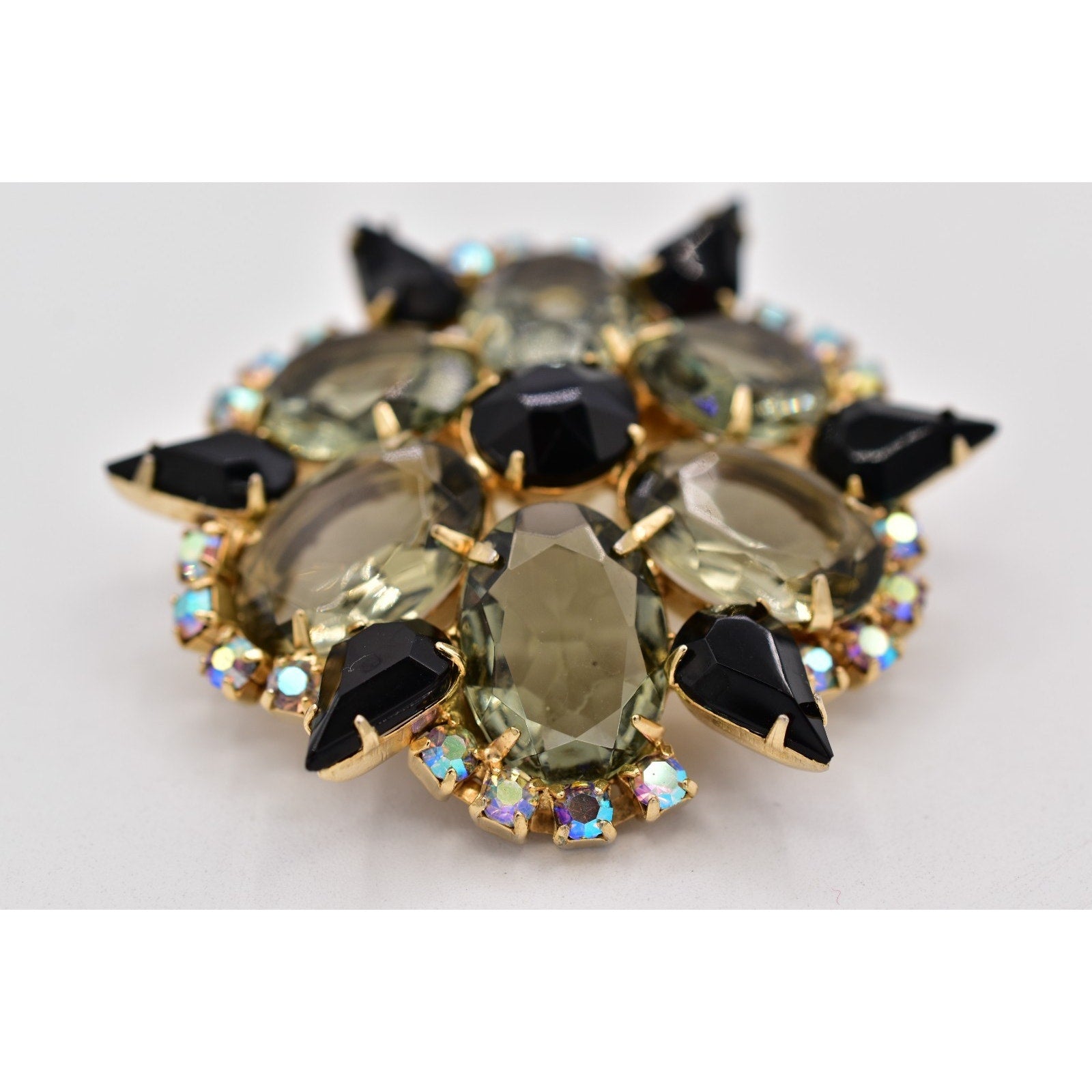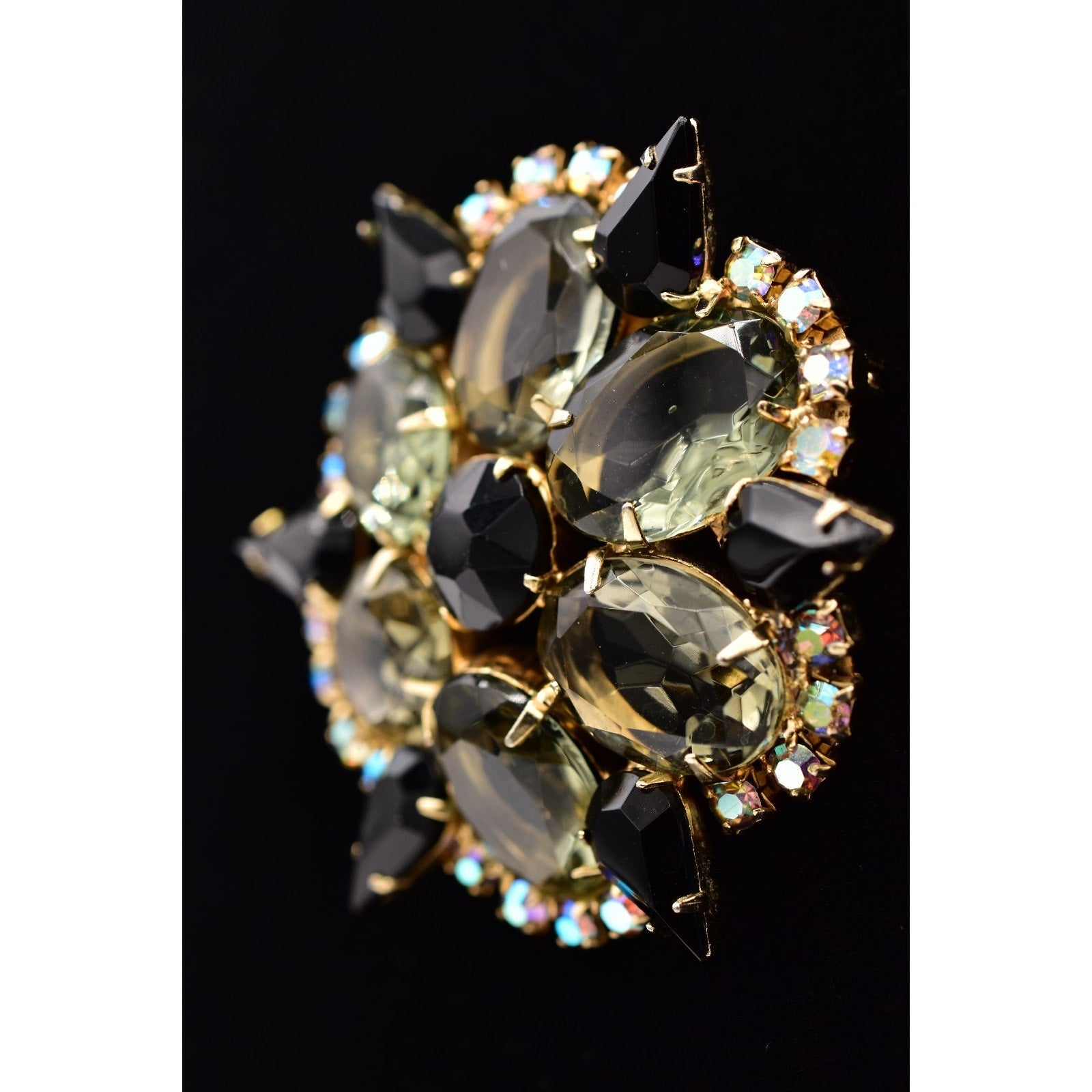 Striking mid-century brooch featuring smoky topaz-colored faceted ovals accented with glossy black navette stones and a halo of iridescent aurora borealis chatons. A bold, dimensional statement piece with beautiful sparkle.