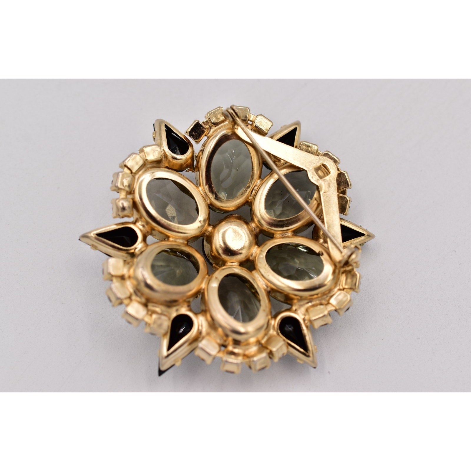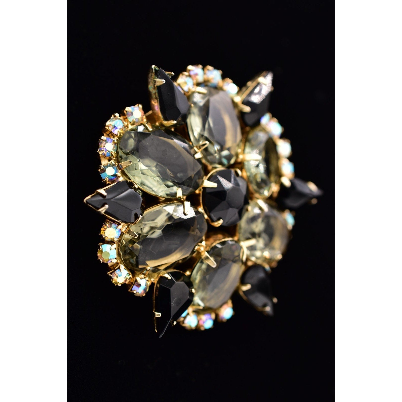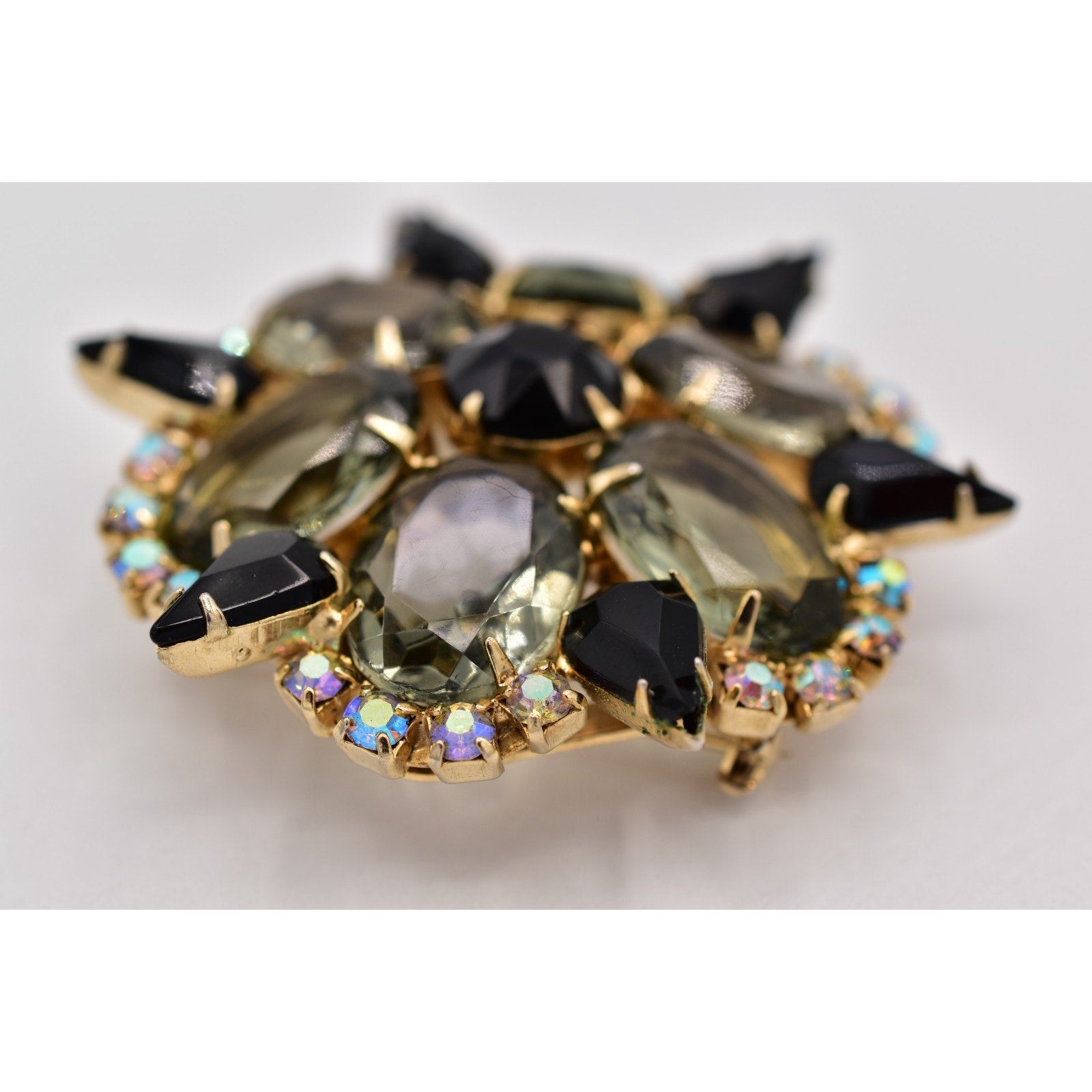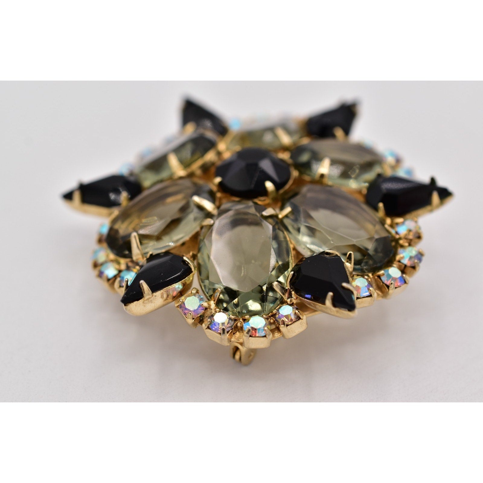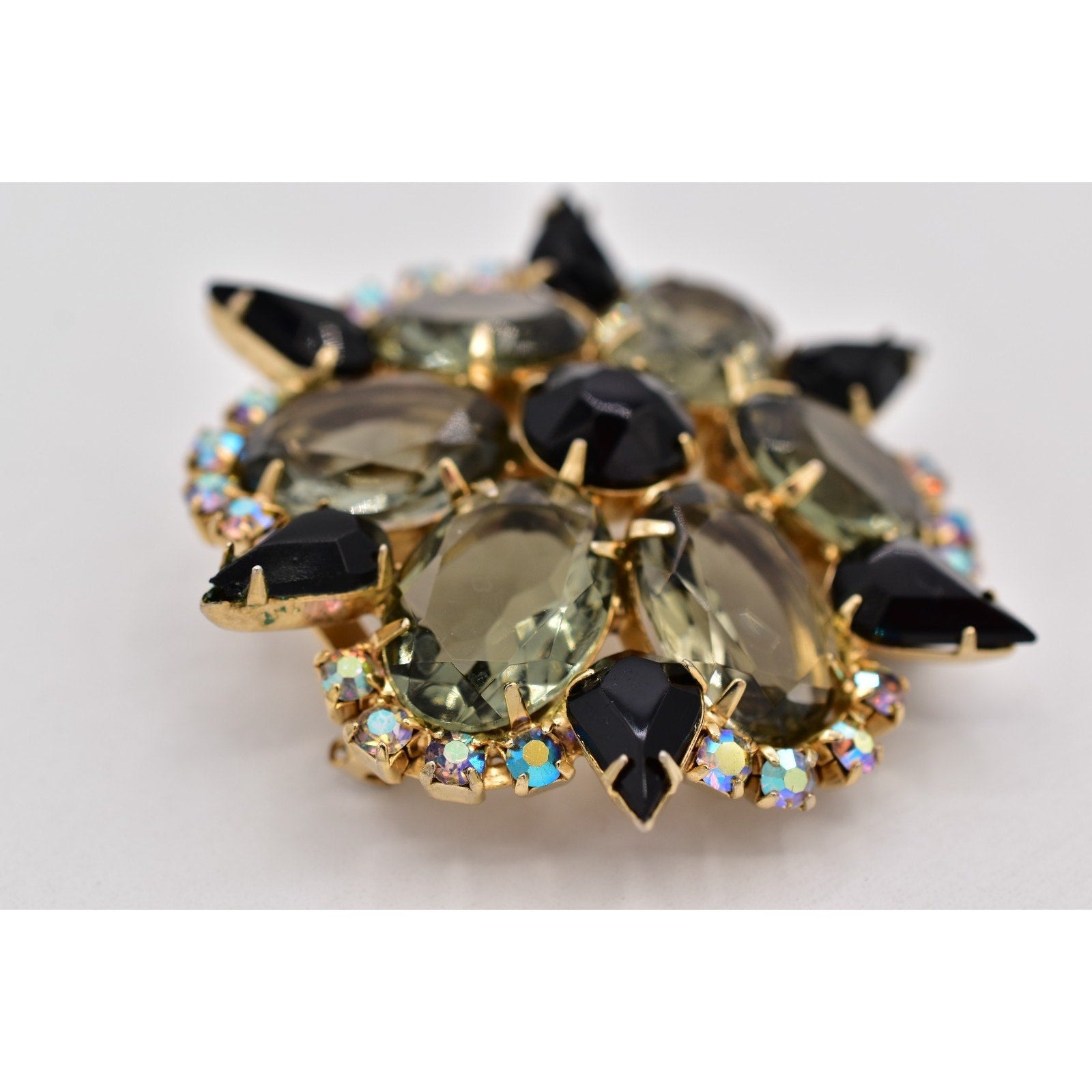 Striking mid-century brooch featuring smoky topaz-colored faceted ovals accented with glossy black navette stones and a halo of iridescent aurora borealis chatons. A bold, dimensional statement piece with beautiful sparkle.
