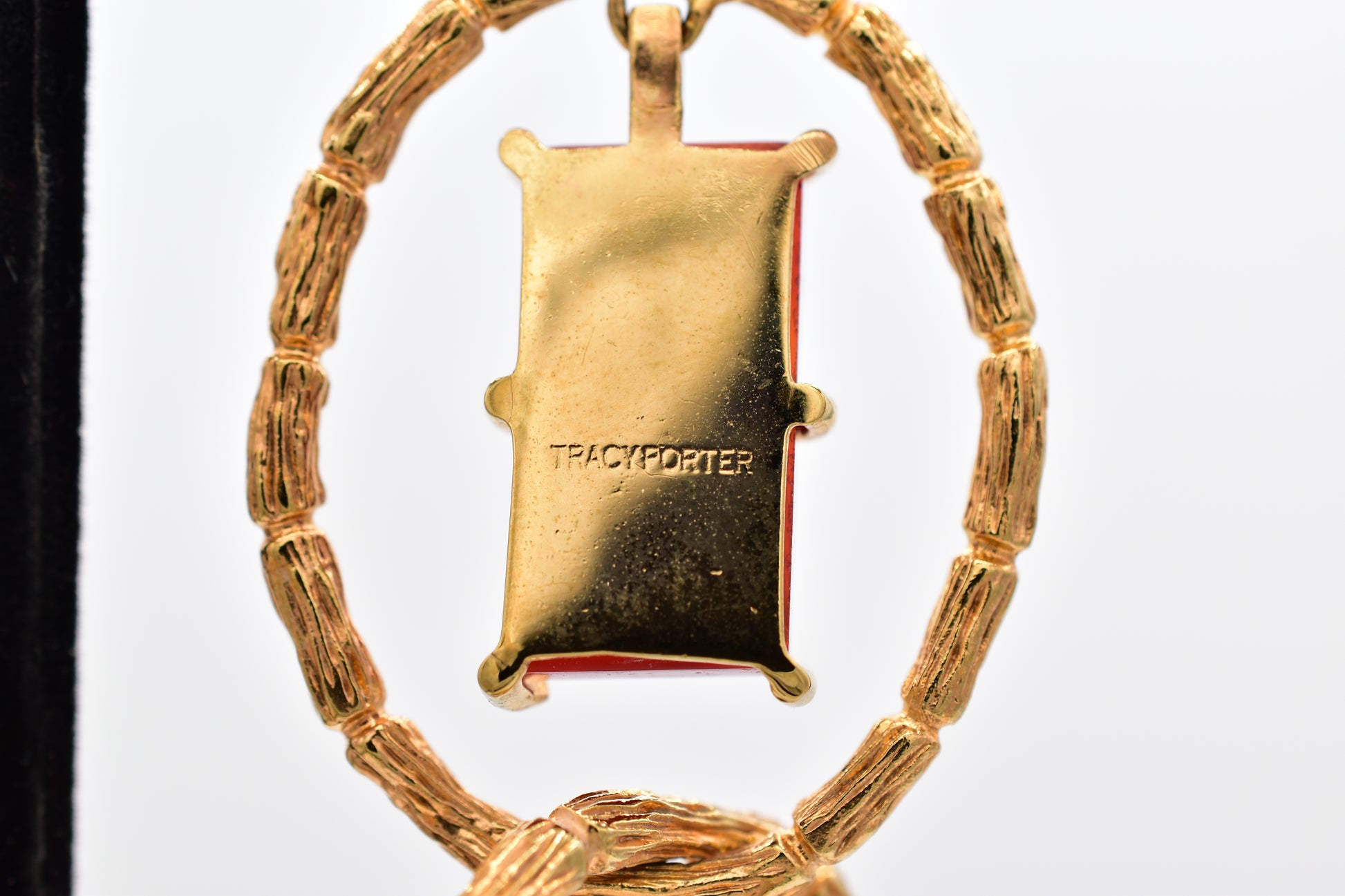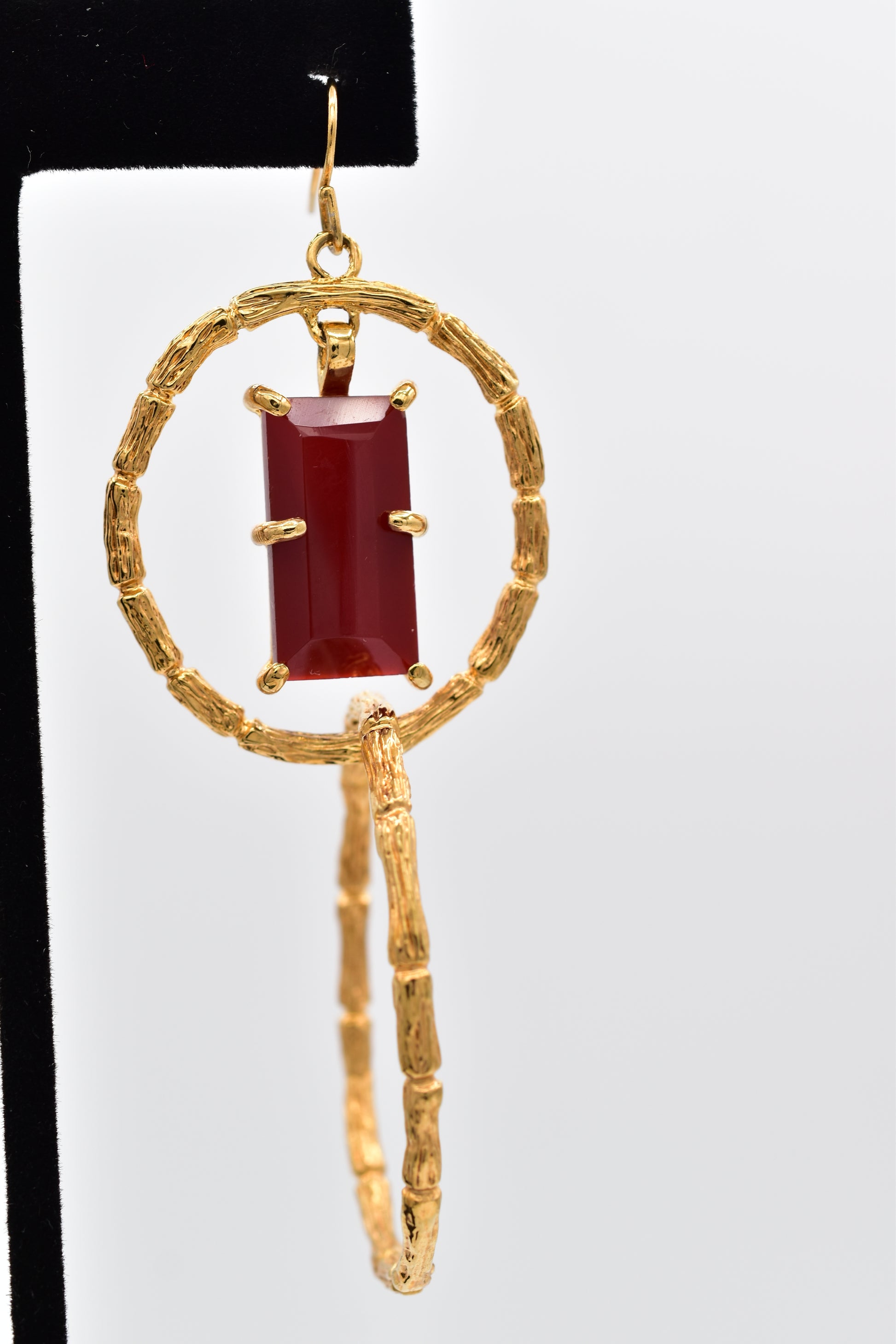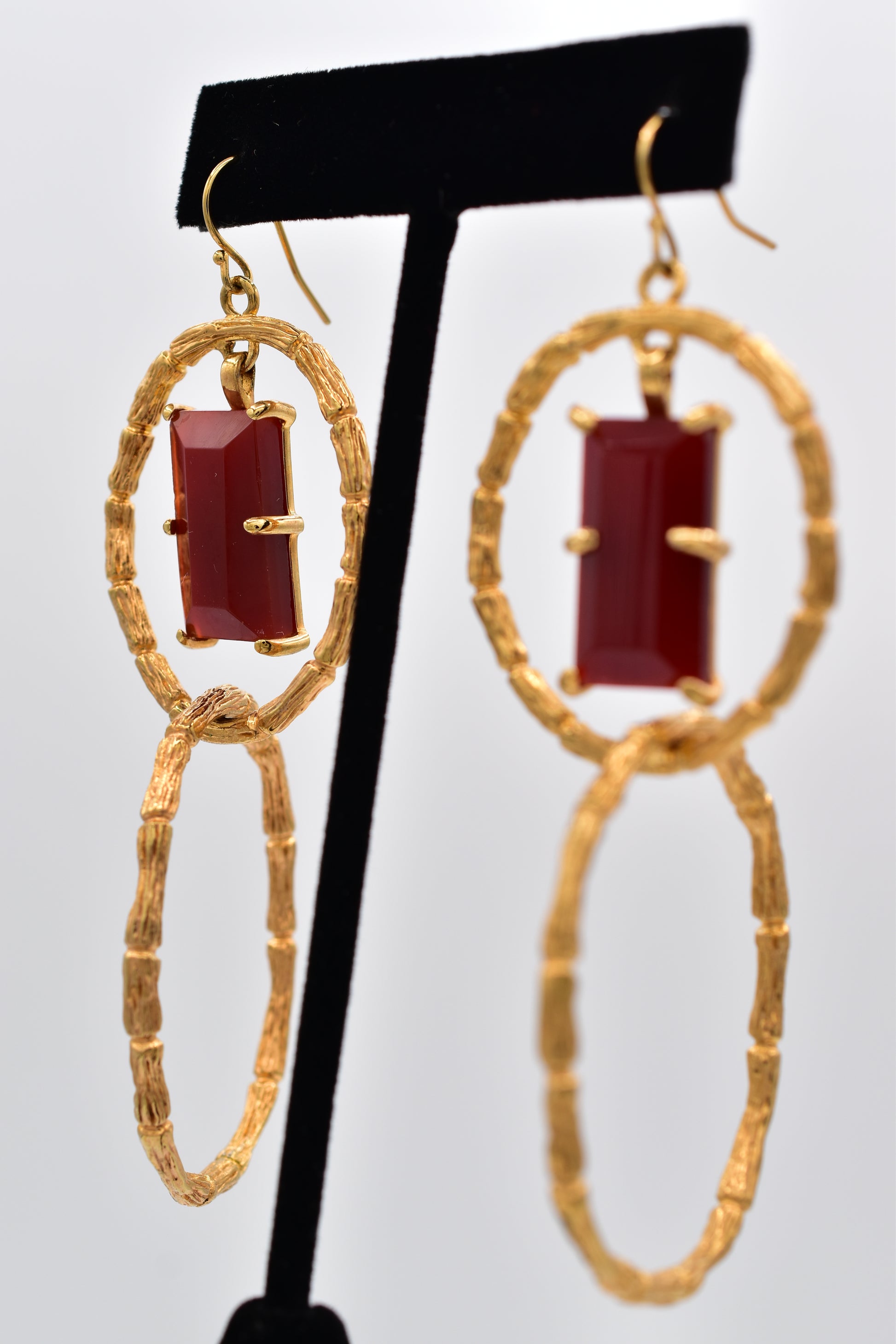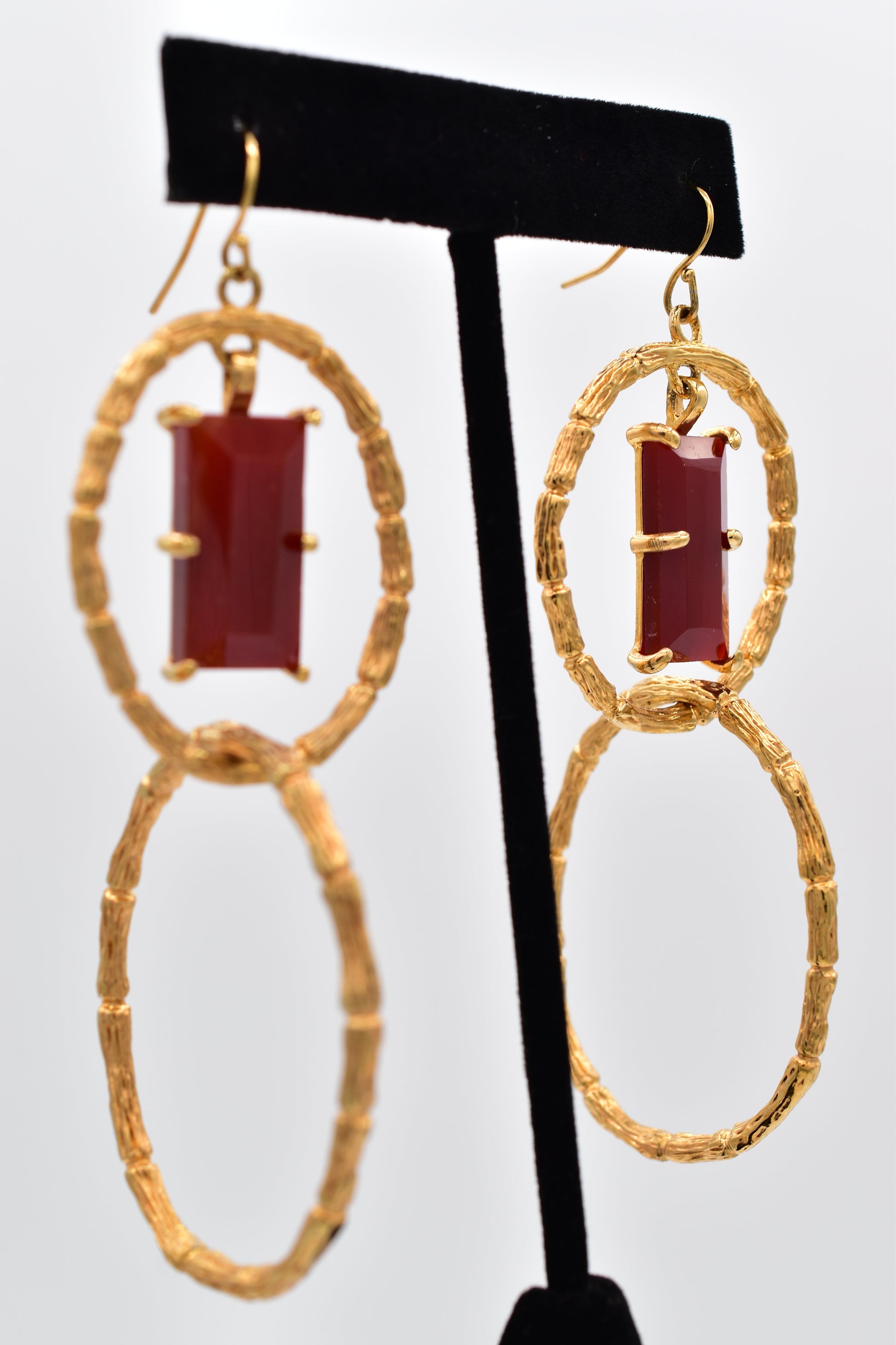 Elegant vintage Tracy Porter statement earrings featuring rich red lucite drops suspended within textured gold-tone hoops. A bold yet refined design with timeless designer appeal.