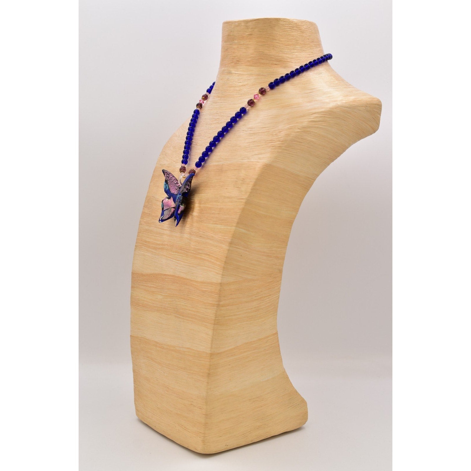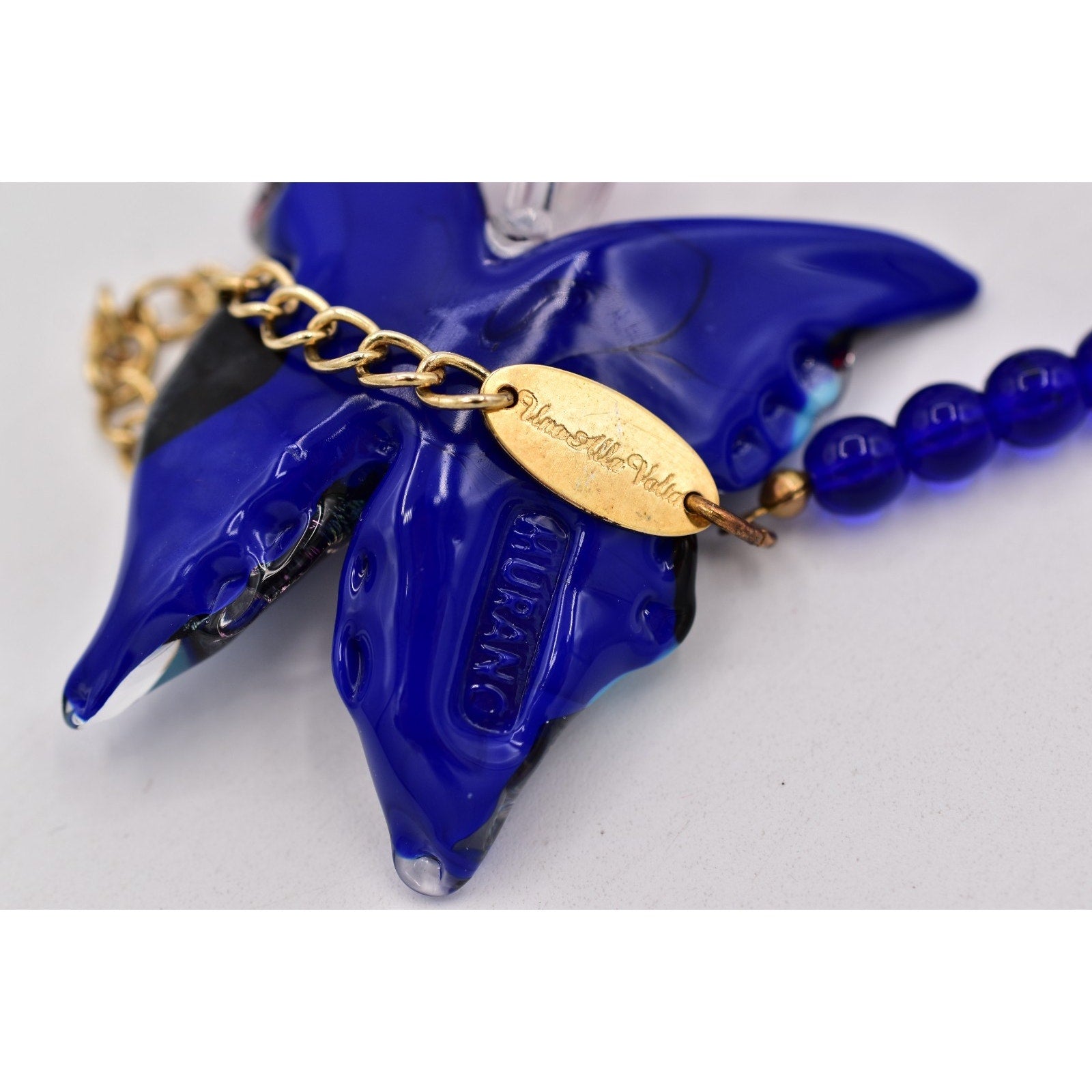 Striking vintage Murano glass butterfly necklace featuring vivid cobalt blue and pink dichroic tones, paired with a signed Uno Alla Volta clasp for an elegant artisan finish.