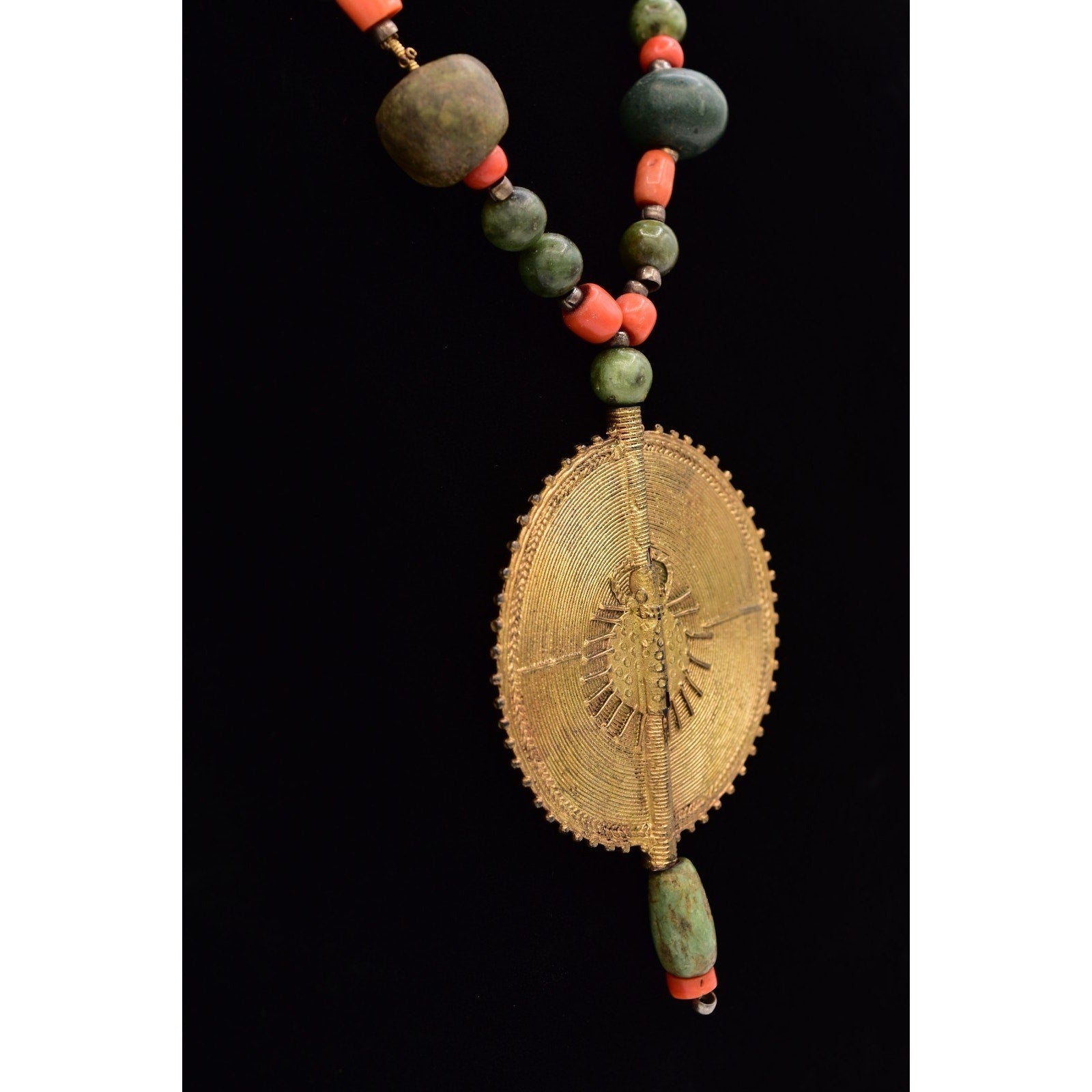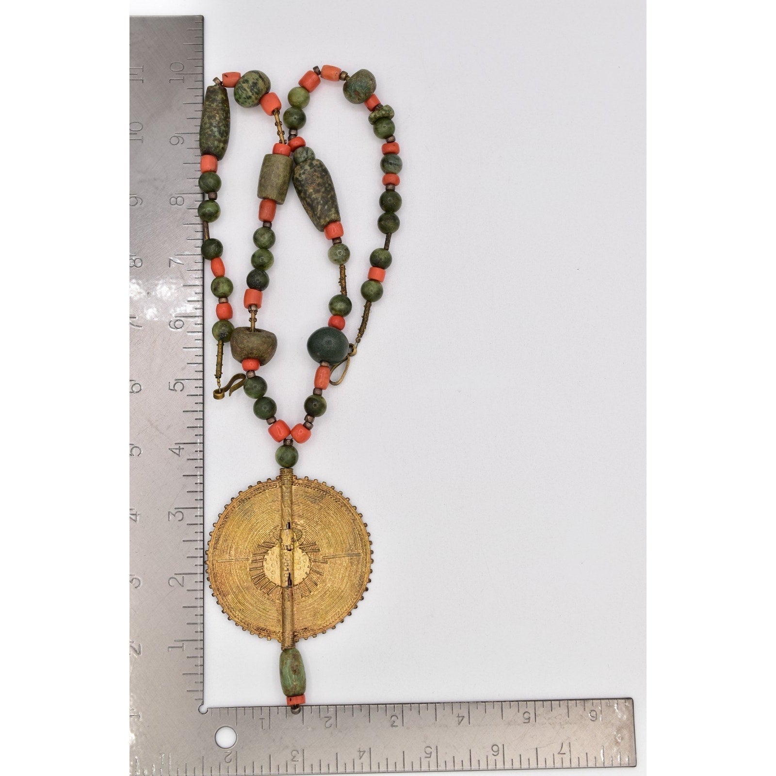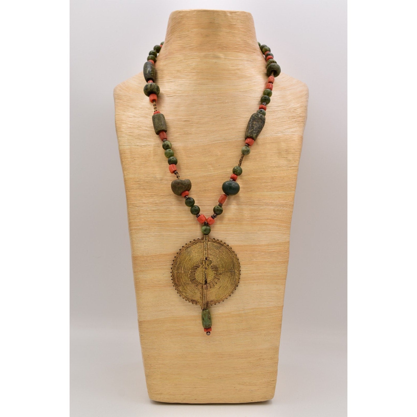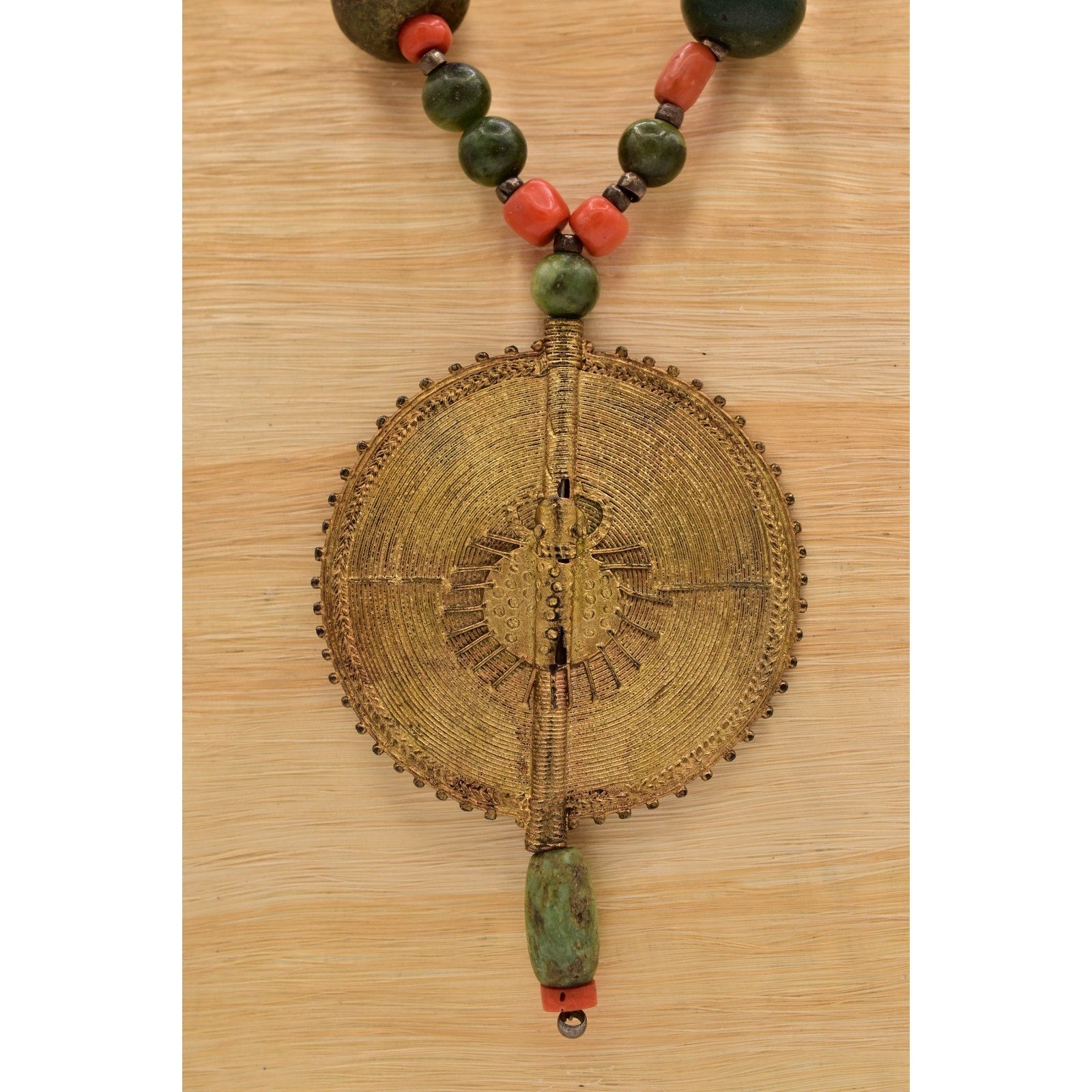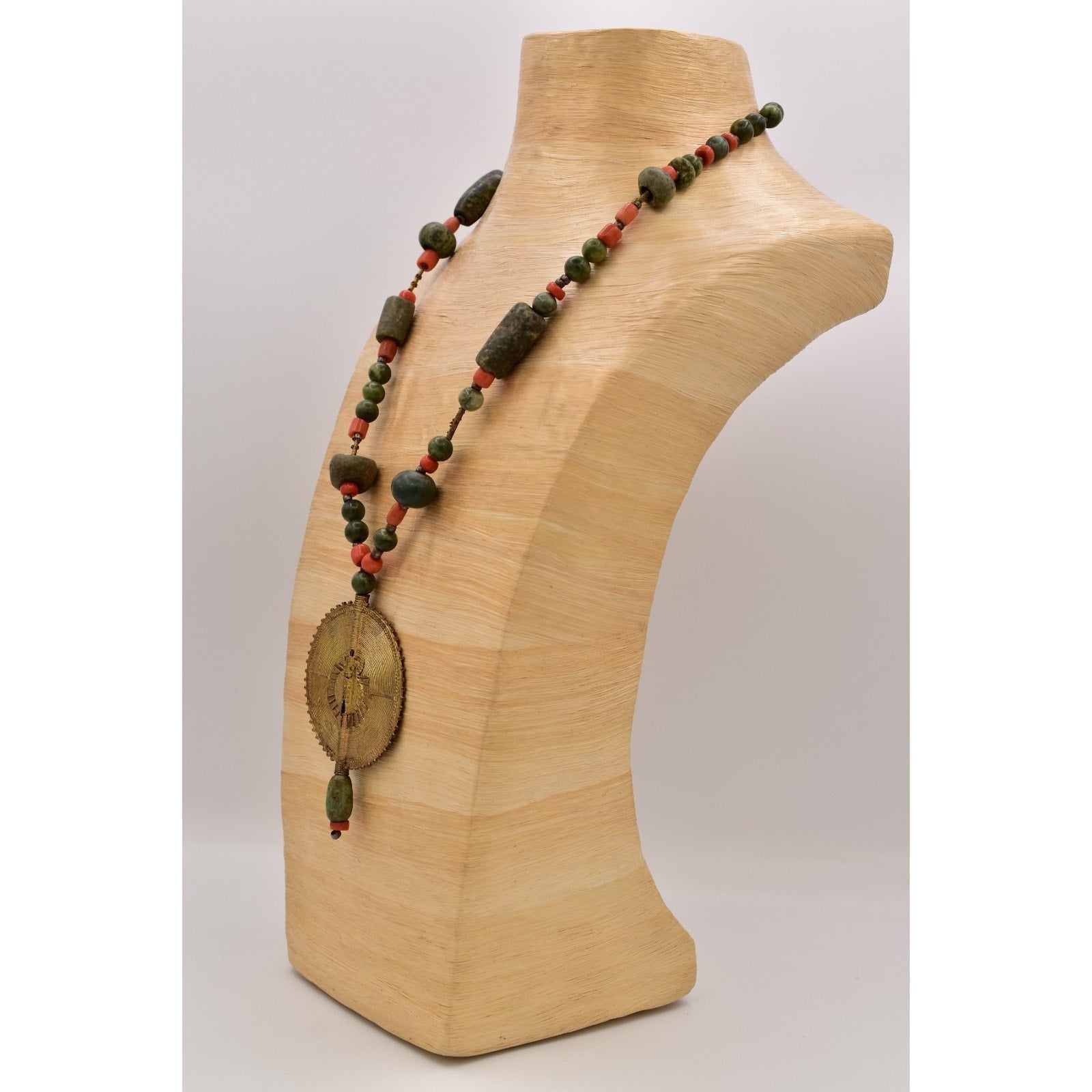 Vintage African Brass Medallion Necklace with Natural Stone Beads