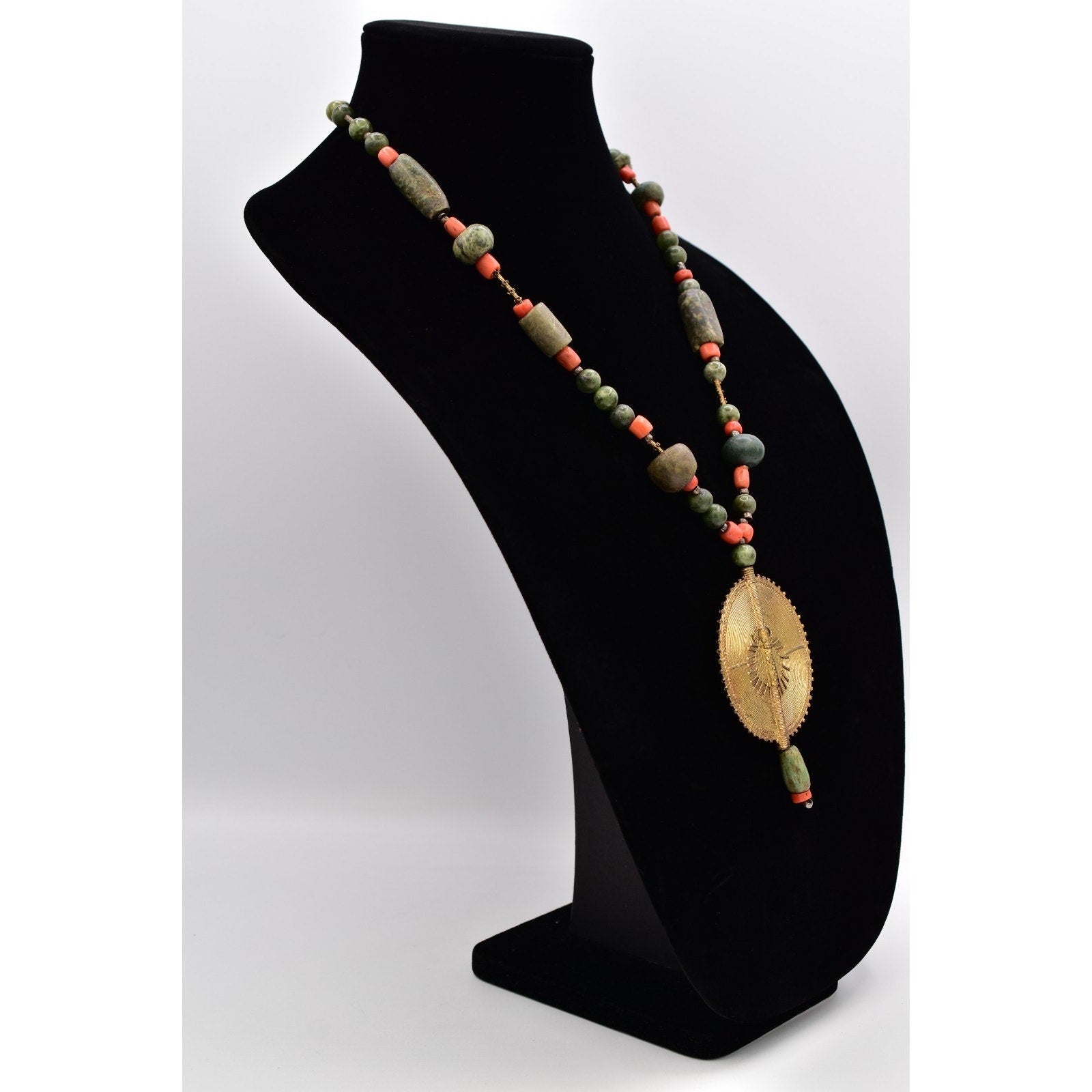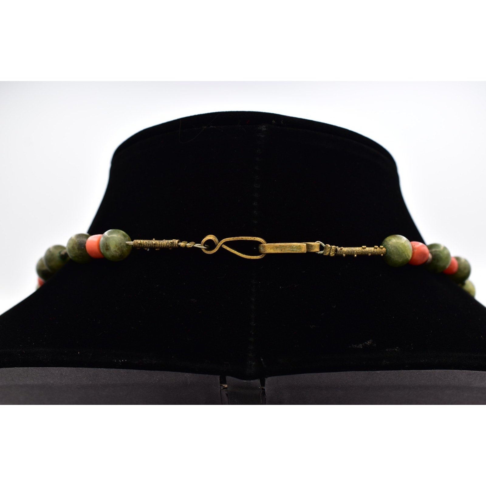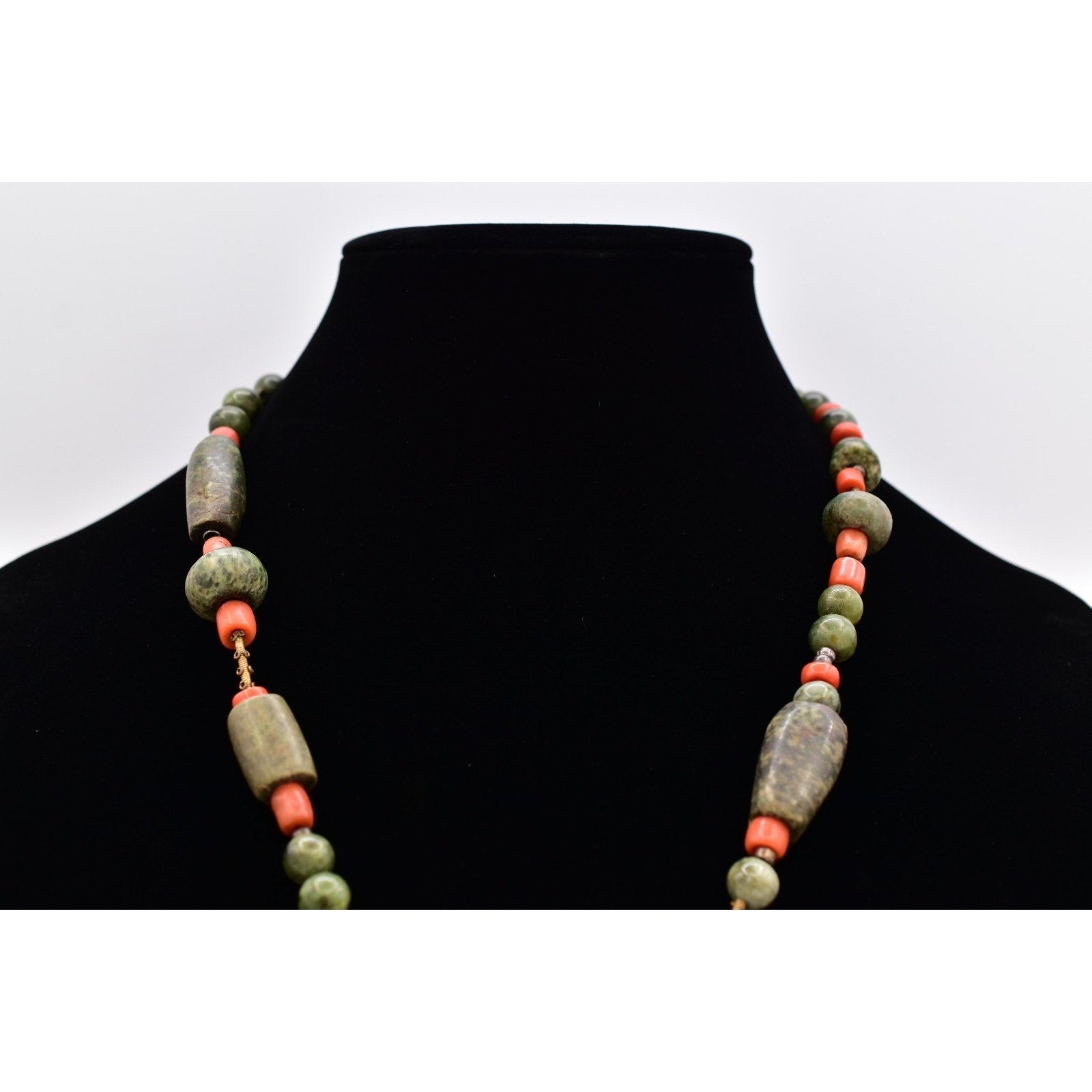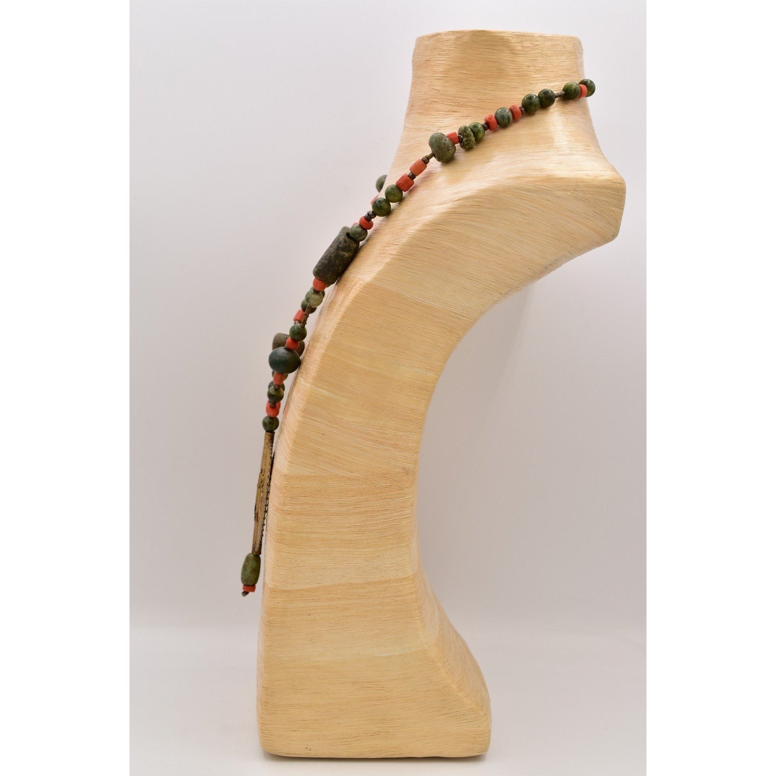 The chain is strung with a striking combination of green carved stone beads, rustic natural stones, and warm coral-toned beads, creating a rich palette of earthy colors and organic texture. Each bead is unique, adding authentic character and history to the necklace.
