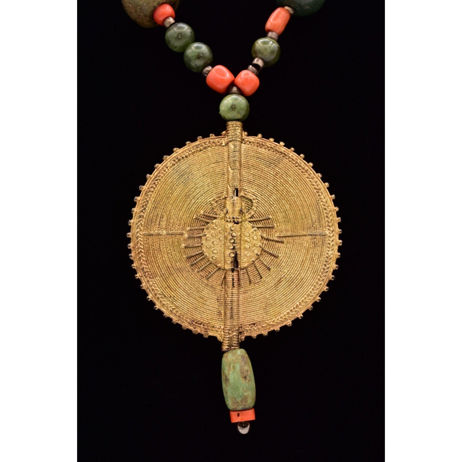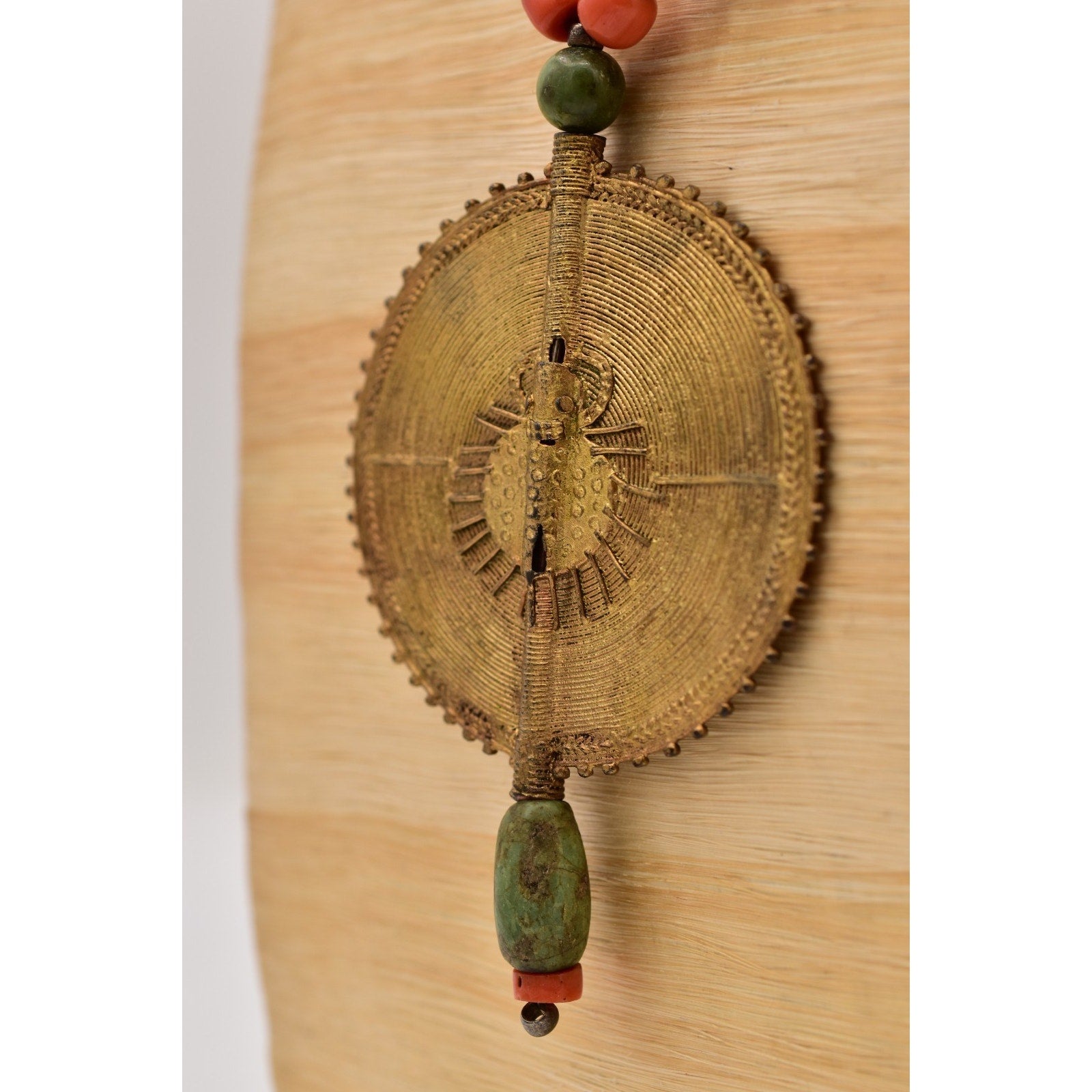 Make a bold cultural statement with this vintage African brass medallion necklace, beautifully handcrafted with earthy natural materials and traditional artistry. The centerpiece features a large round brass medallion with intricate radial and geometric detailing, reminiscent of African sun symbols and tribal ceremonial designs.