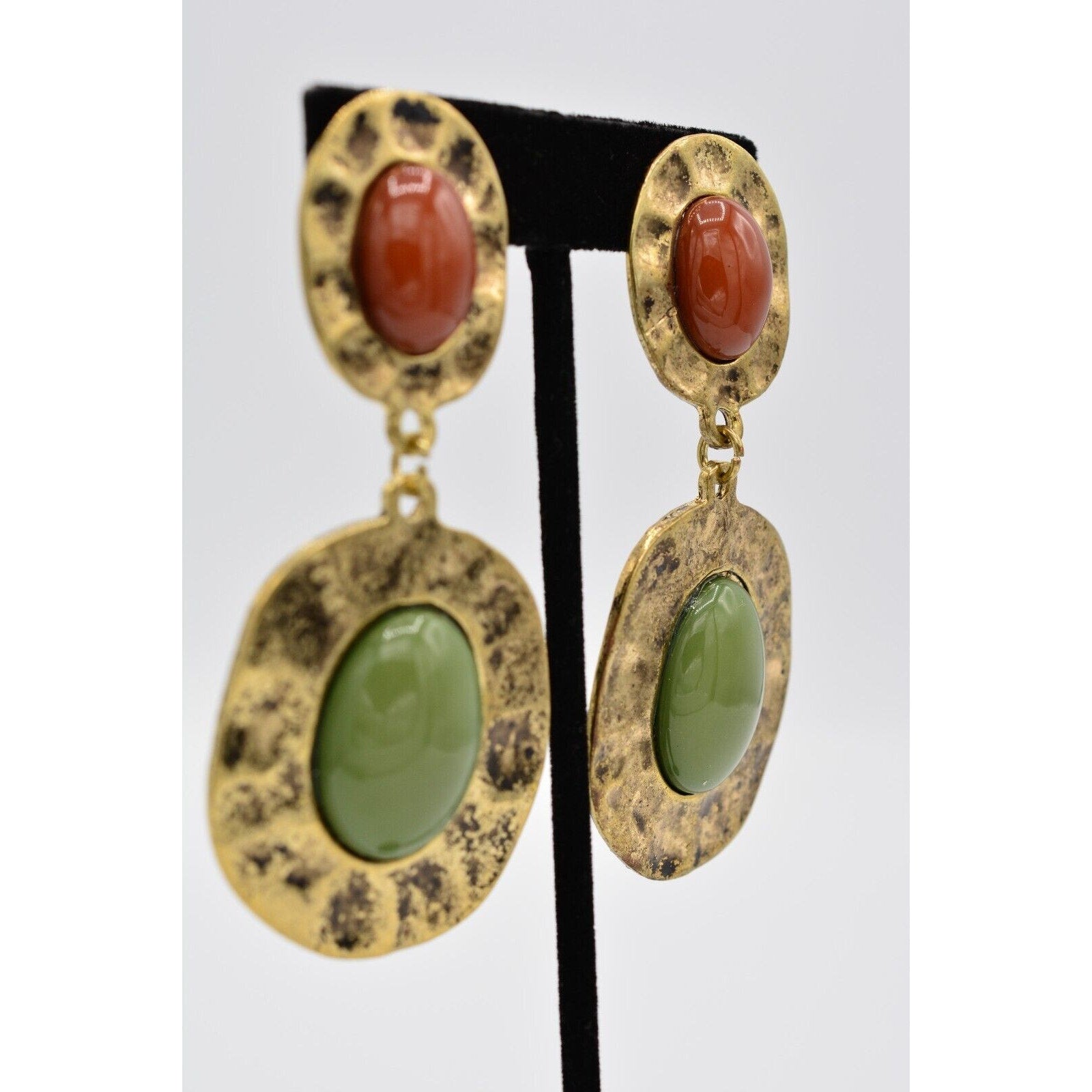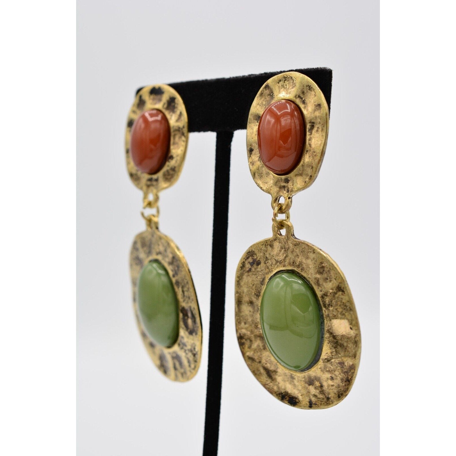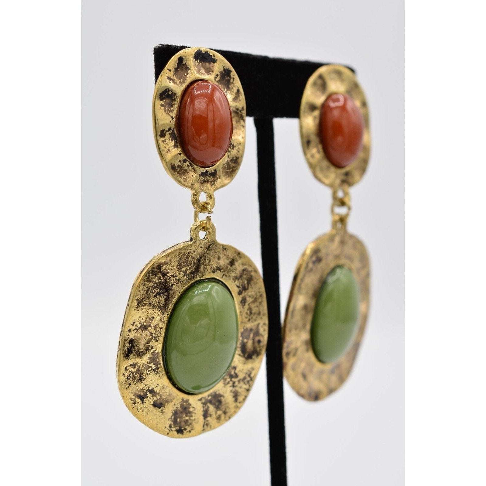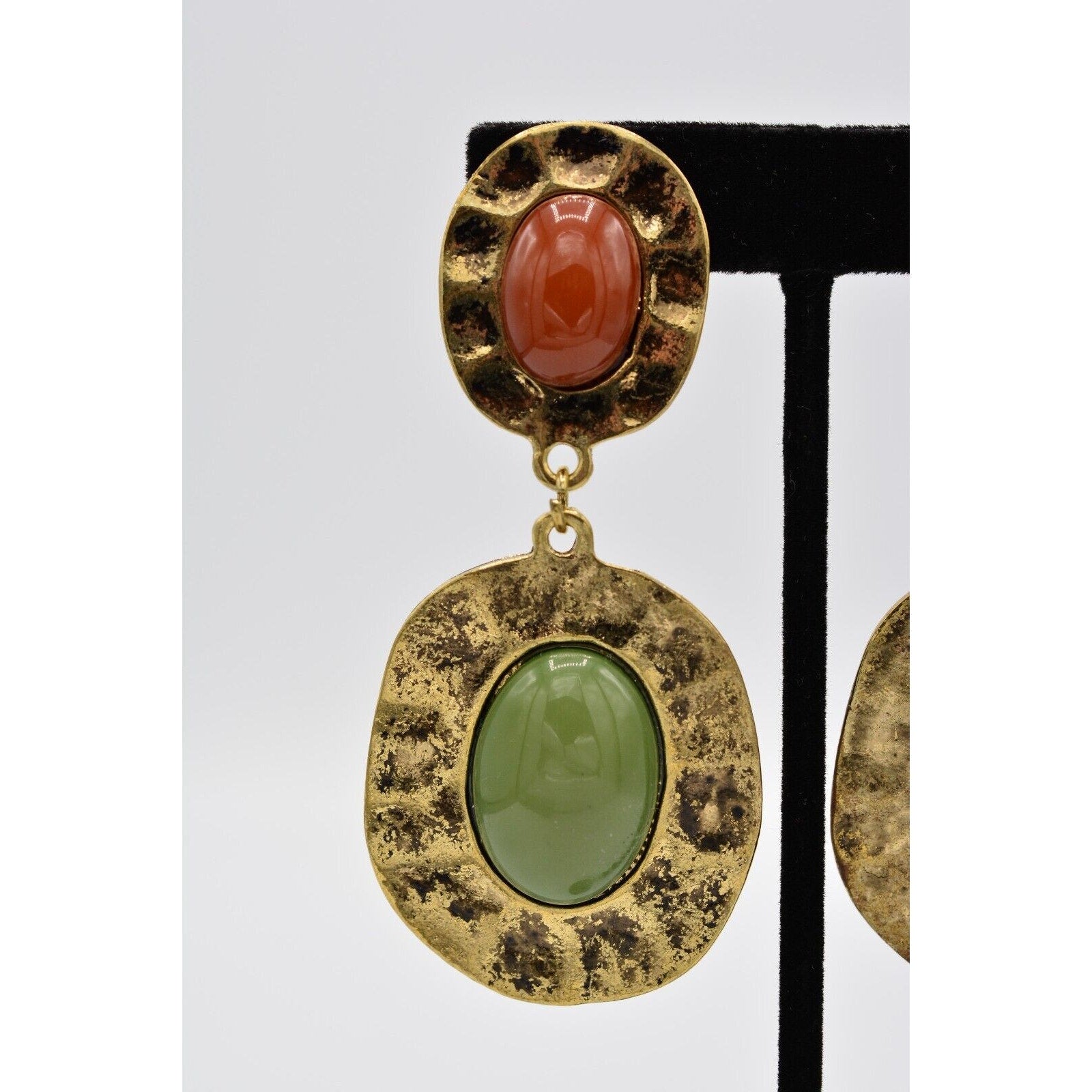Vintage chunky dangle earrings featuring a green and orange lucite cabochon in an antiqued gold setting.