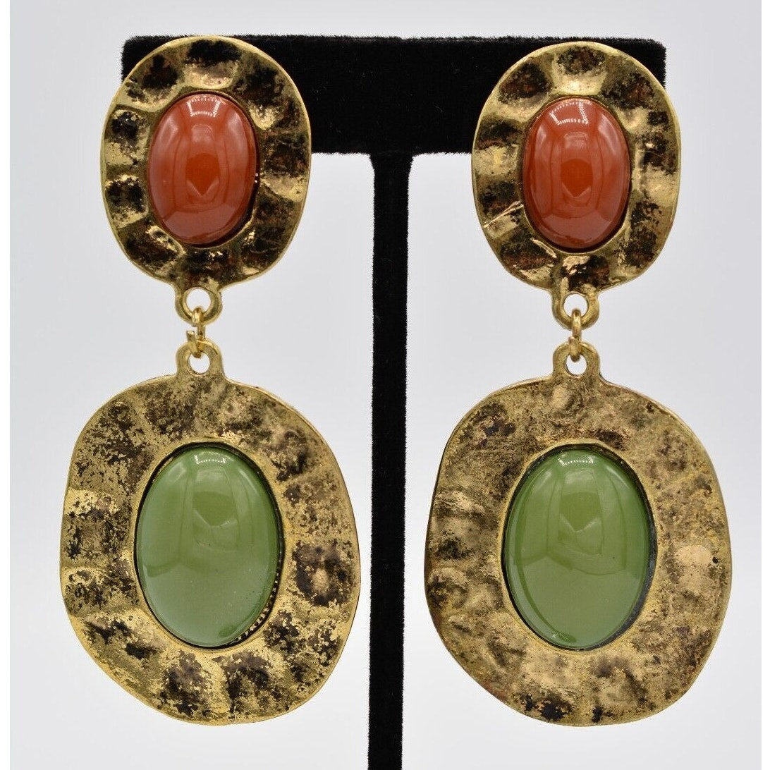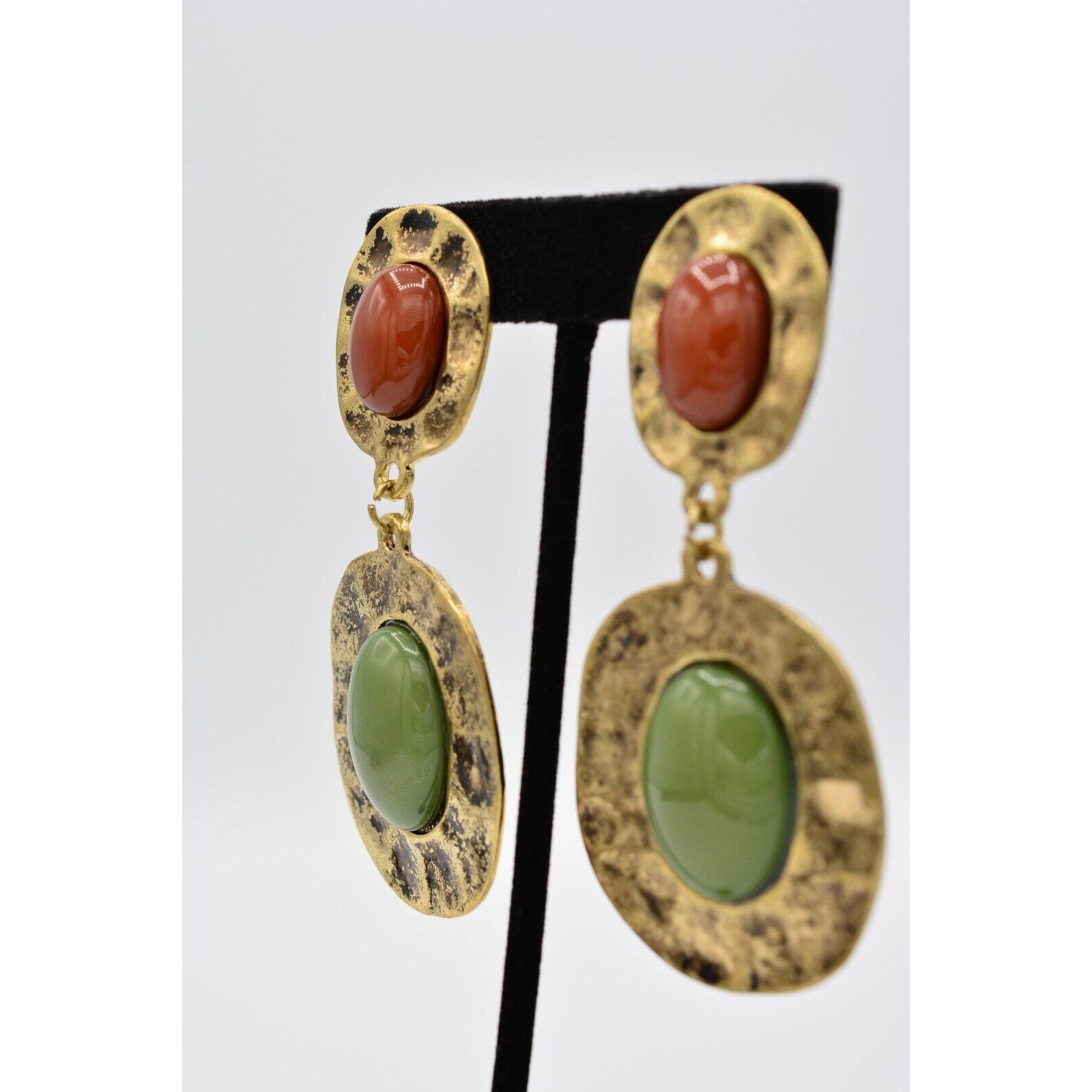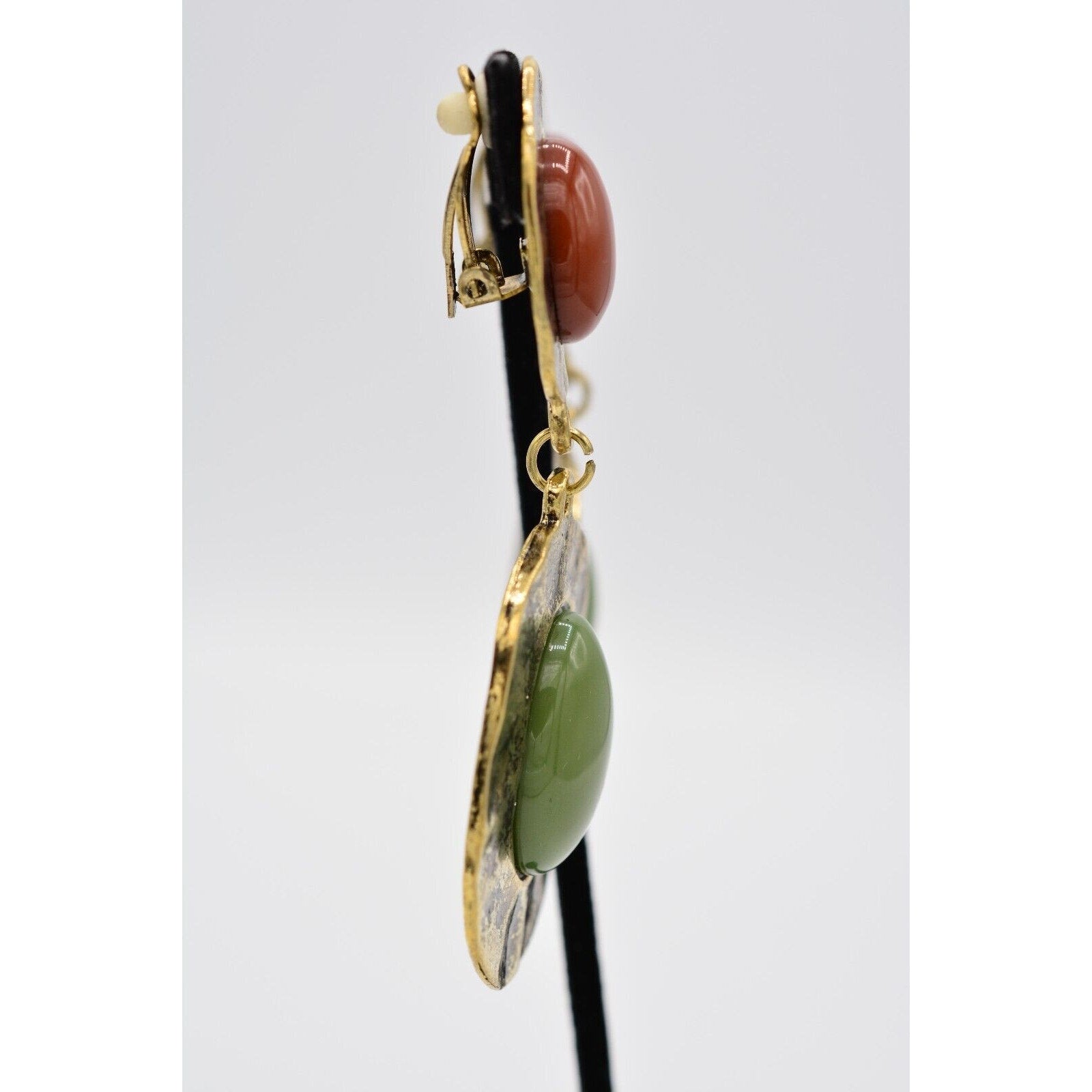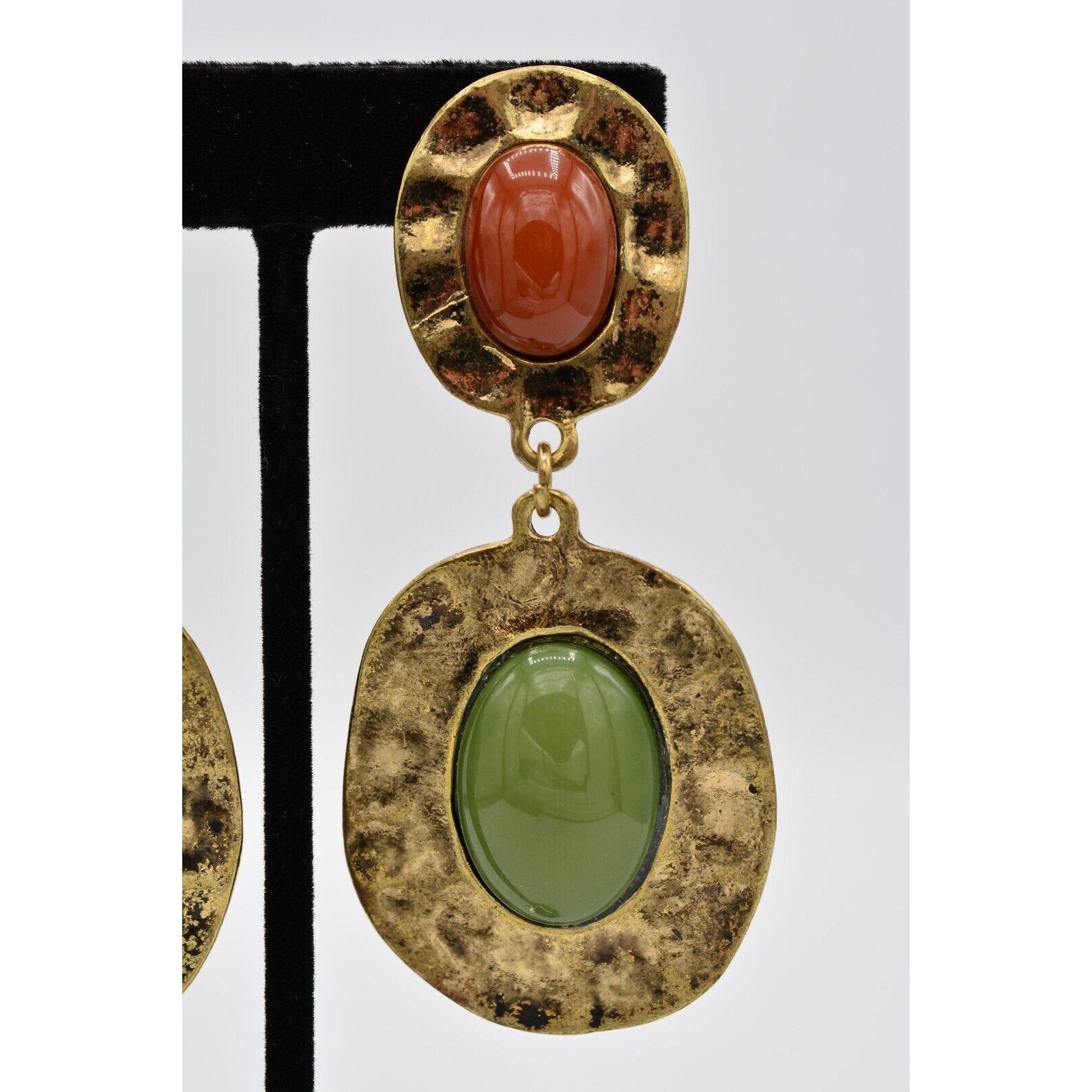 Vintage chunky dangle earrings featuring a green and orange lucite cabochon in an antiqued gold setting.