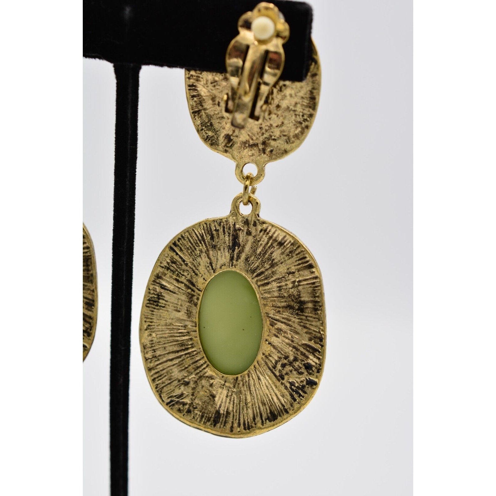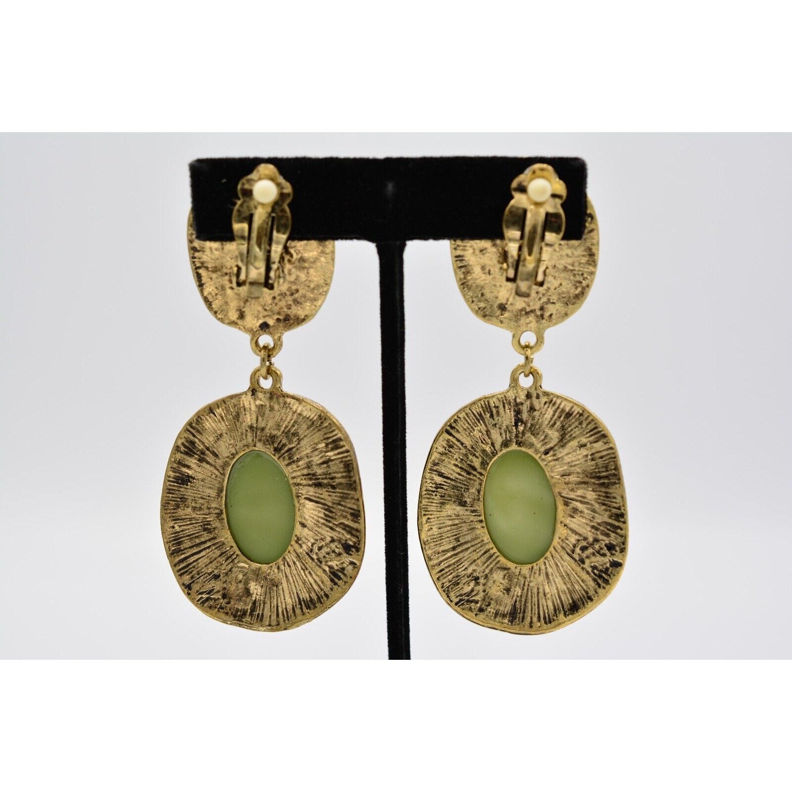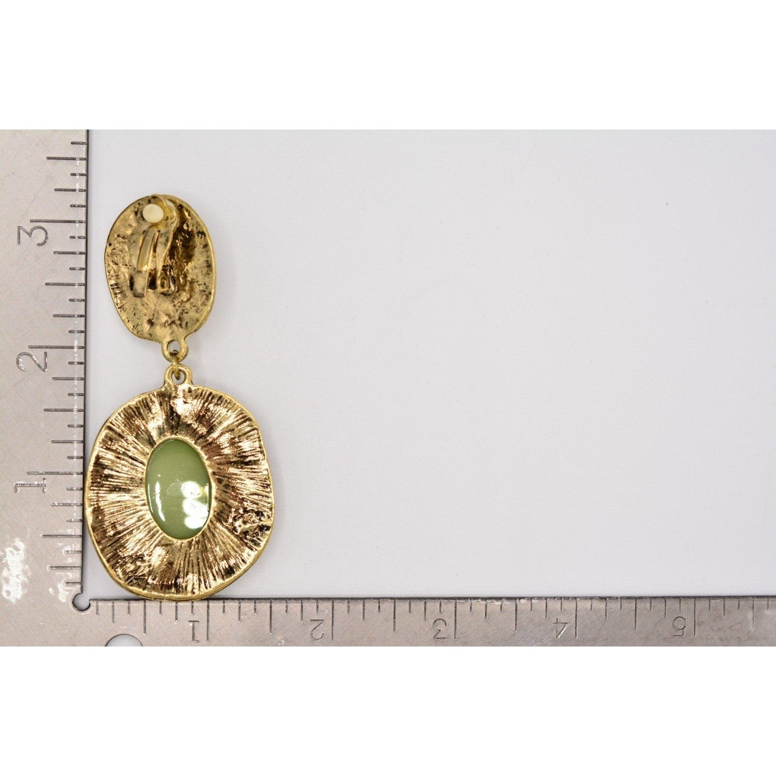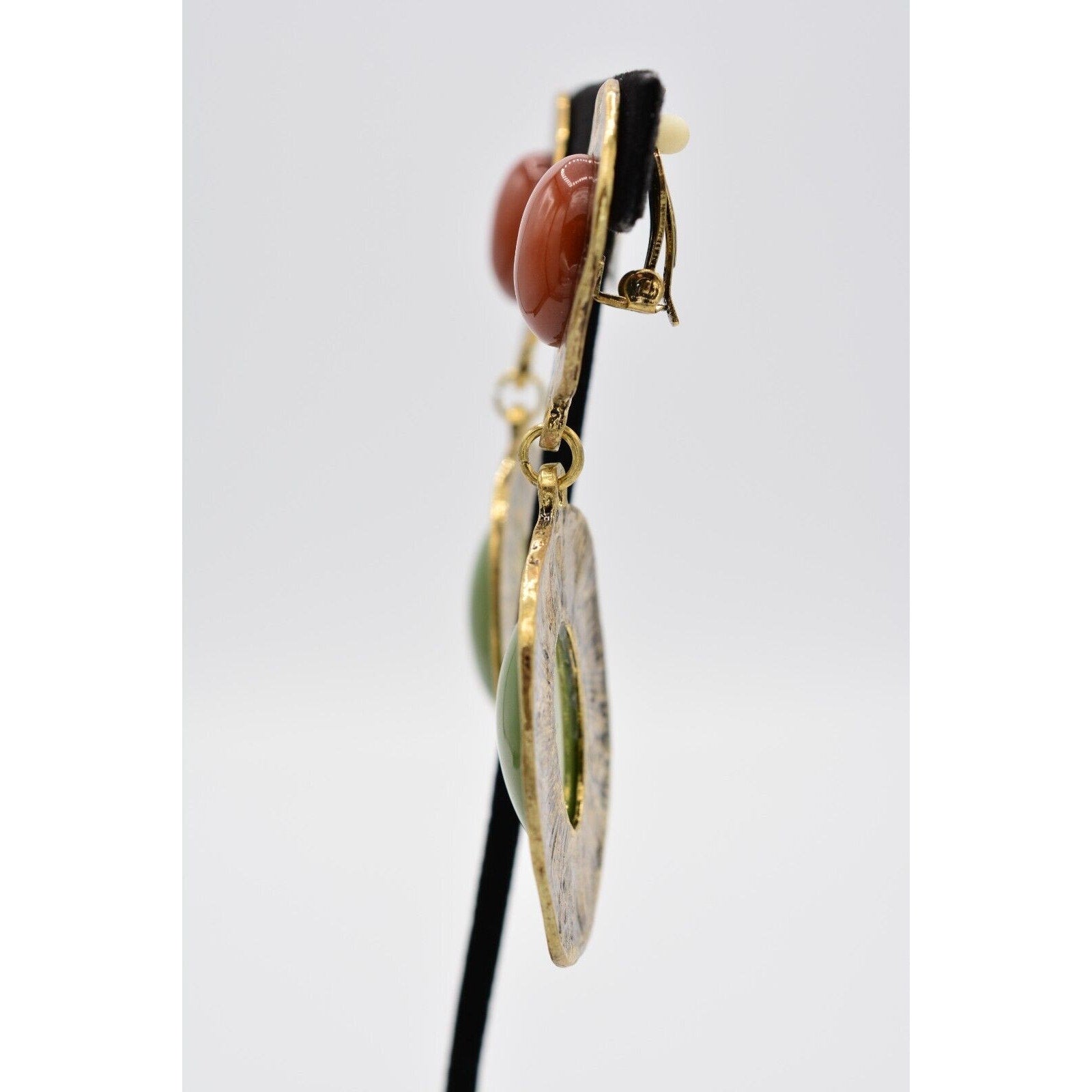 Vintage chunky dangle earrings featuring a green and orange lucite cabochon in an antiqued gold setting.