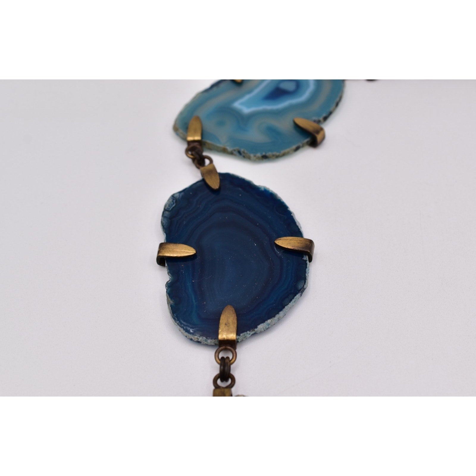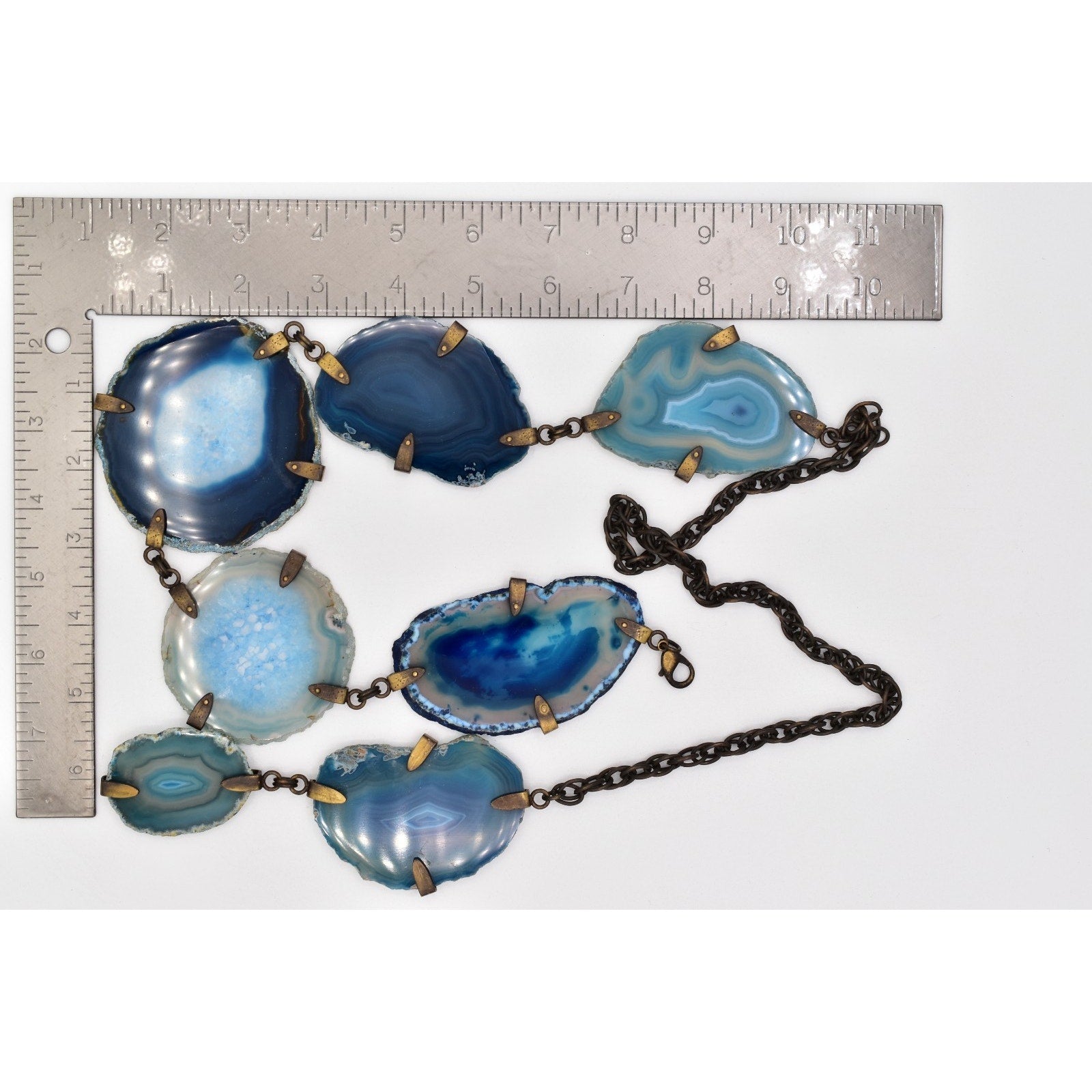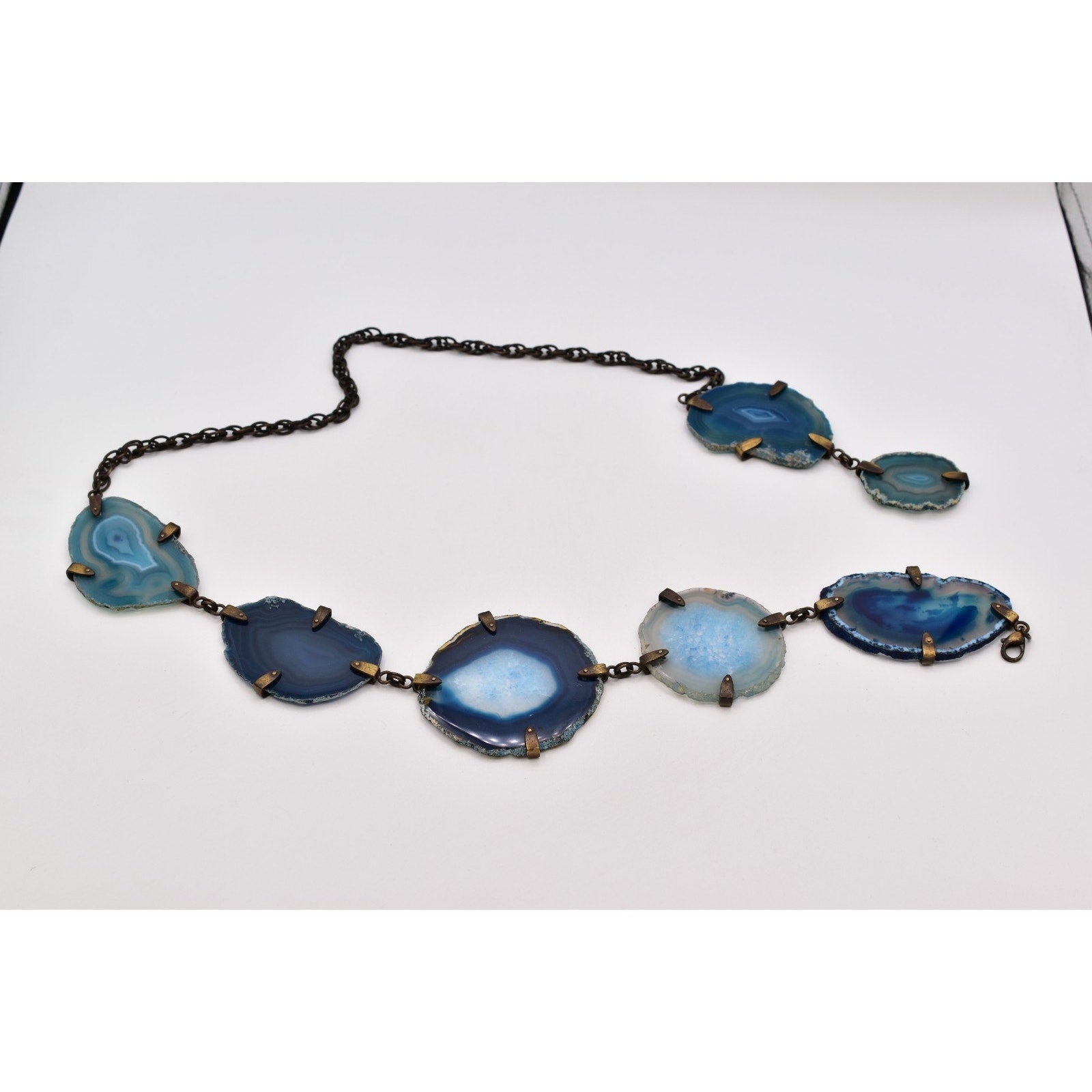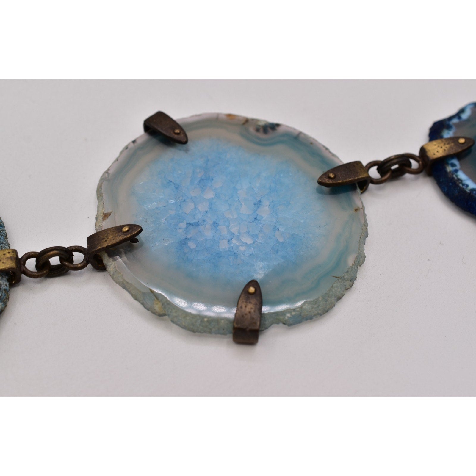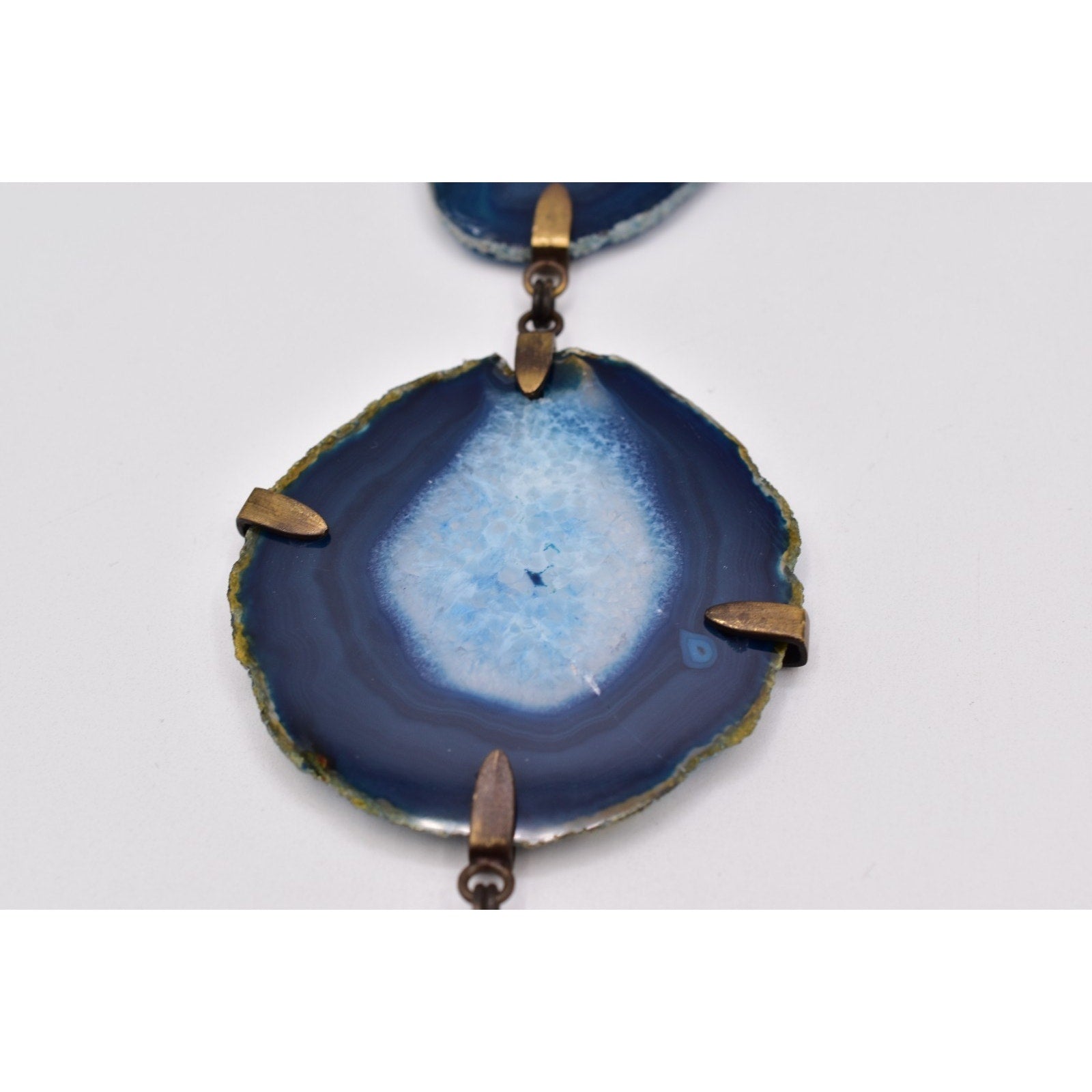 Beautiful vintage statement belt featuring natural blue agate slices linked together with heavy gold-tone connectors. Each stone is unique, showcasing organic patterns, rich color, and natural texture. A bold 1970s accessory that can be worn at the waist or hips for a striking boho-meets-glam look.