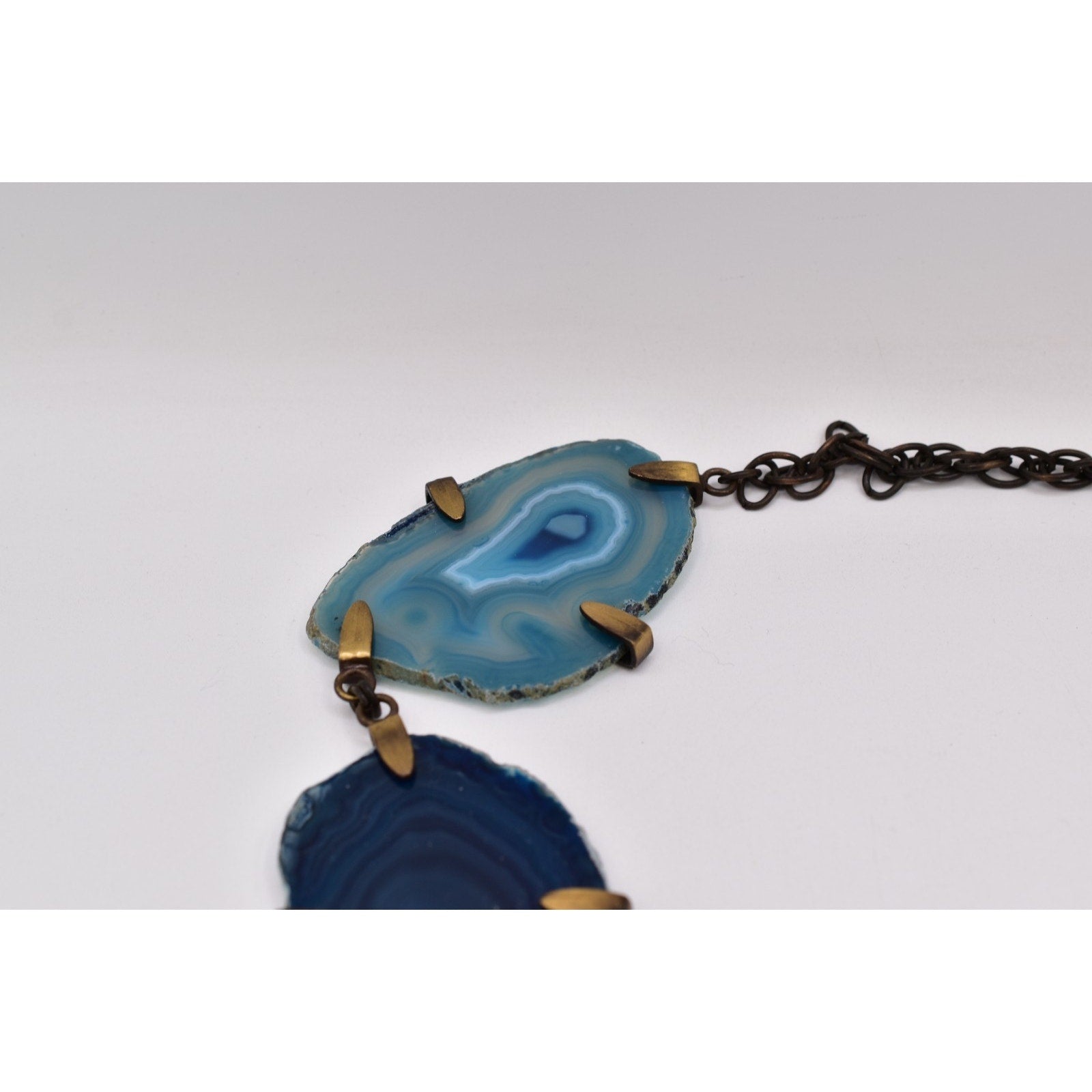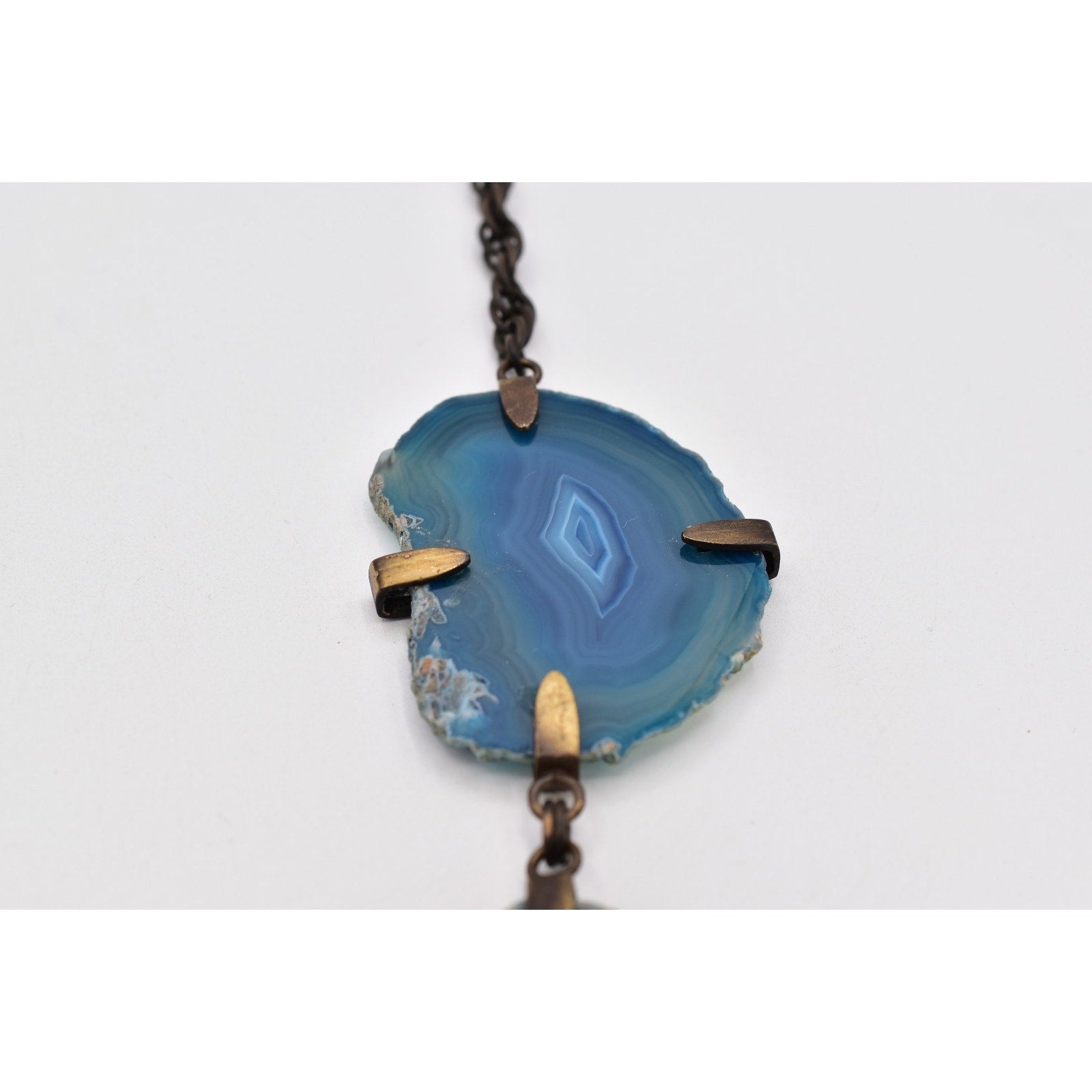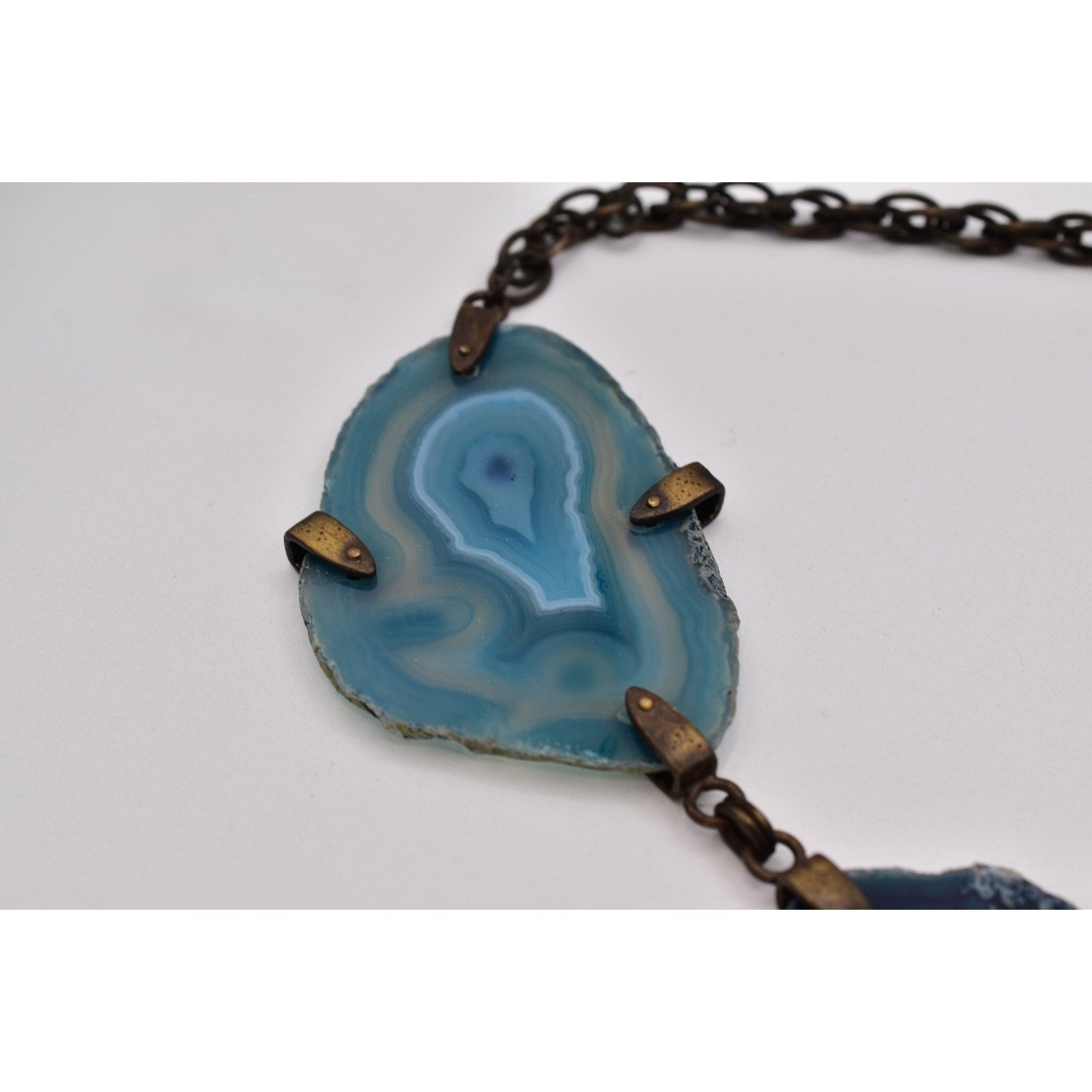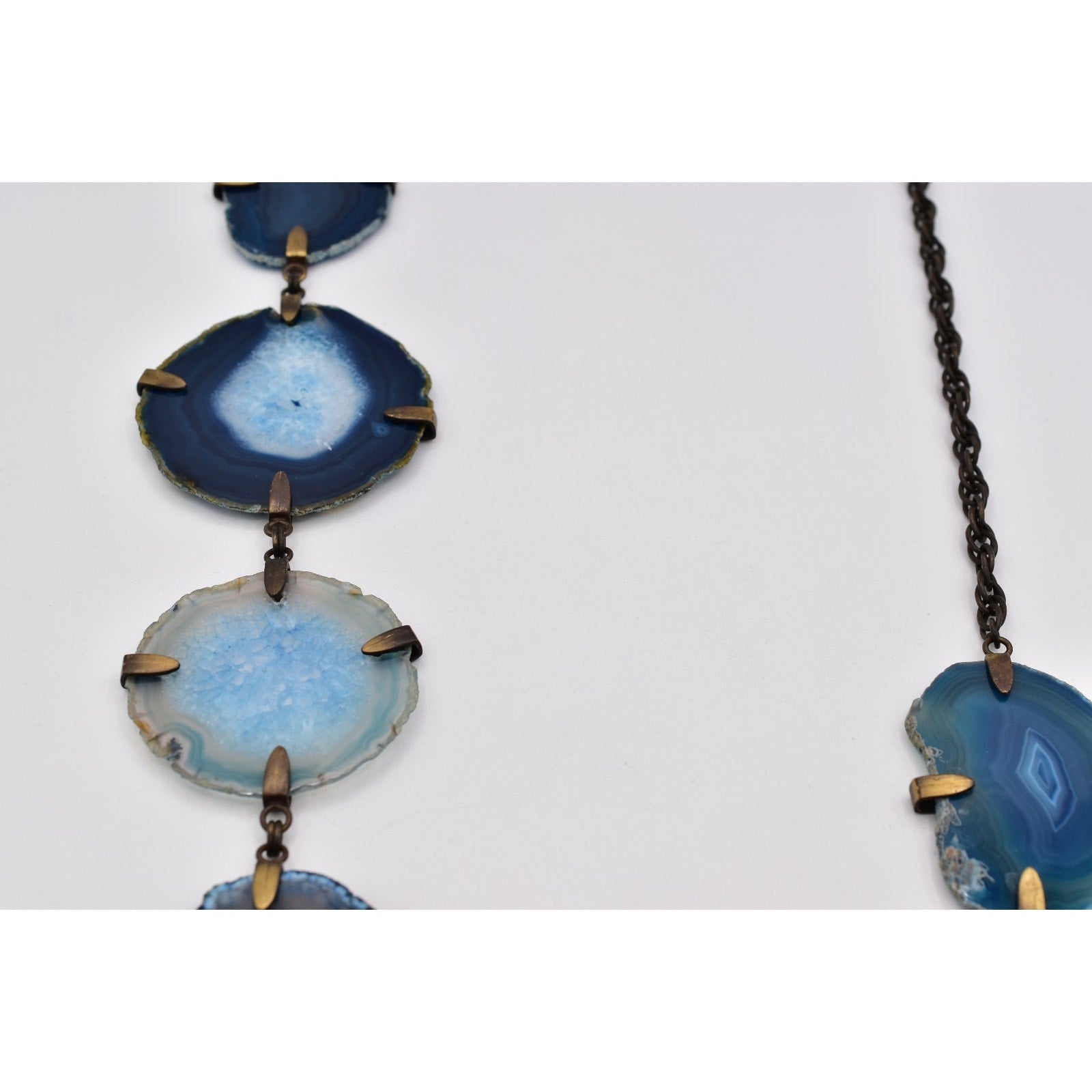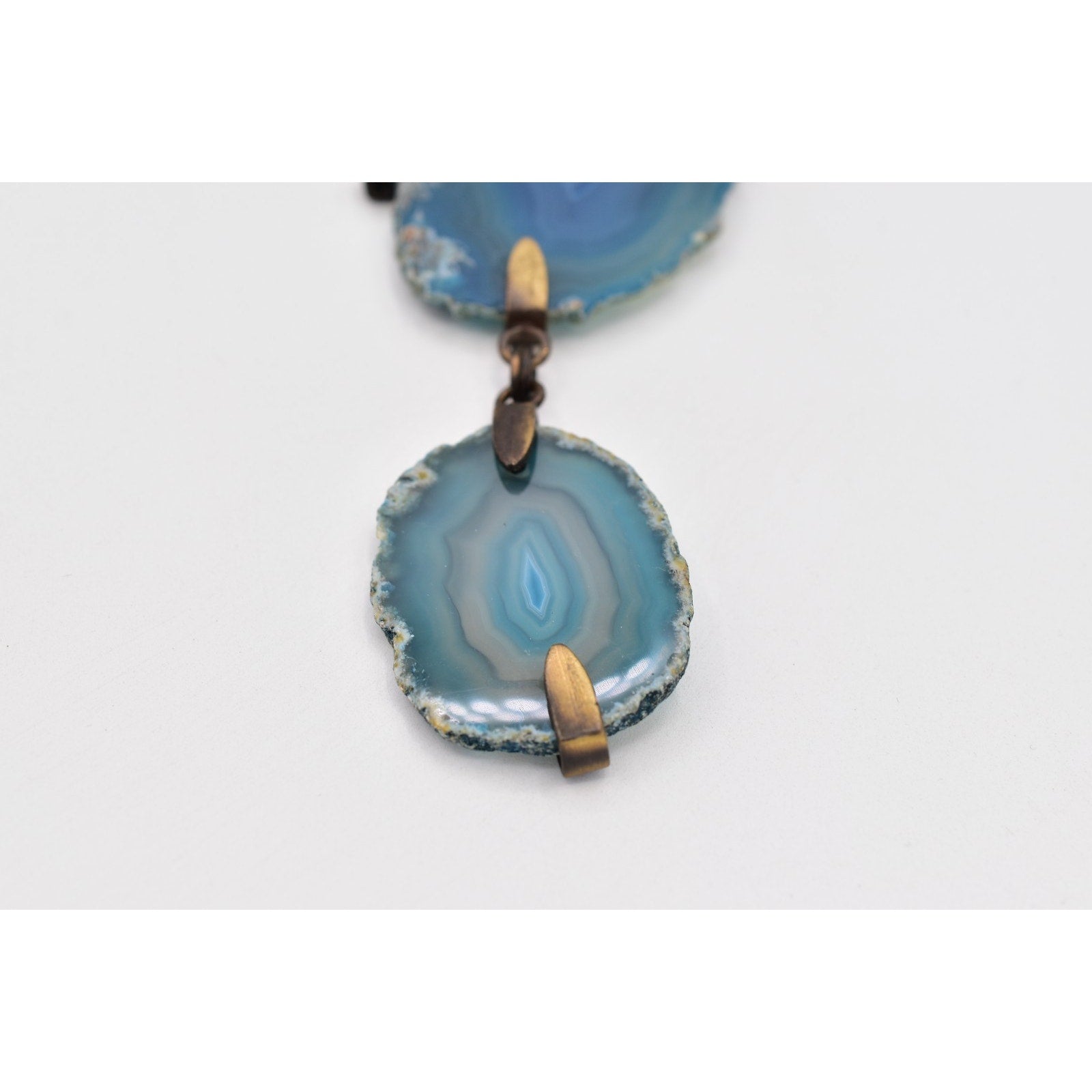 Beautiful vintage statement belt featuring natural blue agate slices linked together with heavy gold-tone connectors. Each stone is unique, showcasing organic patterns, rich color, and natural texture. A bold 1970s accessory that can be worn at the waist or hips for a striking boho-meets-glam look.