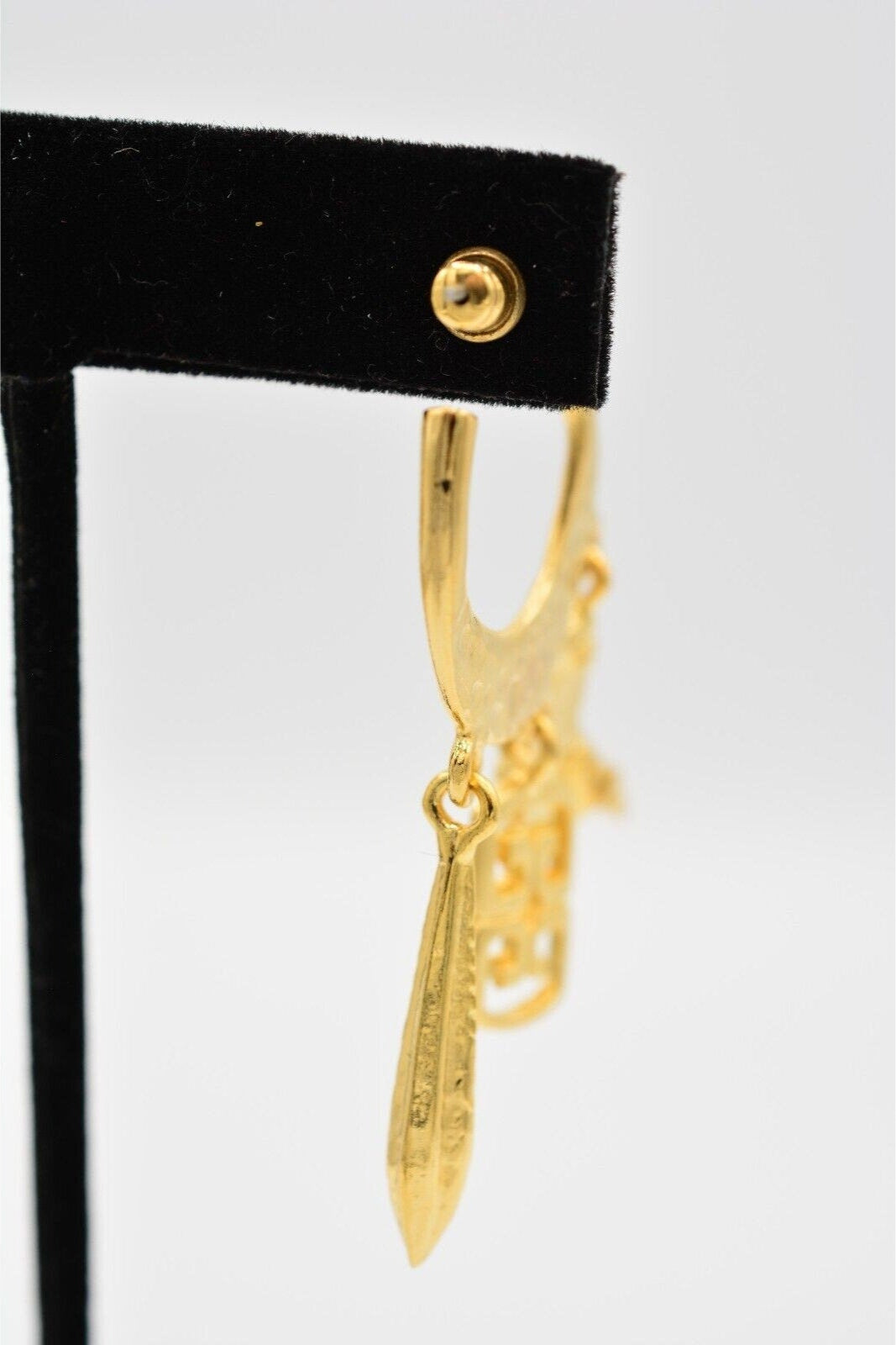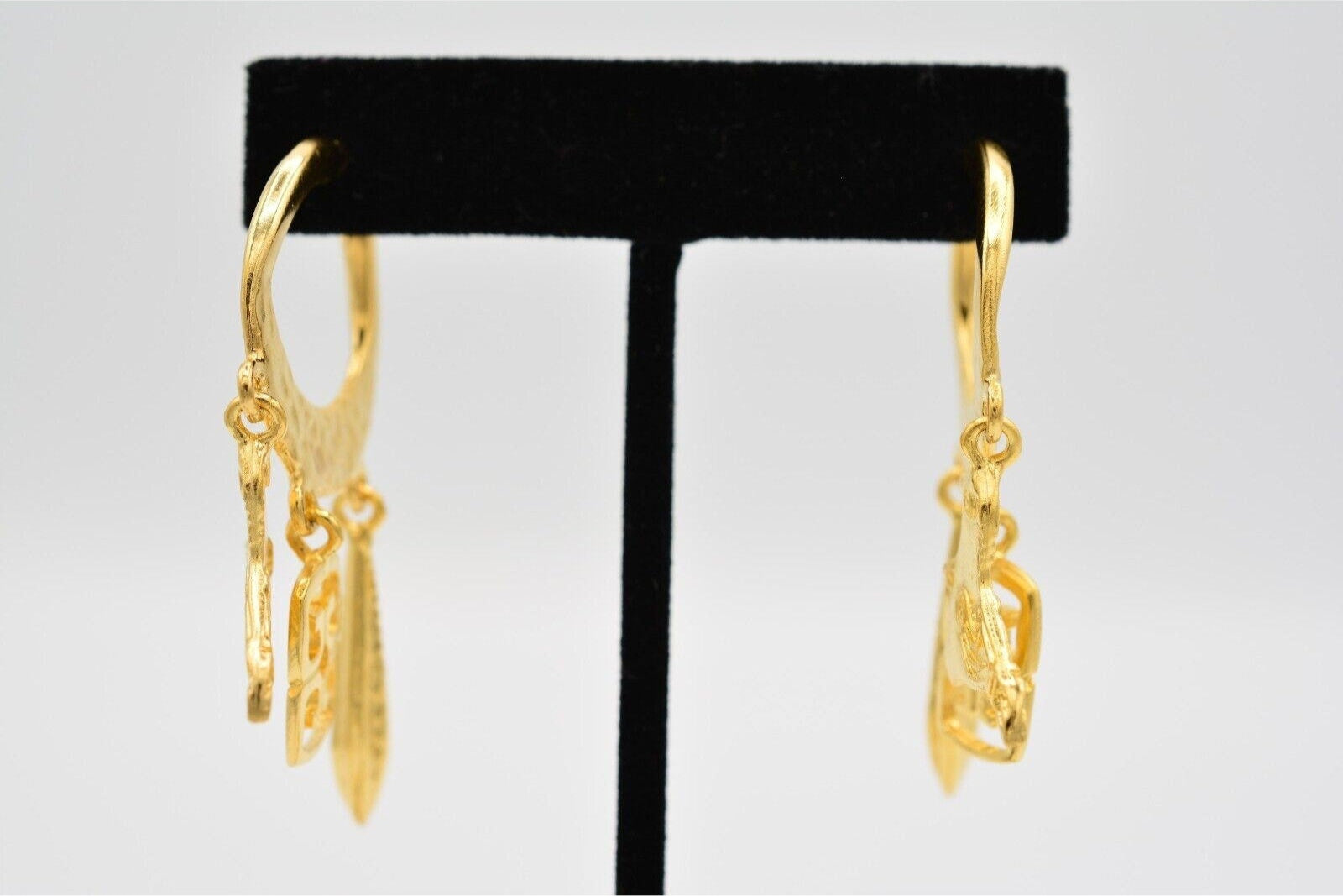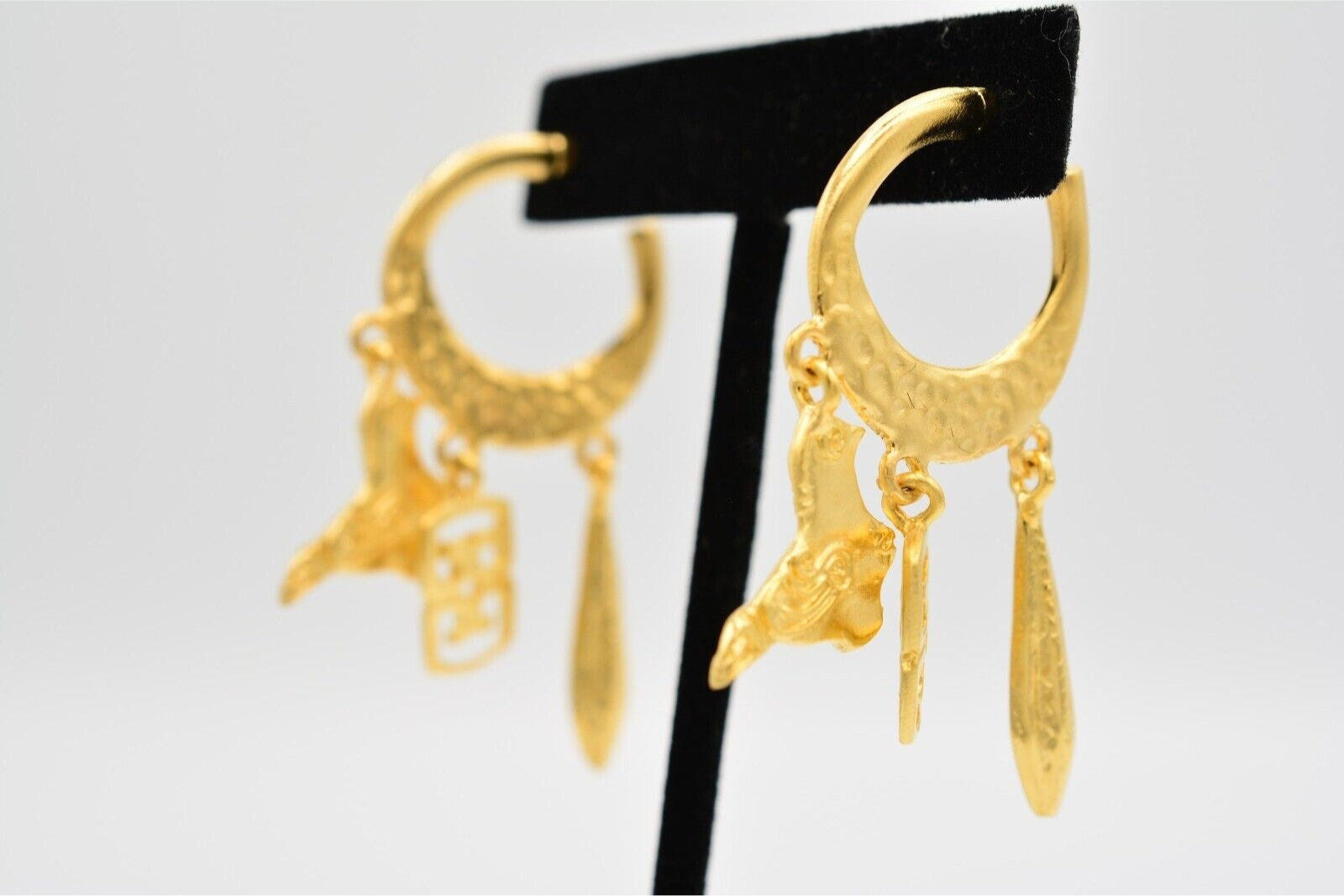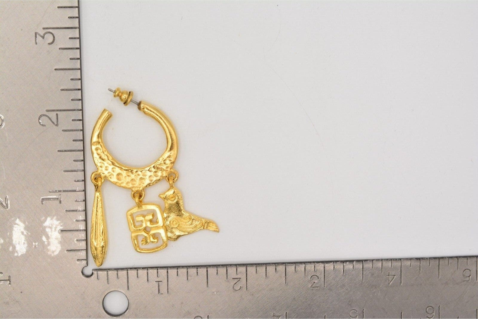 Vintage hoop earrings in a satin brushed gold featuring 3 charms.