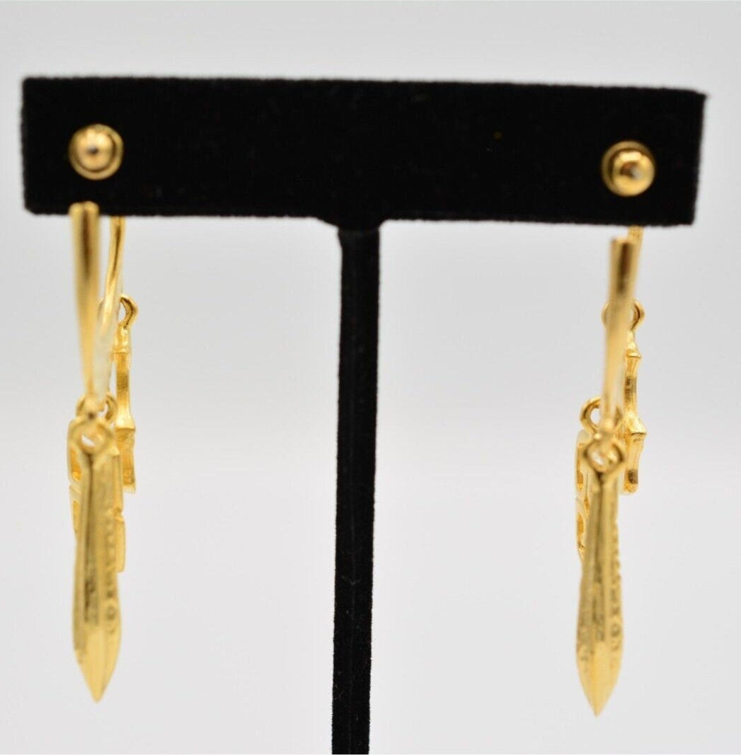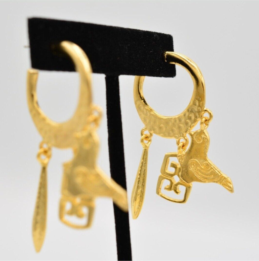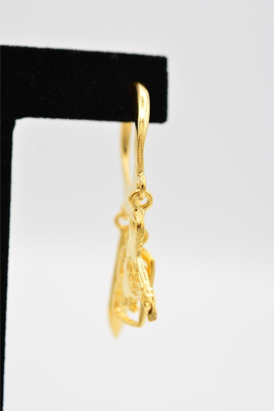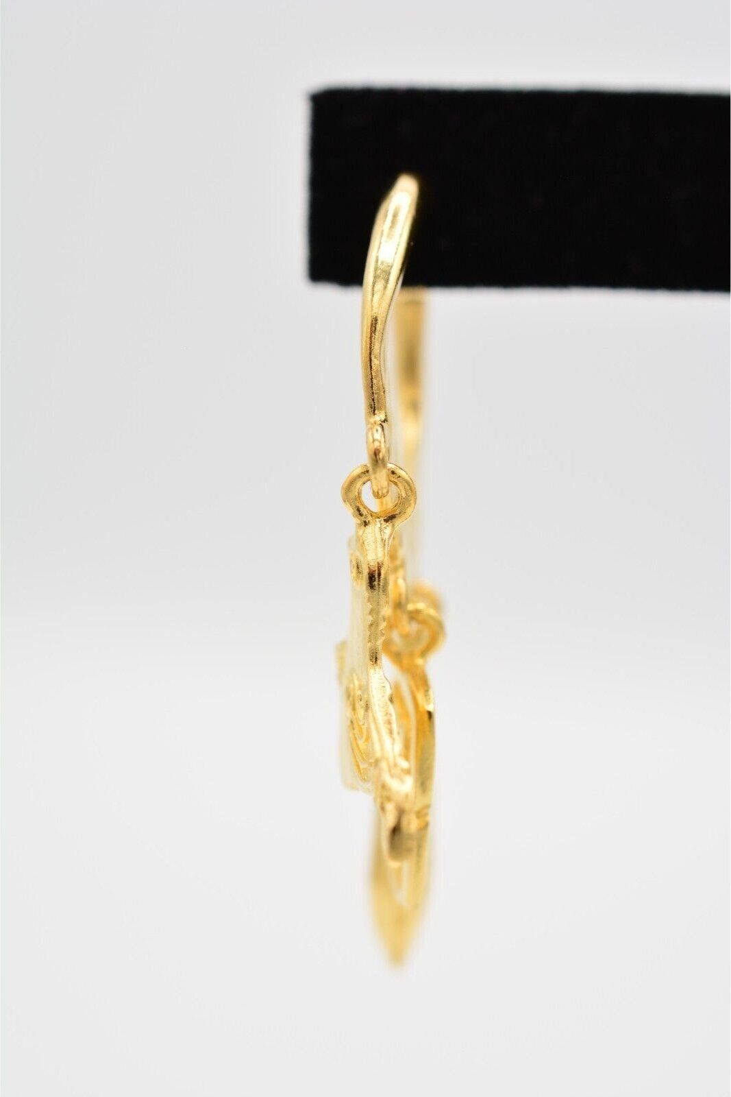 Vintage hoop earrings in a satin brushed gold featuring 3 charms.