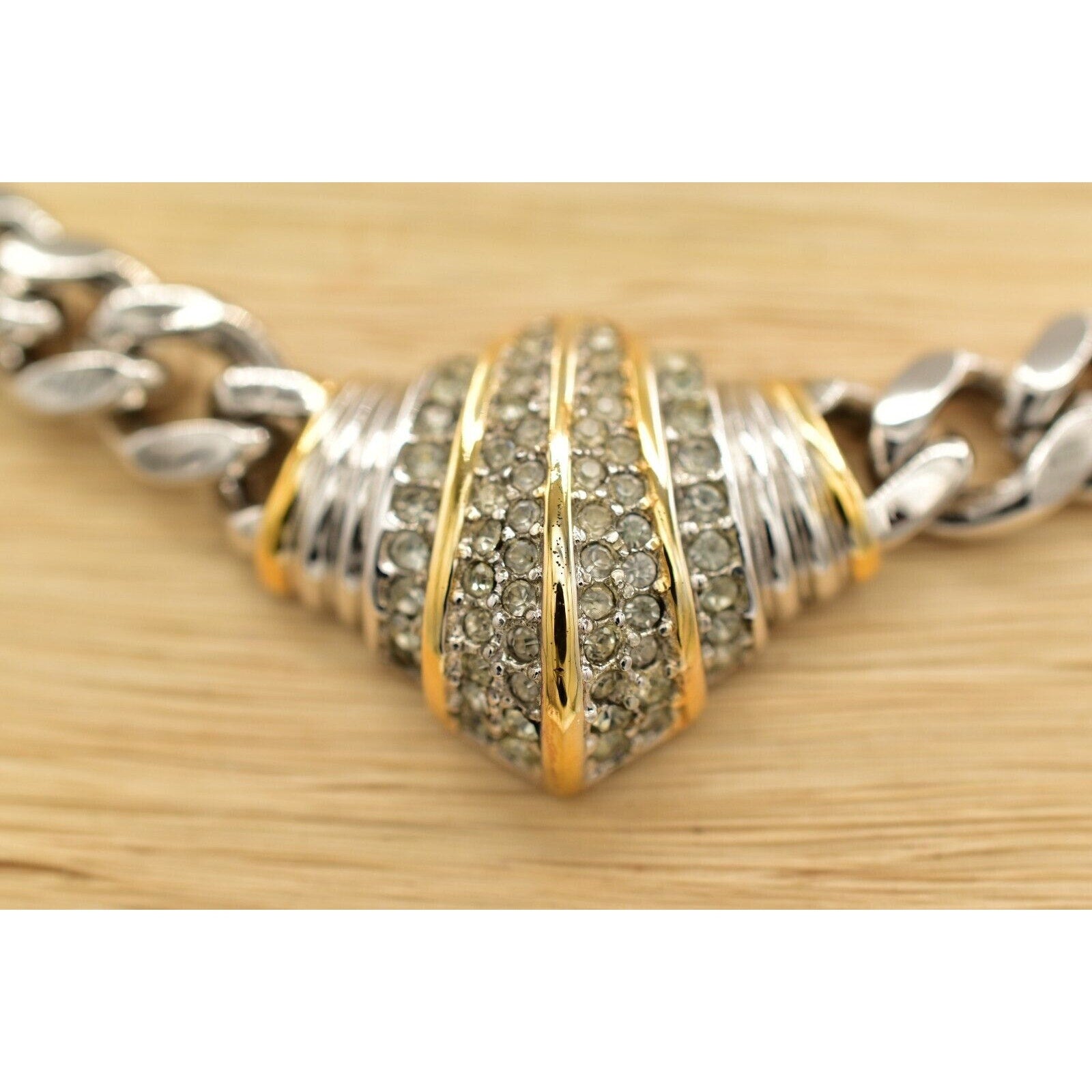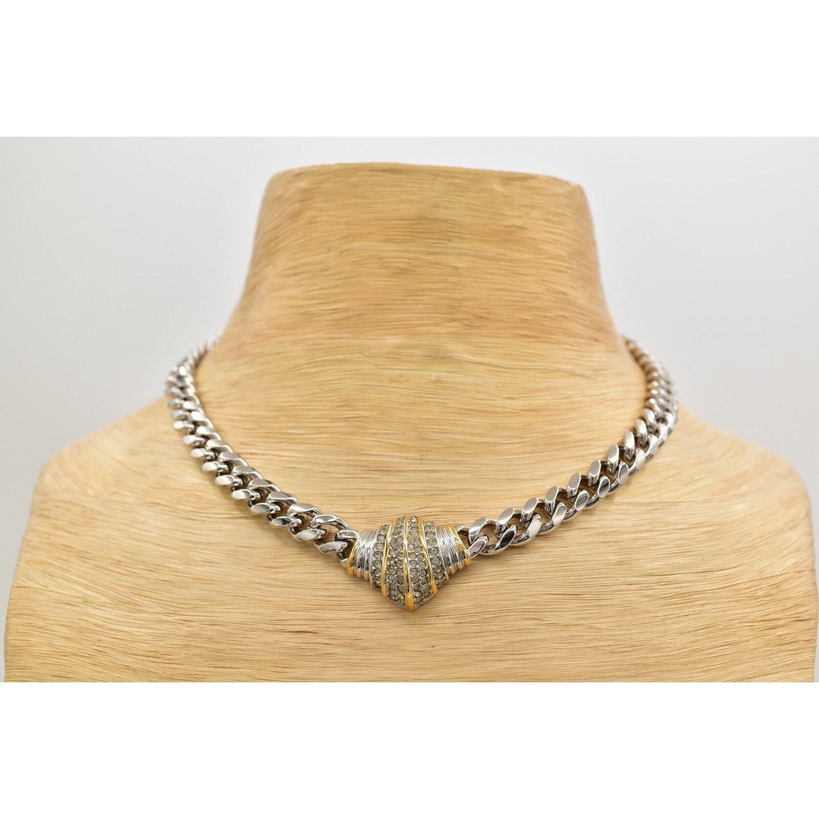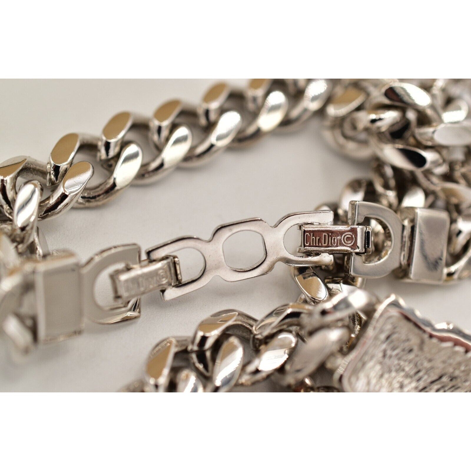 A striking vintage Christian Dior necklace featuring a bold silver-tone curb chain finished with a sparkling rhinestone barrel clasp. Timeless designer glamour with a modern edge—perfect worn solo or layered.