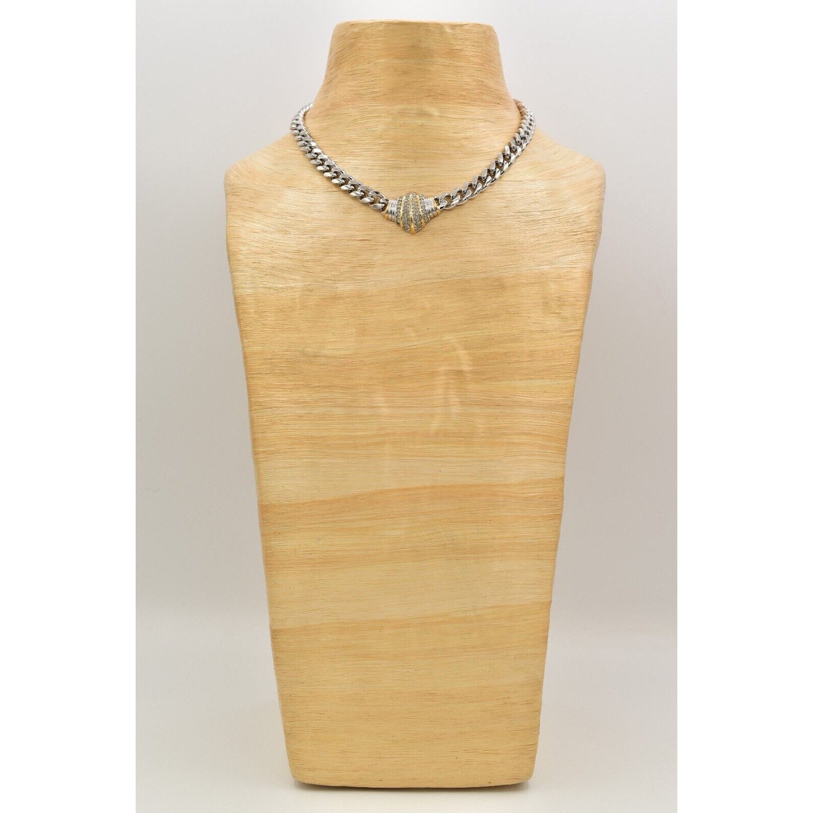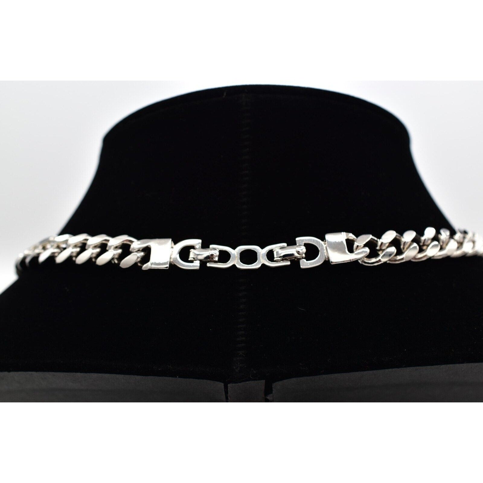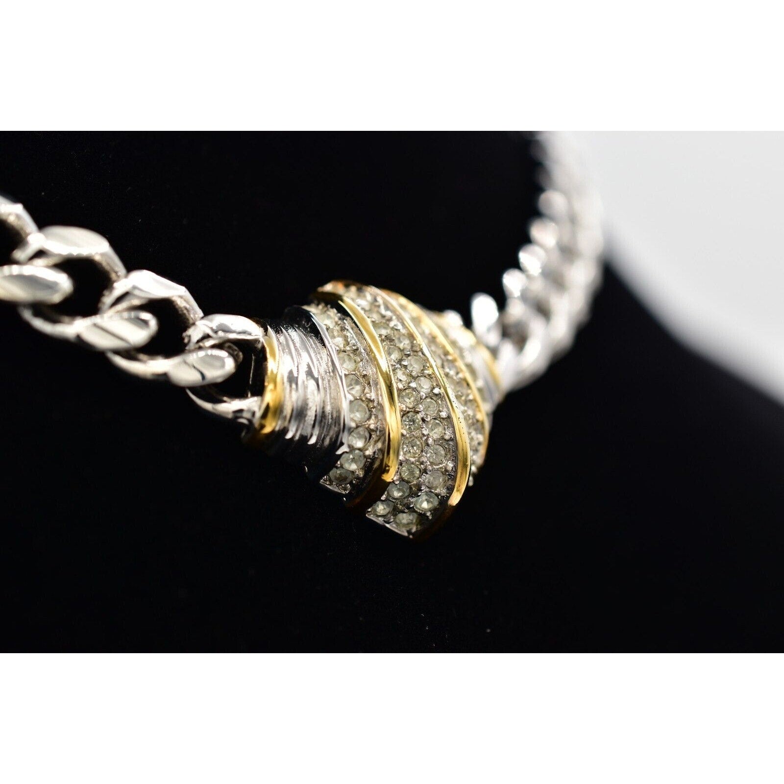 A striking vintage Christian Dior necklace featuring a bold silver-tone curb chain finished with a sparkling rhinestone barrel clasp. Timeless designer glamour with a modern edge—perfect worn solo or layered.