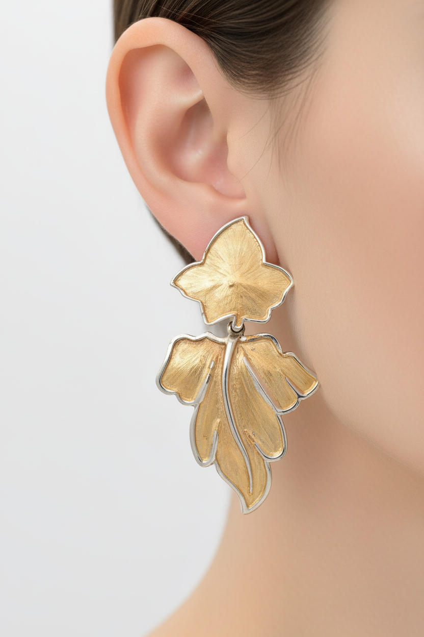 Bold leaf dangle earrings in brushed gold and silver.