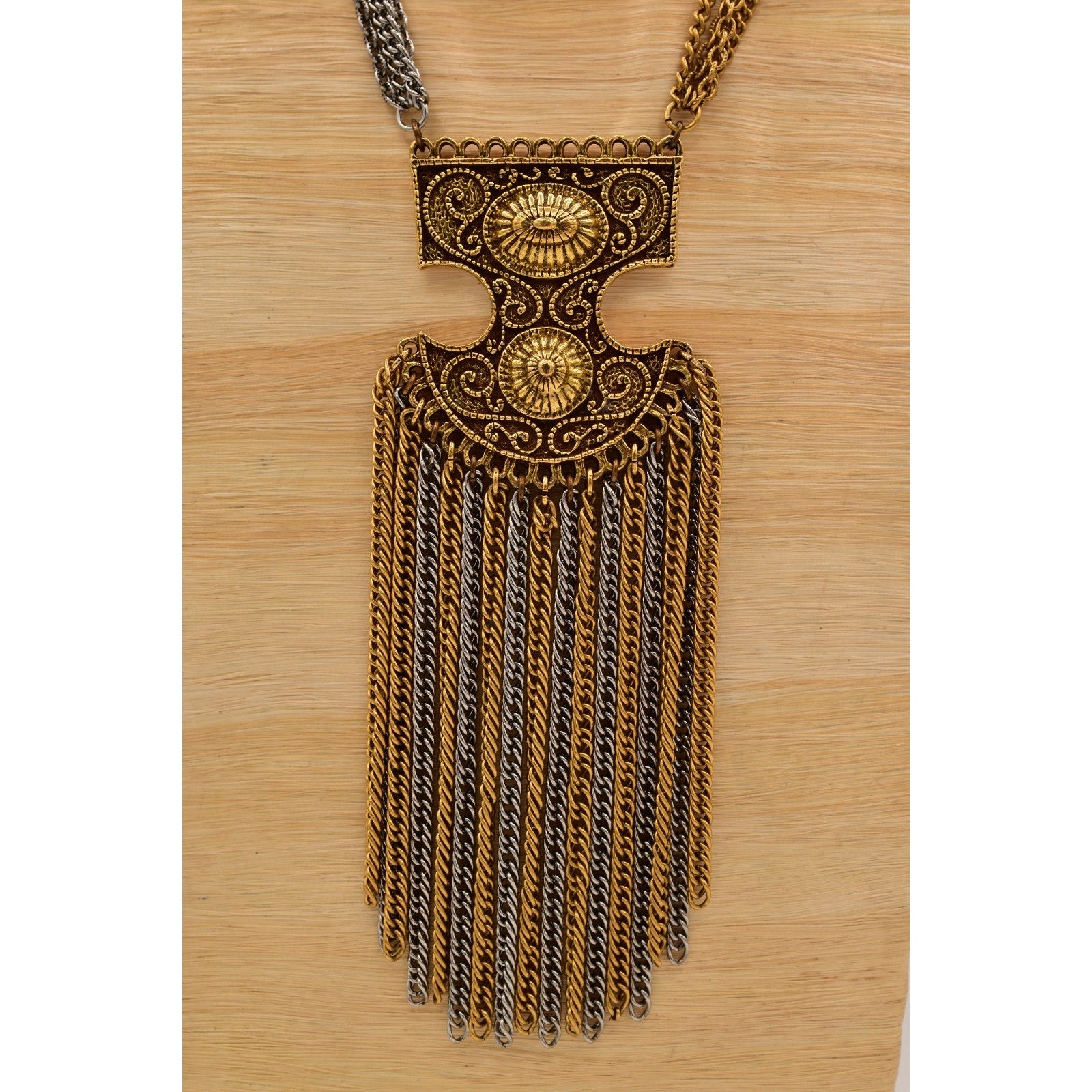 Stunning two-tone pendant necklace featuring ornate filigree and long chain fringe.