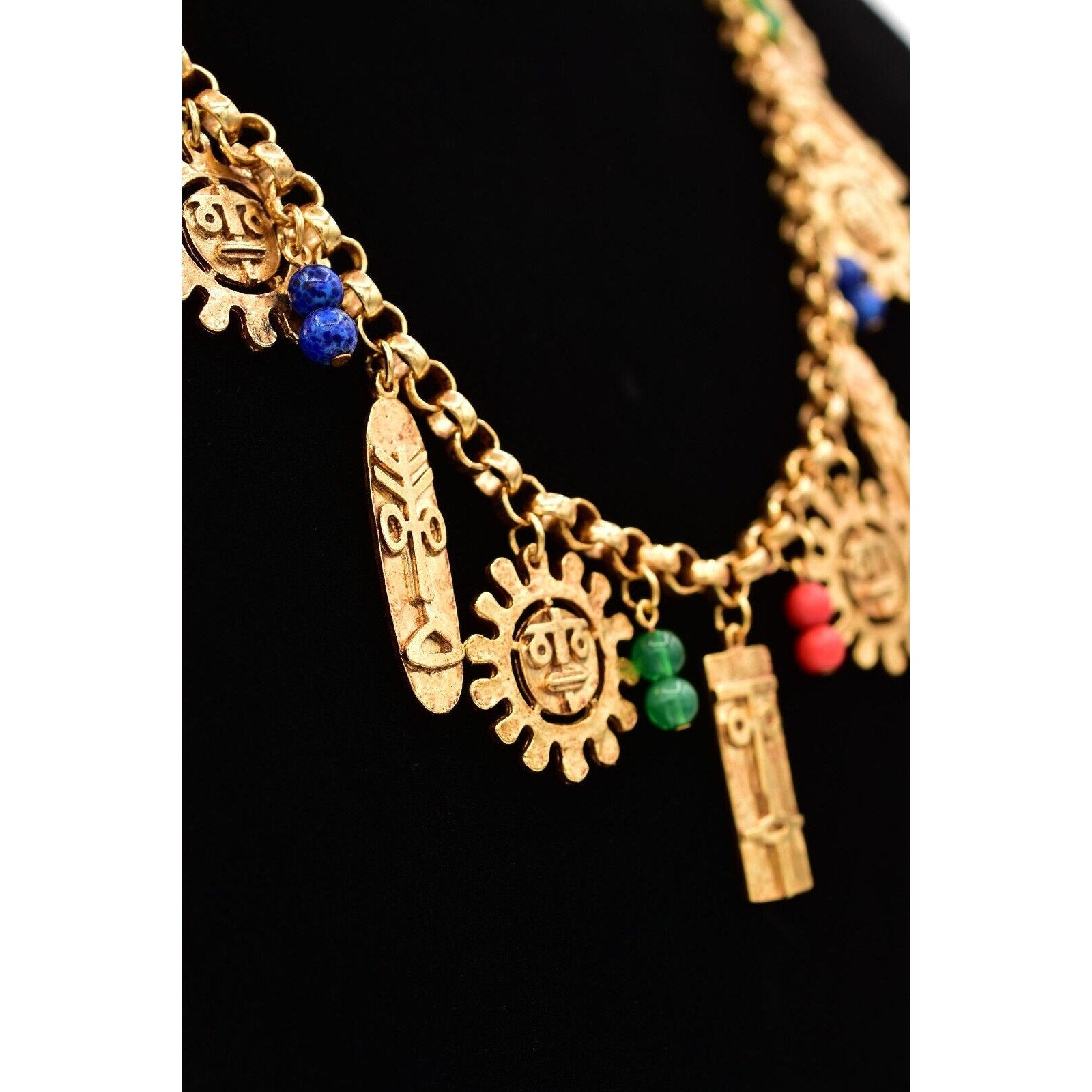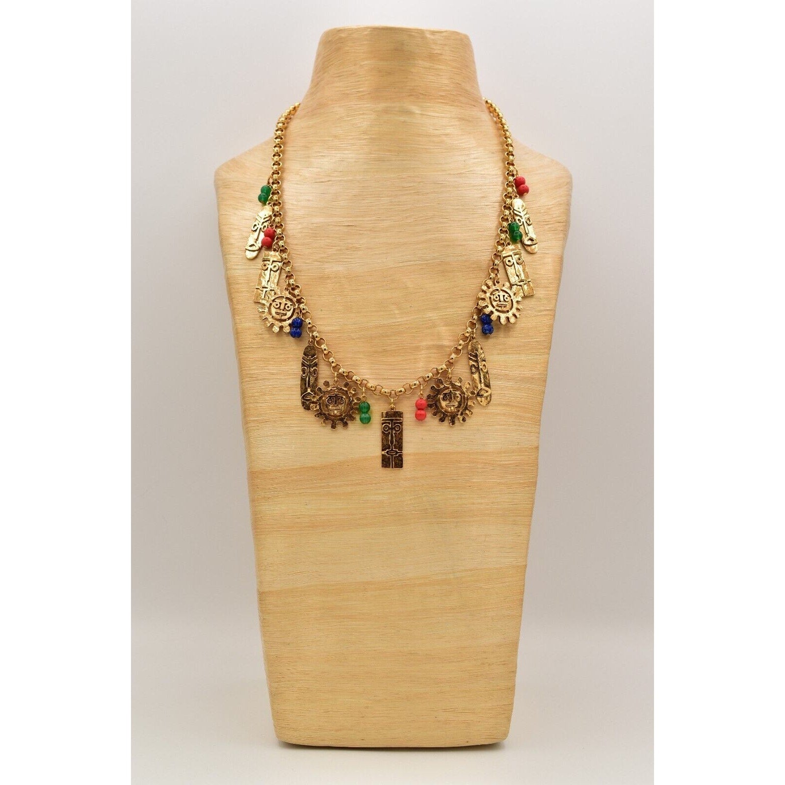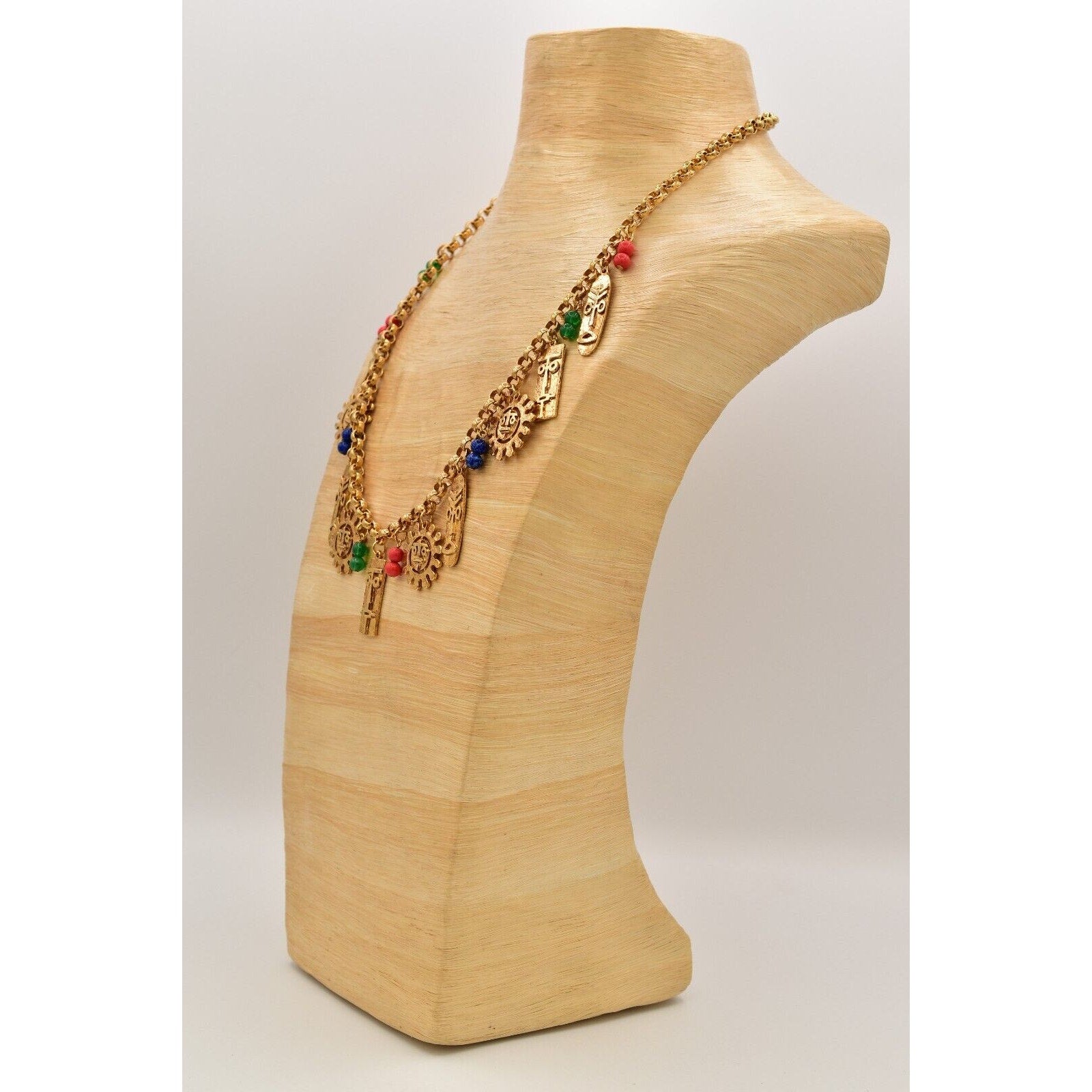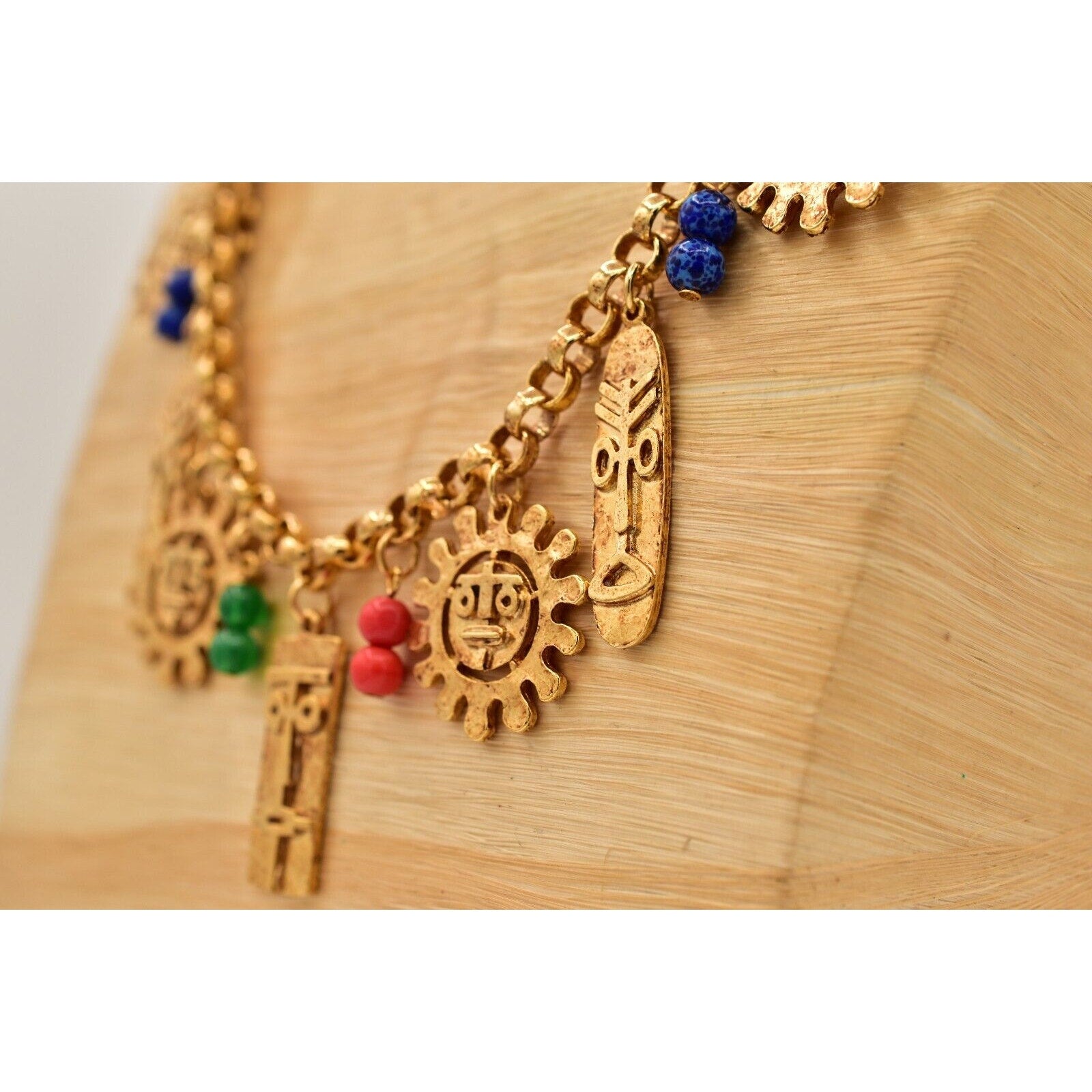 Vintage gold tone necklace featuring suns, masks, and multi-color beads.