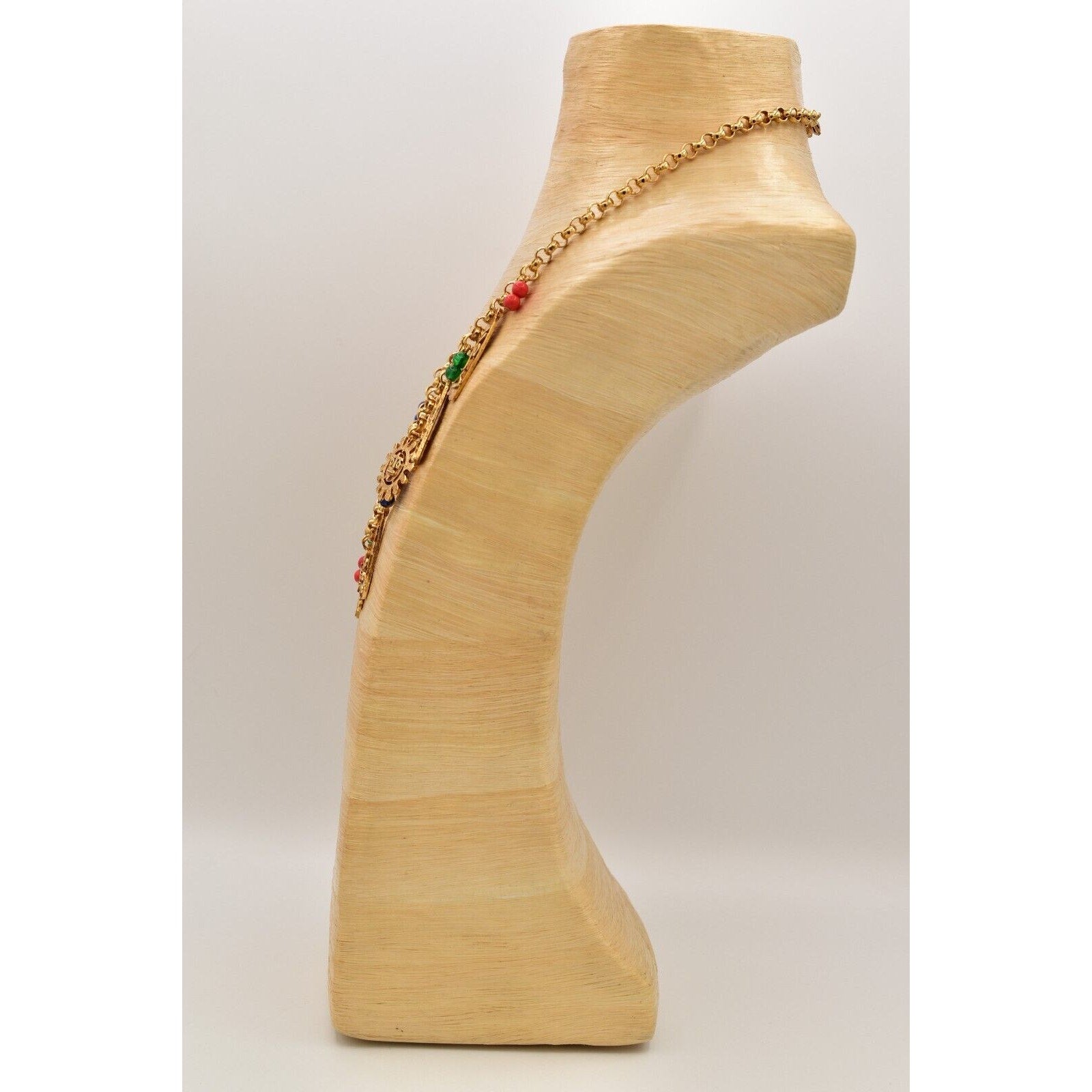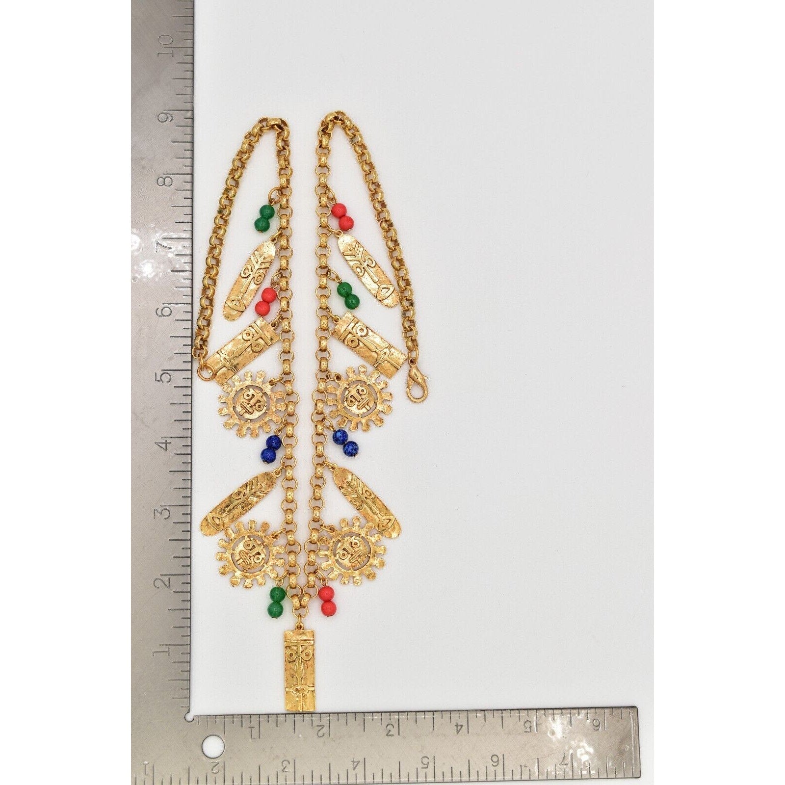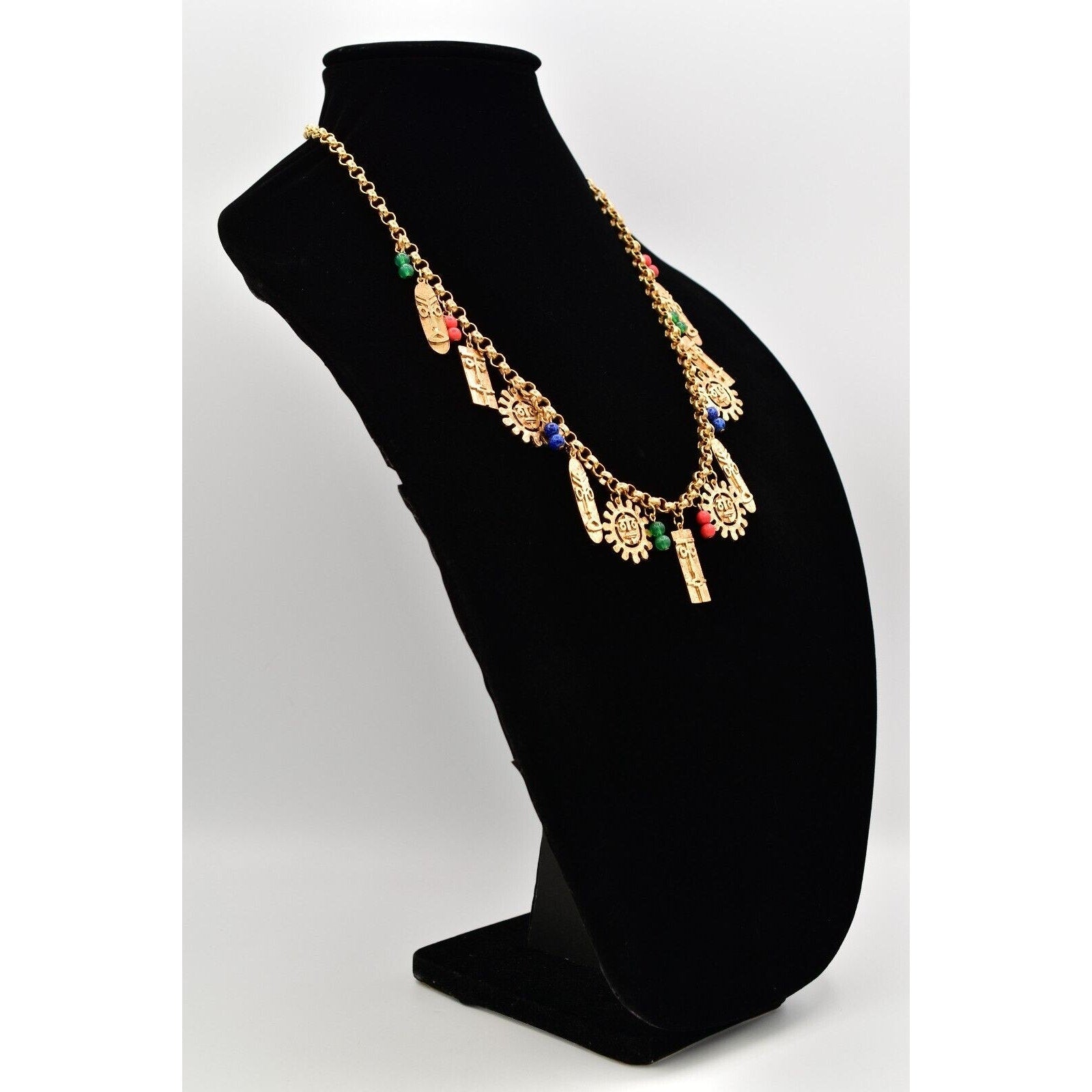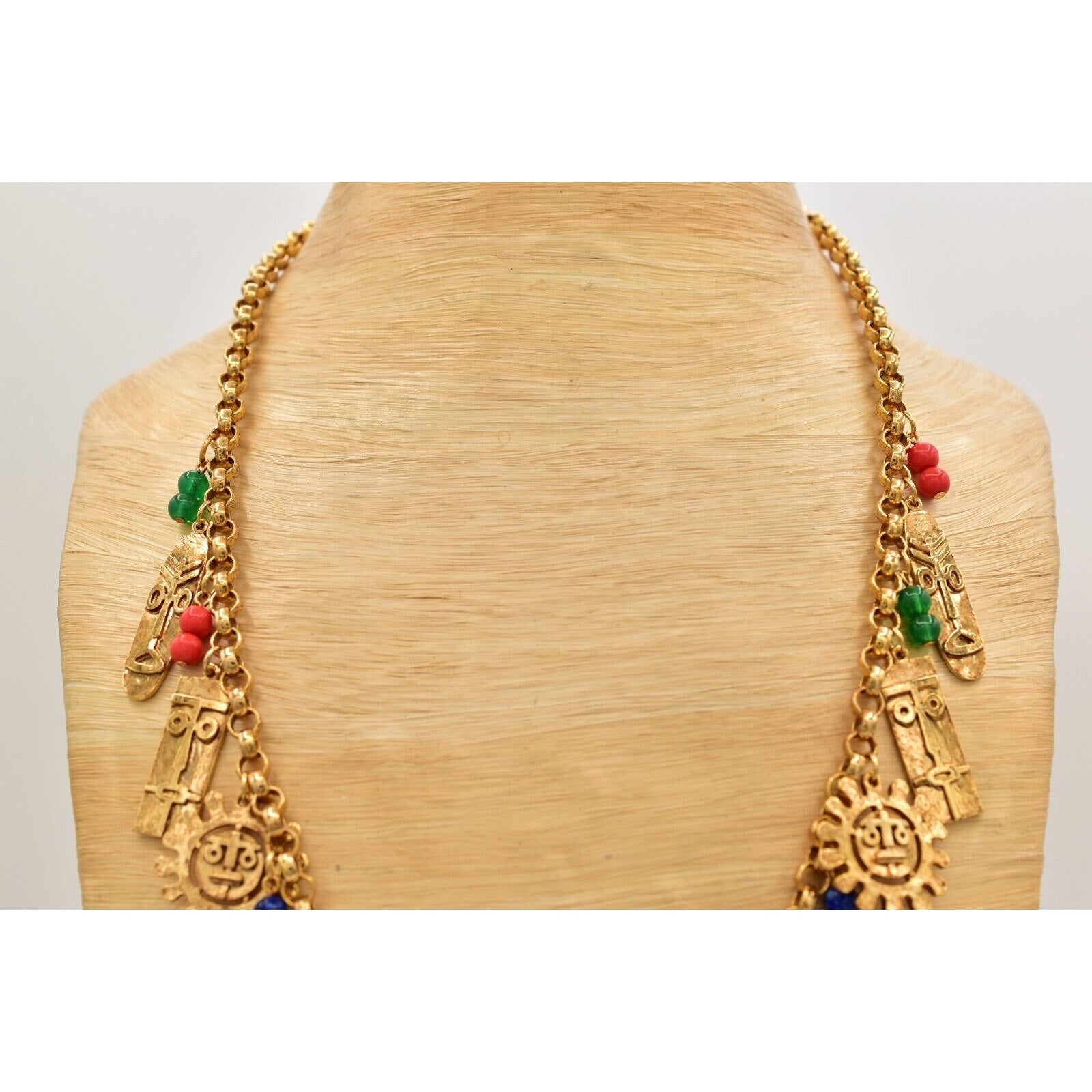 Vintage gold tone necklace featuring suns, masks, and multi-color beads.
