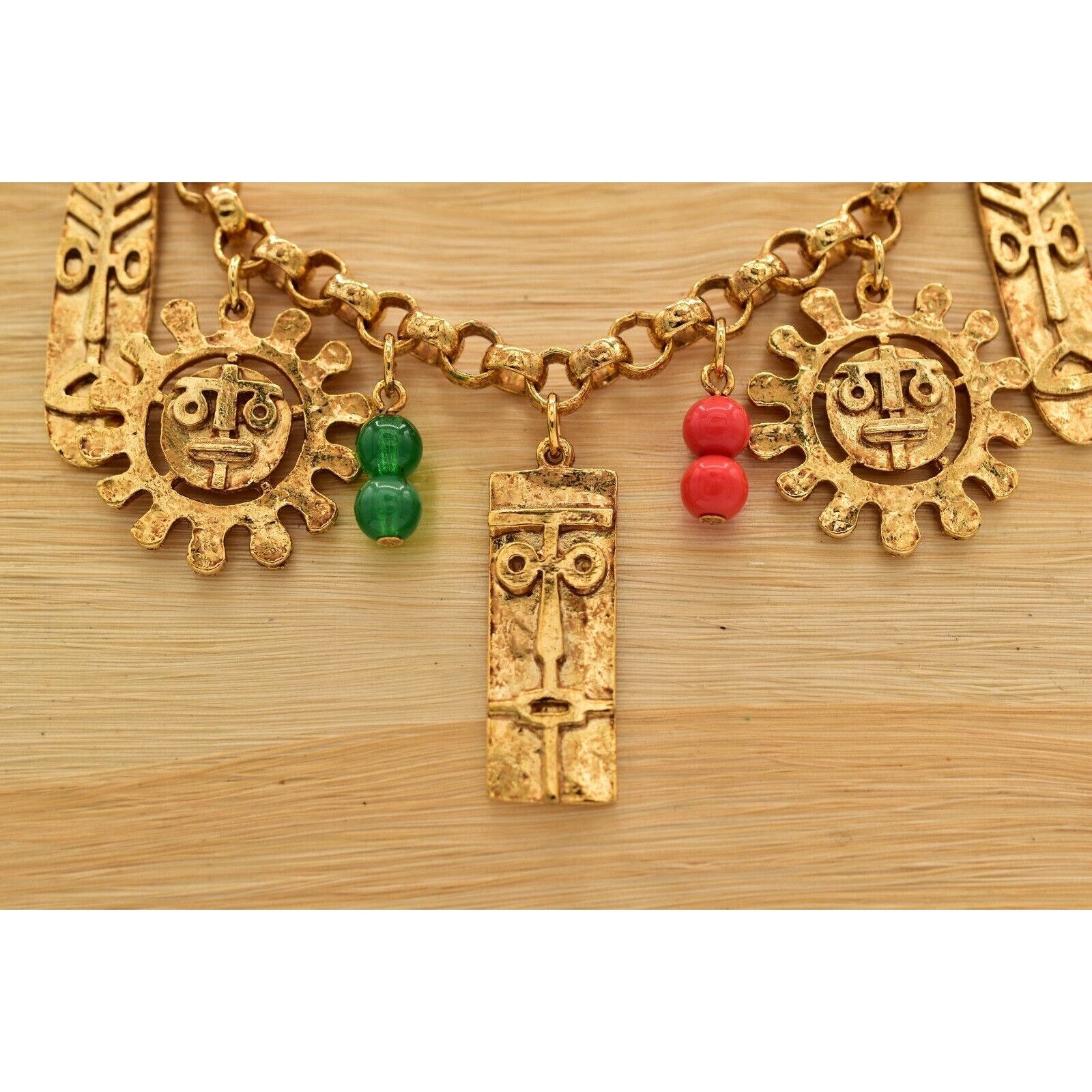 Vintage Tribal Charm Necklace Sun Tiki Mask Beaded Gold Heavy Chunky NOS BinA5