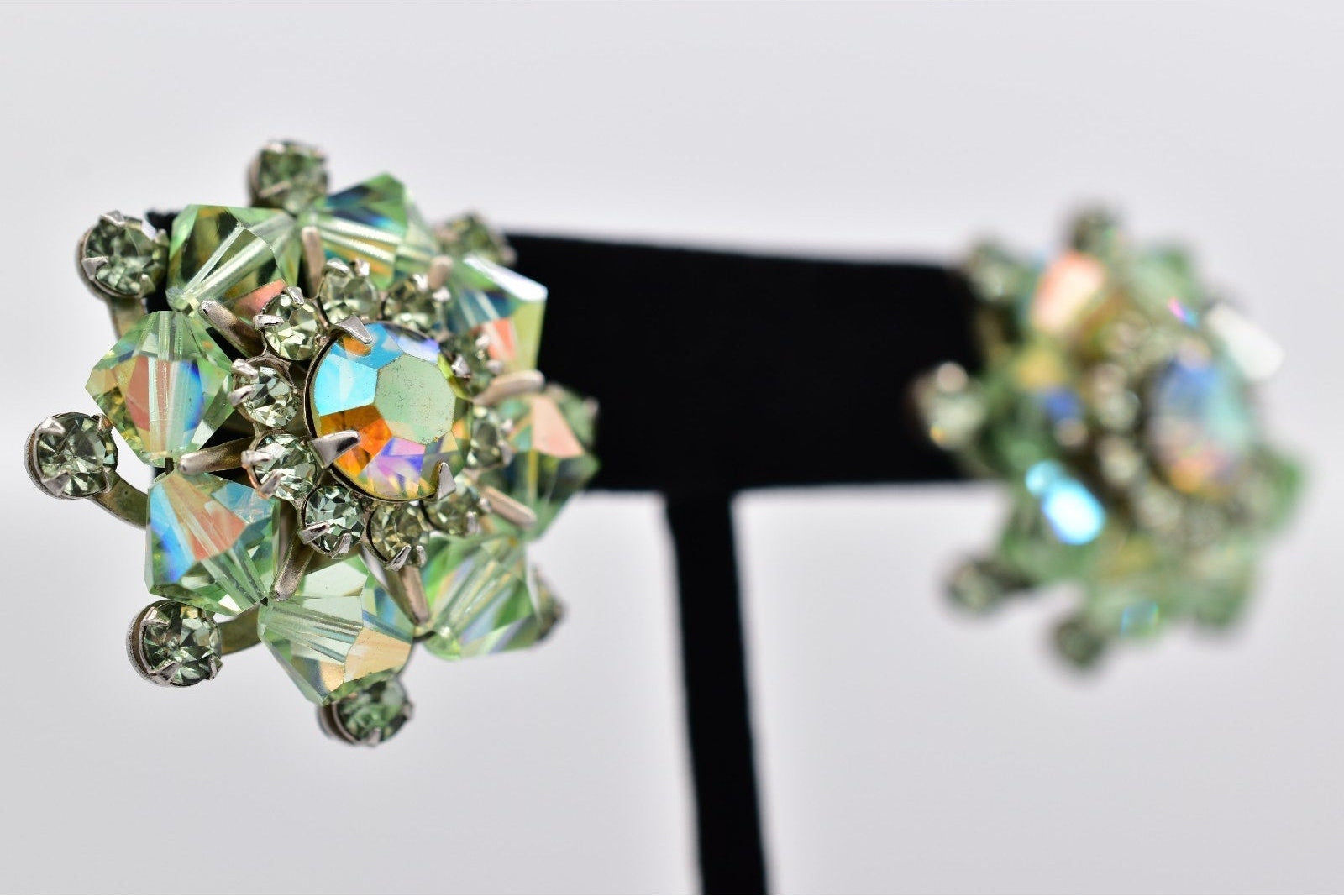 A dazzling pair of vintage WEISS clip-on earrings featuring luminous aurora borealis crystals framed by soft green faceted stones. Timeless sparkle with iconic mid-century glamour.