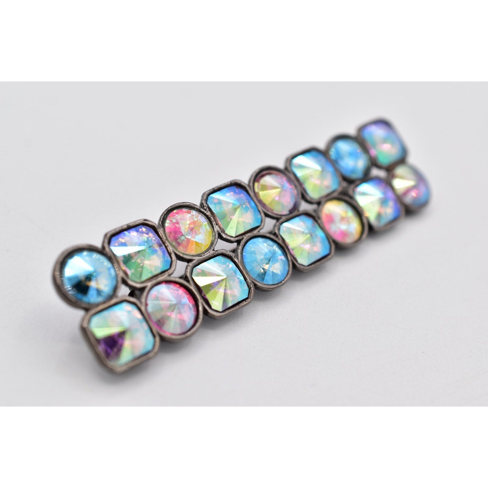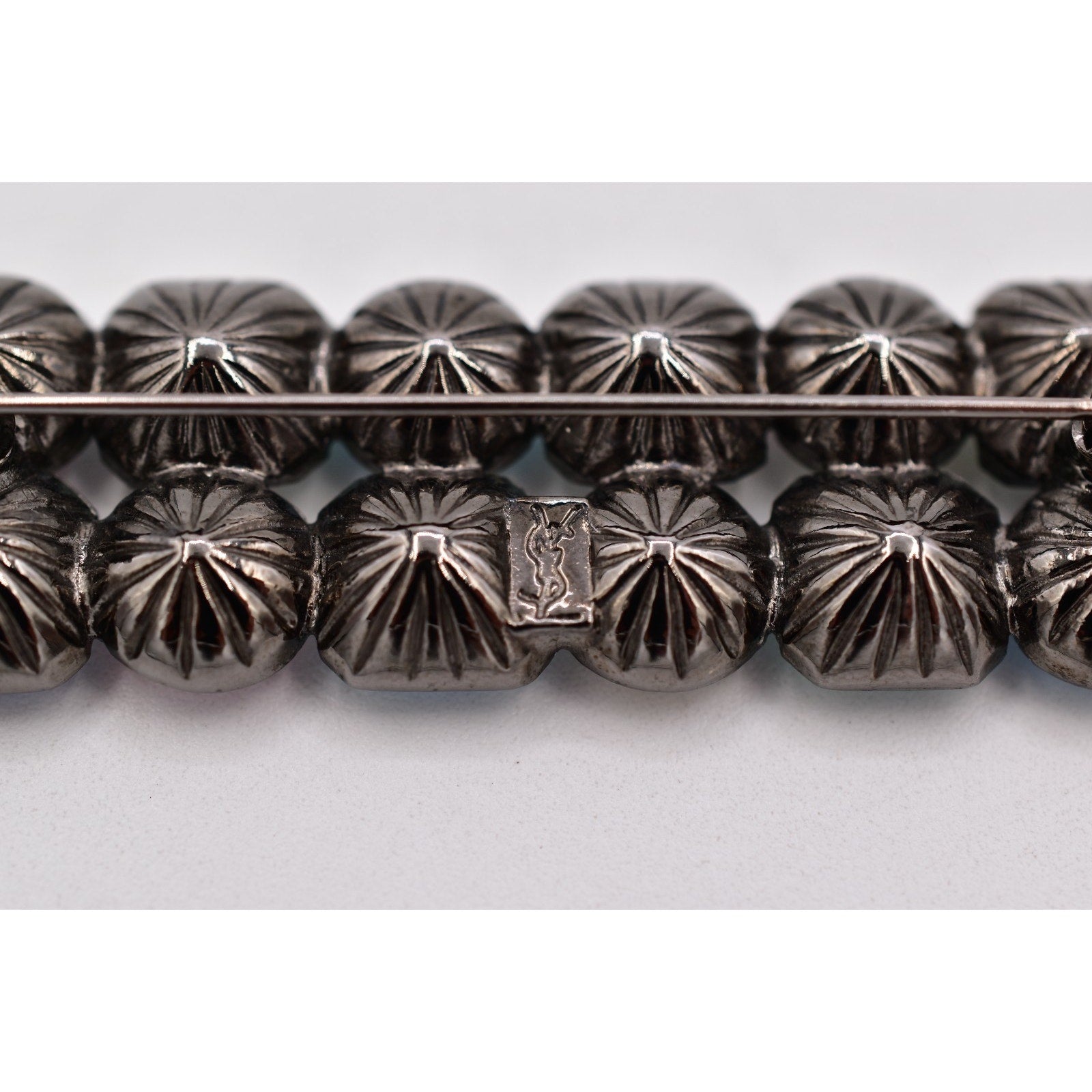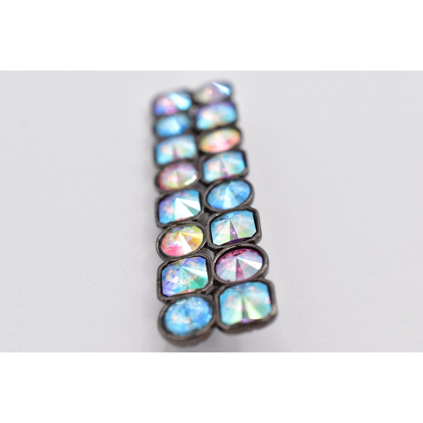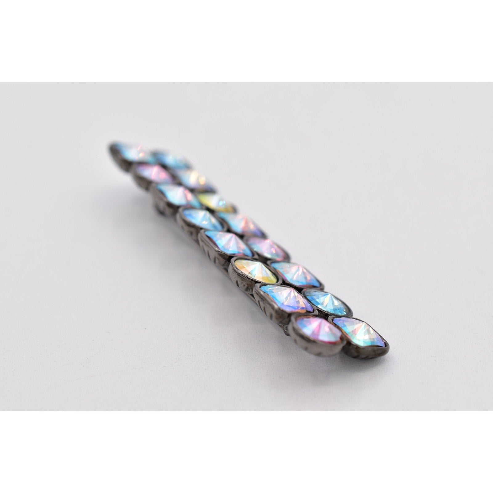 Striking vintage YSL bar brooch featuring brilliant aurora borealis rivoli crystals in a silver-tone setting. Exceptional sparkle with multi-color reflections—an iconic, glamorous Yves Saint Laurent statement piece.