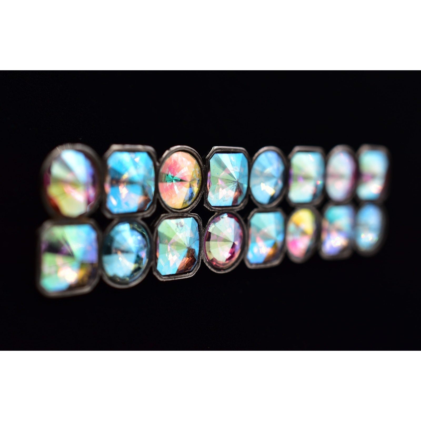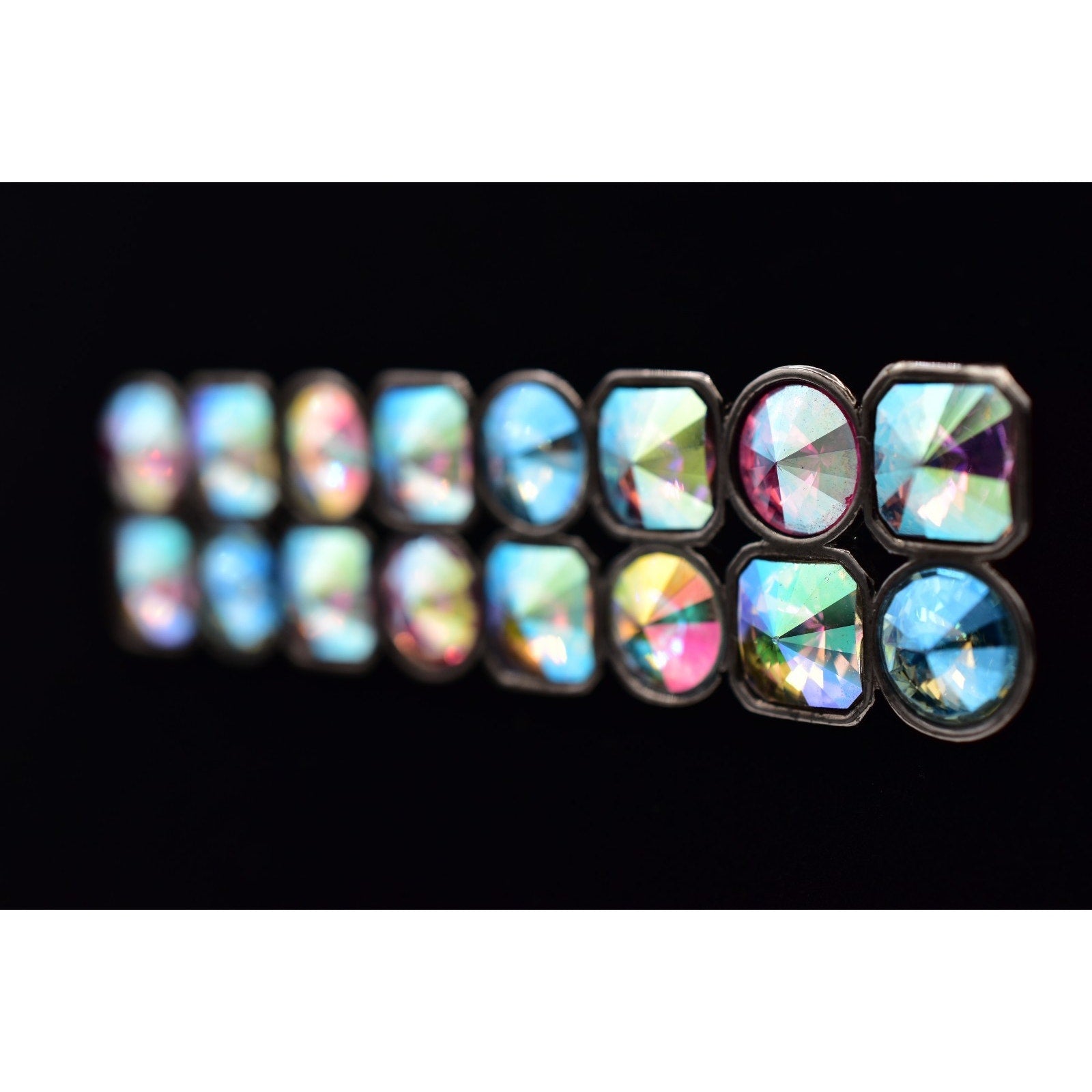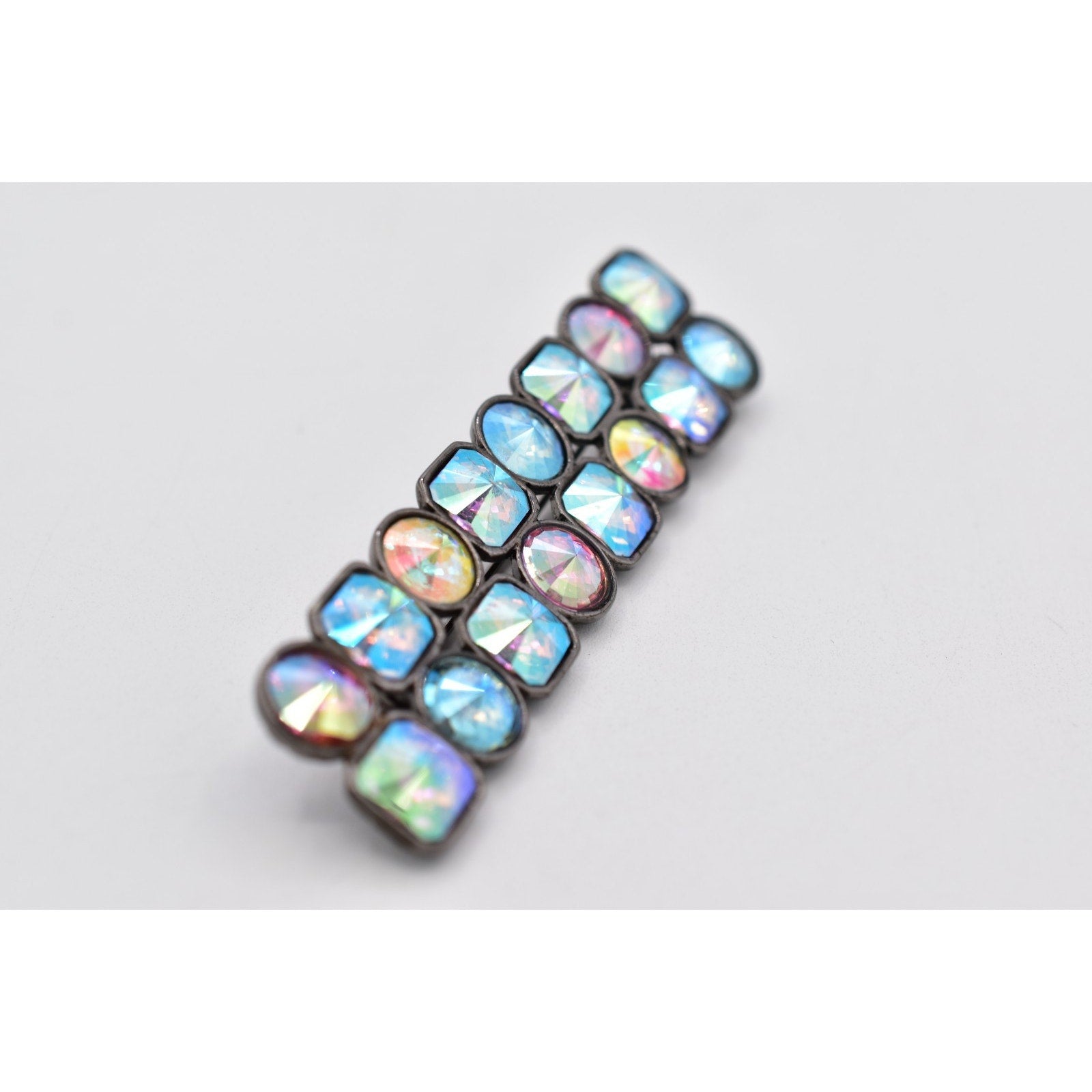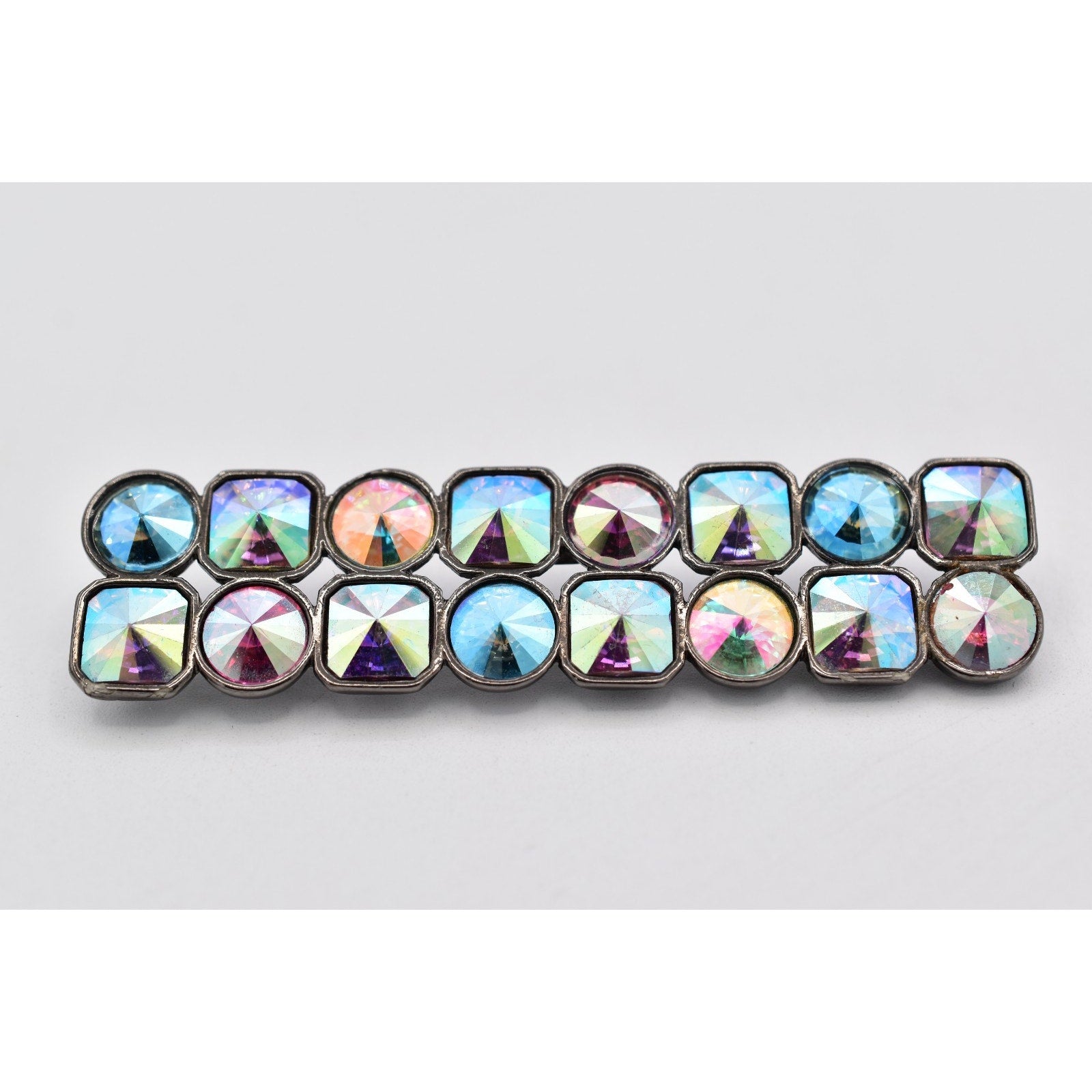 Striking vintage YSL bar brooch featuring brilliant aurora borealis rivoli crystals in a silver-tone setting. Exceptional sparkle with multi-color reflections—an iconic, glamorous Yves Saint Laurent statement piece.